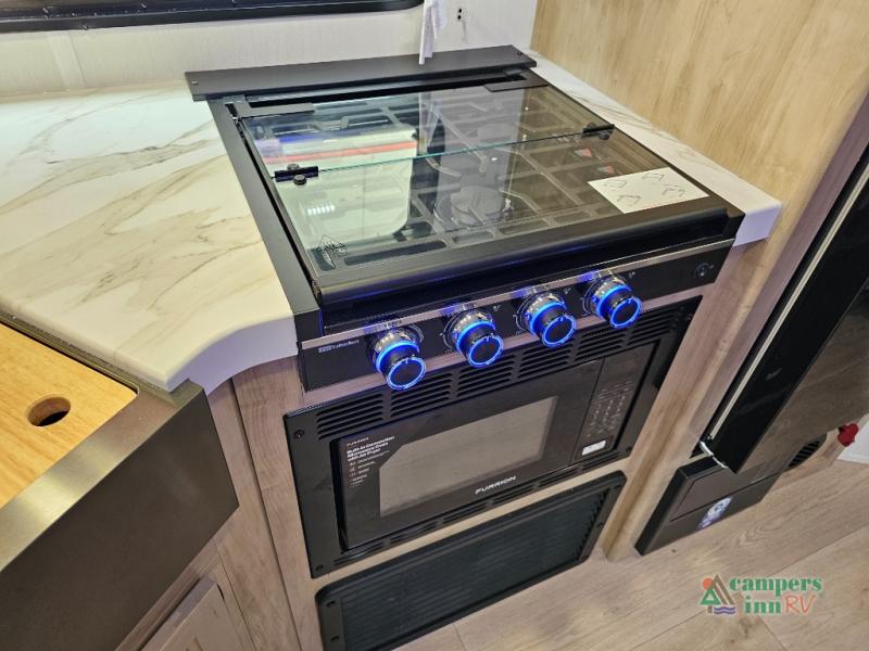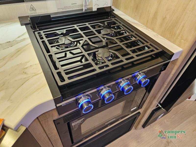 Three-burner cooktop, microwave, and large refrigerator