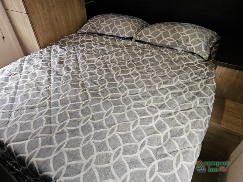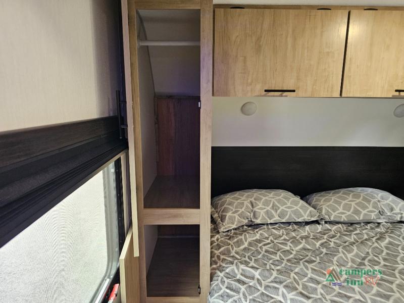 Front private bedroom with RV king bed, a wardrobe, and overhead cabinets