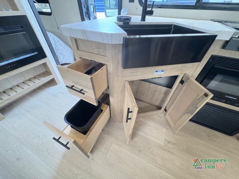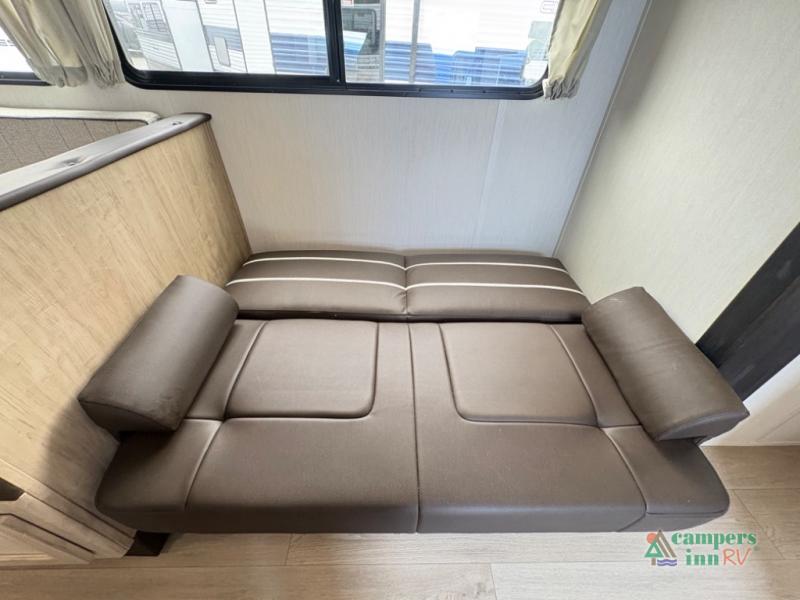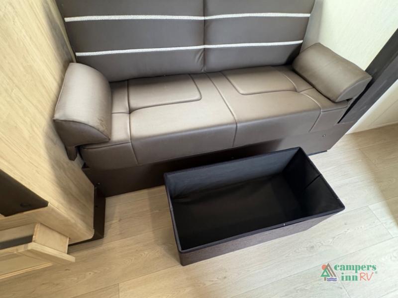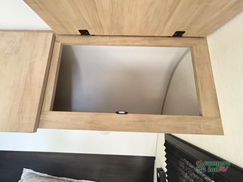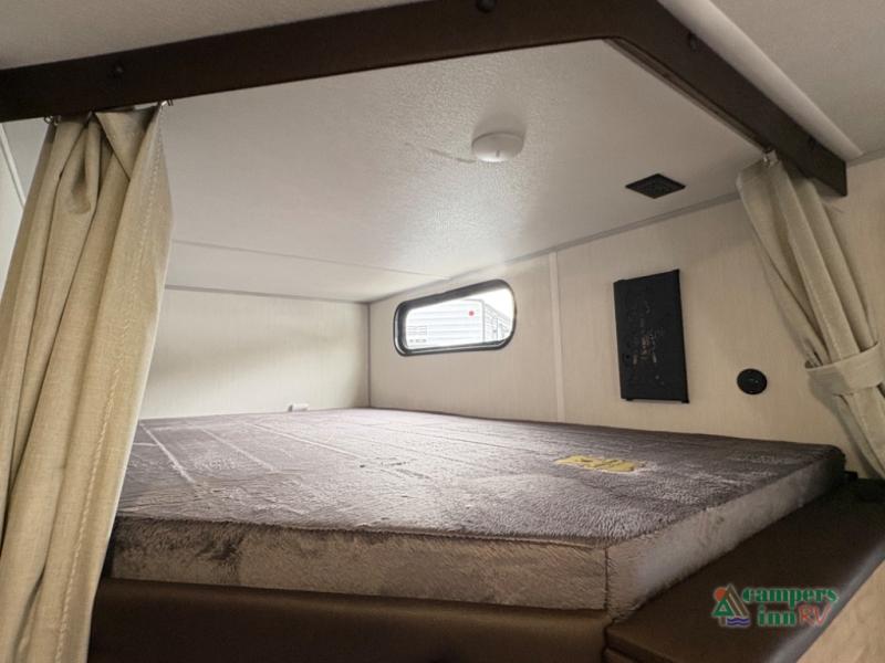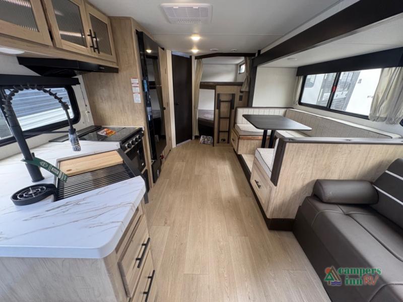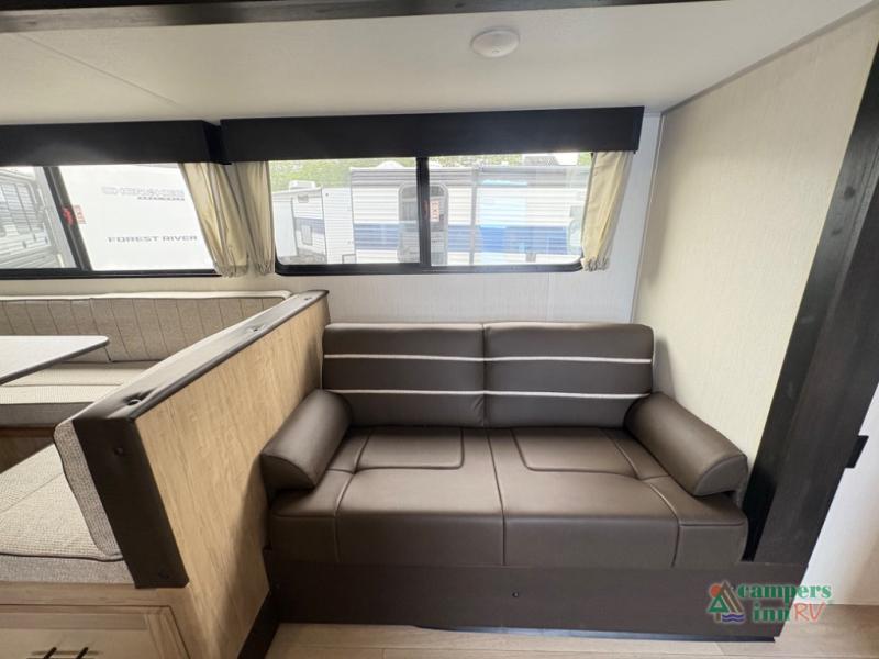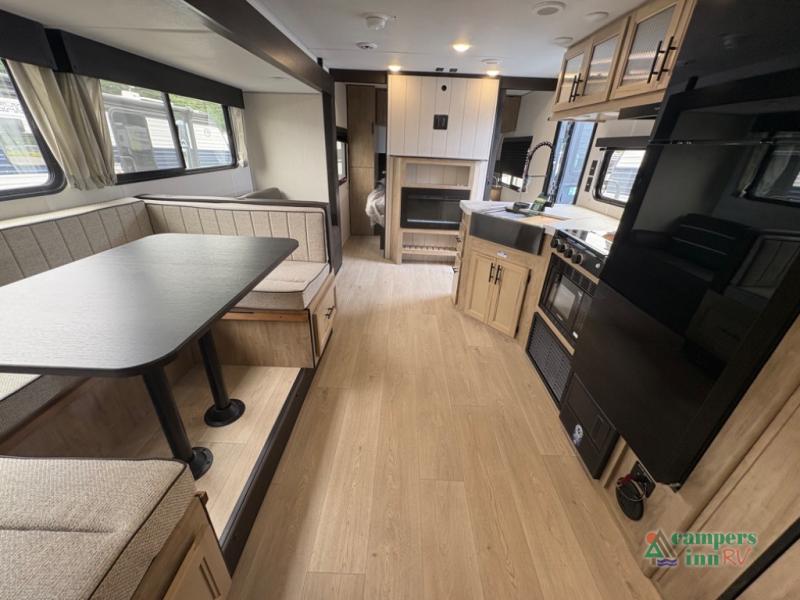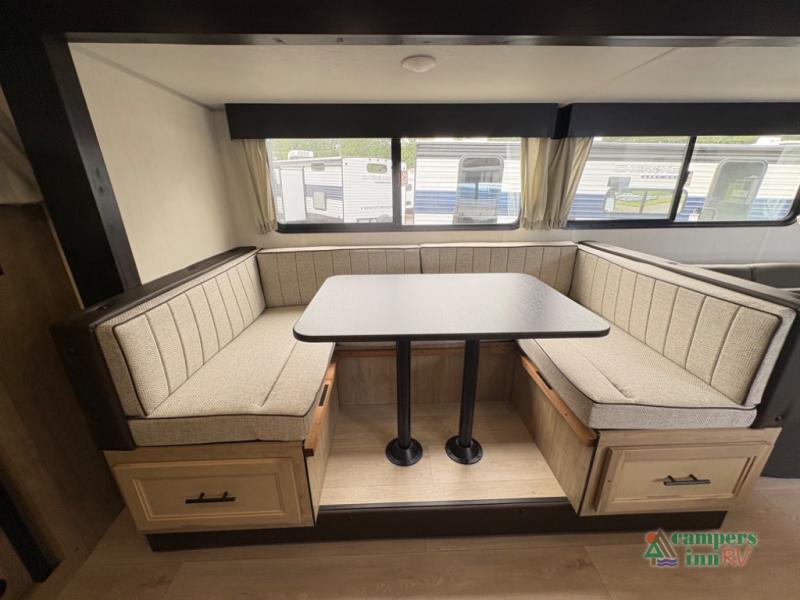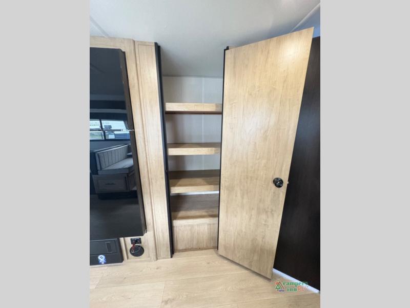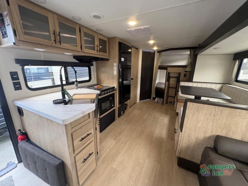 Come on inside this Cherokee Grey Wolf travel trailer and experience the convenience of a smooth flow of traffic in and out with two entry doors. The rear door leads into a full bath which is great for accessibility. Once inside, you will notice the large U-shaped dinette and the sofa which sit on the slide and create a spacious footprint for moving about, as well as great places to play games and socialize with your friends and family. A walk-in pantry provides plenty of storage allowing you to stock up on your favorite snacks and dry goods for your family adventure. At night, there is sleeping space for everyone between the double-size bunks and the RV king bed, plus the furniture.