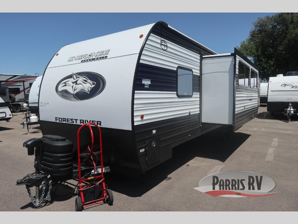 Whether it's a journey that will take you to new locations or a tried-and-true getaway to that favorite and memorable destination, the Forest River Cherokee Grey Wolf travel trailers and toy haulers are going to make the trip worth it every single time! You can travel in confidence with the premium wheel package, seamless roofing membrane with heat reflectivity, Power Gear frame technology with space-saver rail design, and Cherokee back-up camera system. The Cherokee Grey Wolf's interior is highly attractive with its stainless steel kitchen suite package and premium bedding ensemble and comforter. You will also find a black waste tank flush-out kit, an outside shower with hot and cold water, an armored underbelly tank enclosure, and an RV grill quick connect