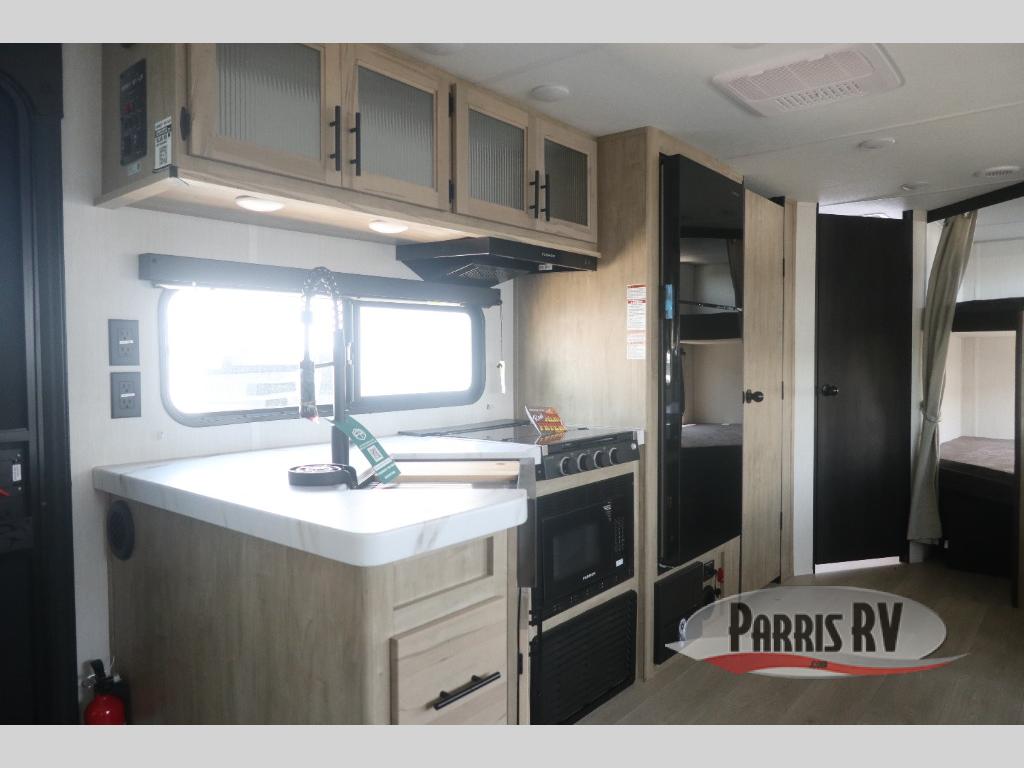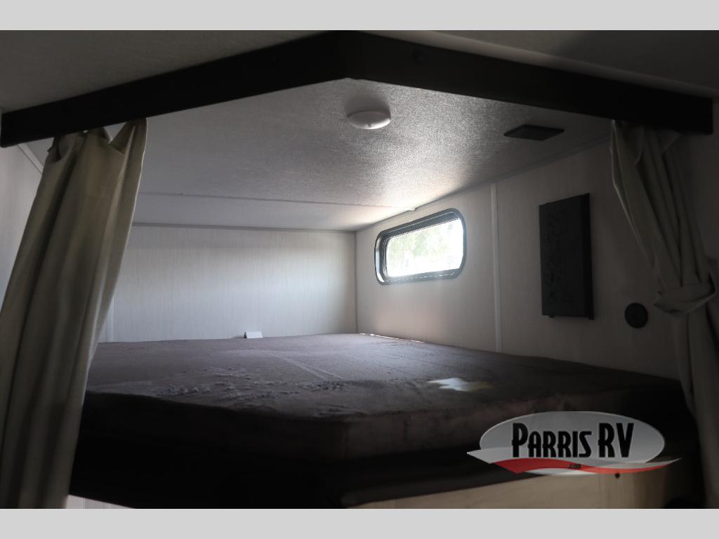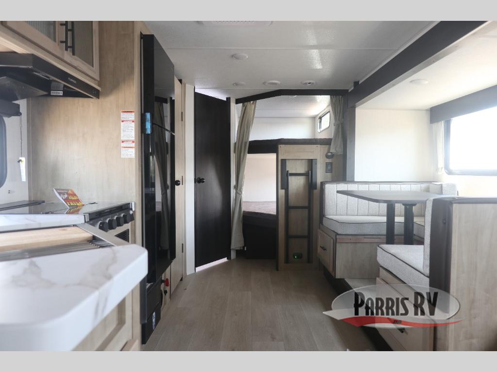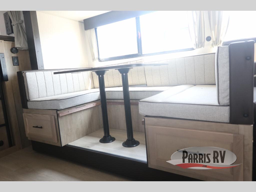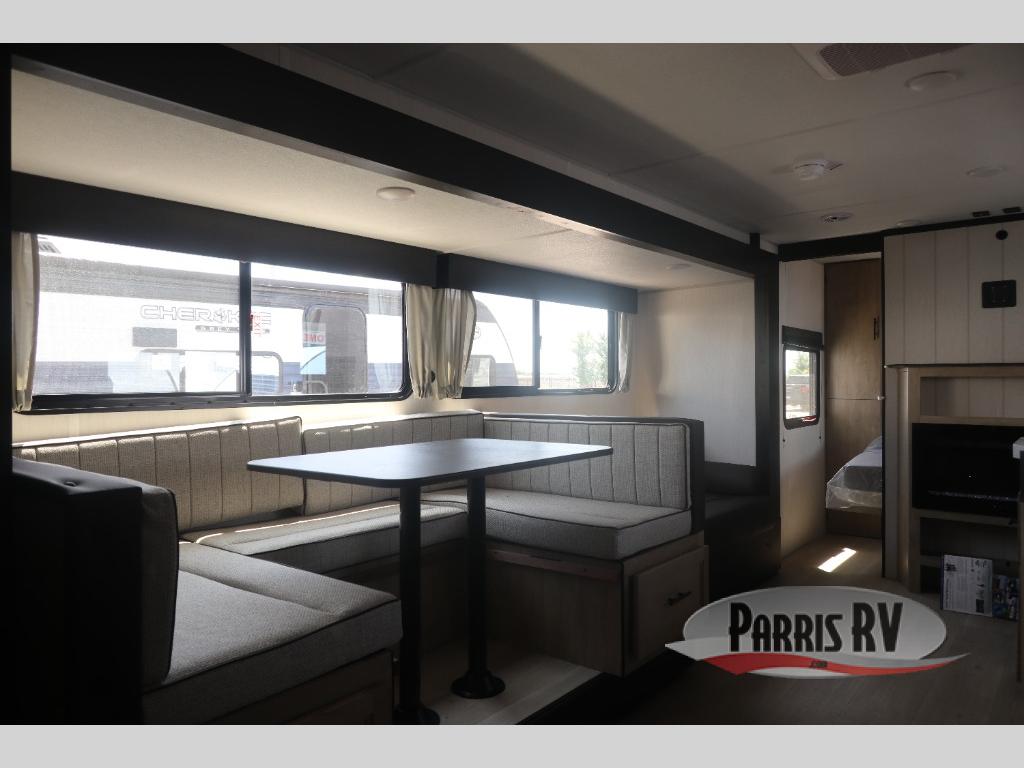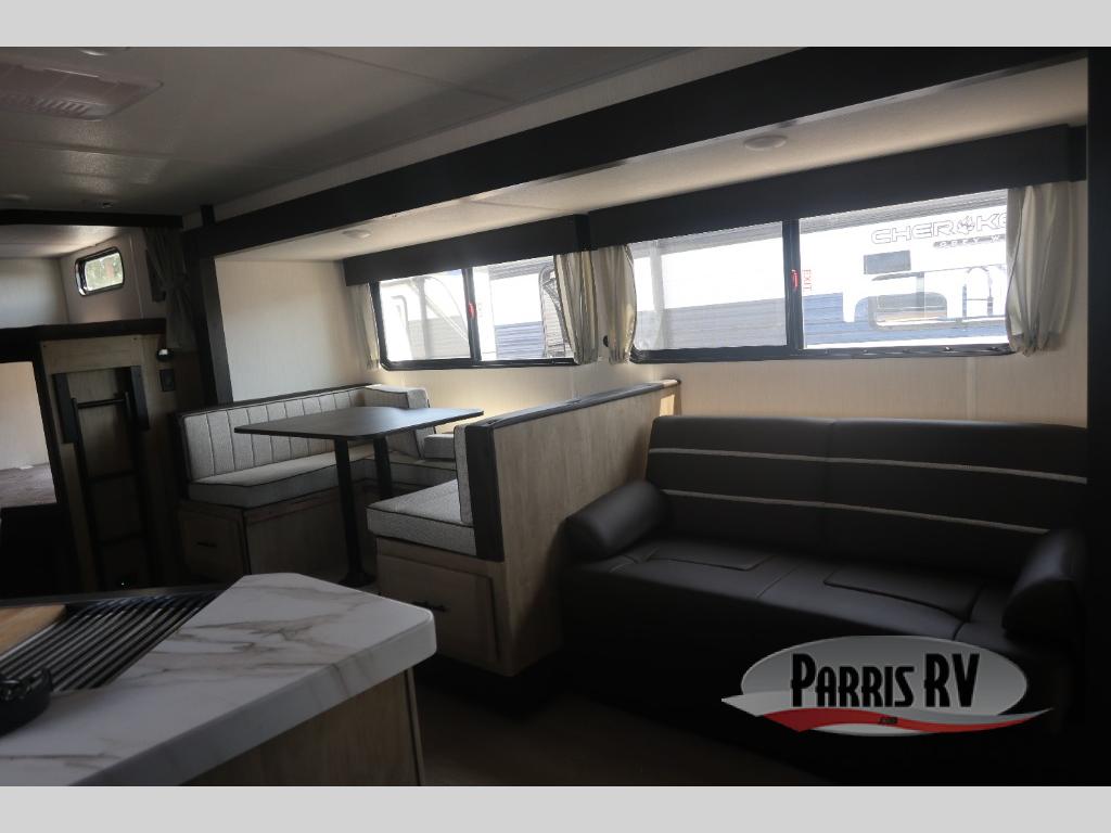 Come on inside this Cherokee Grey Wolf travel trailer and experience the convenience of a smooth flow of traffic in and out with two entry doors. The rear door leads into a full bath which is great for accessibility. Once inside, you will notice the large U-shaped dinette and the sofa which sit on the slide and create a spacious footprint for moving about, as well as great places to play games and socialize with your friends and family. A walk-in pantry provides plenty of storage allowing you to stock up on your favorite snacks and dry goods for your family adventure. At night, there is sleeping space for everyone between the double-size bunks and the RV king bed, plus the furniture.