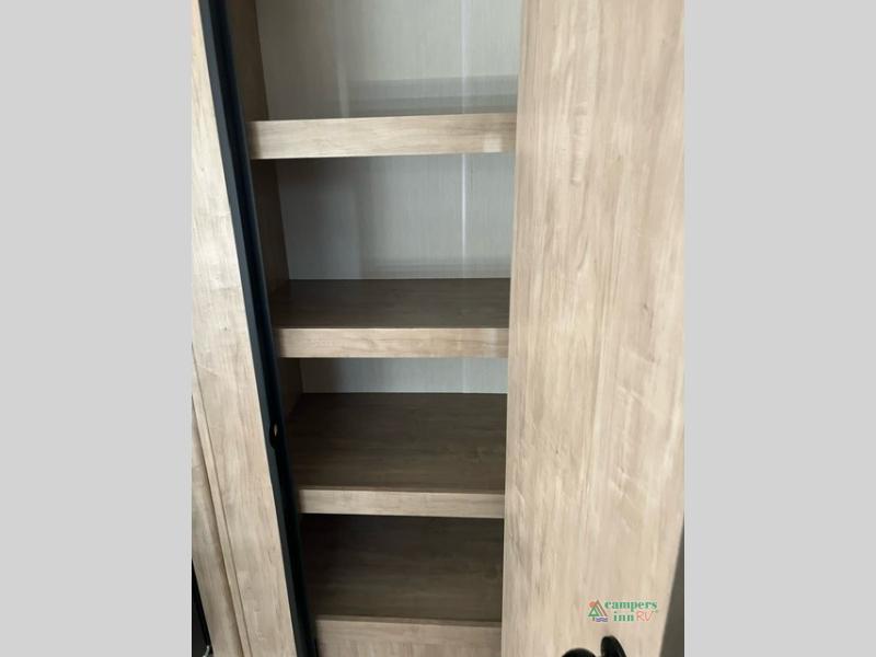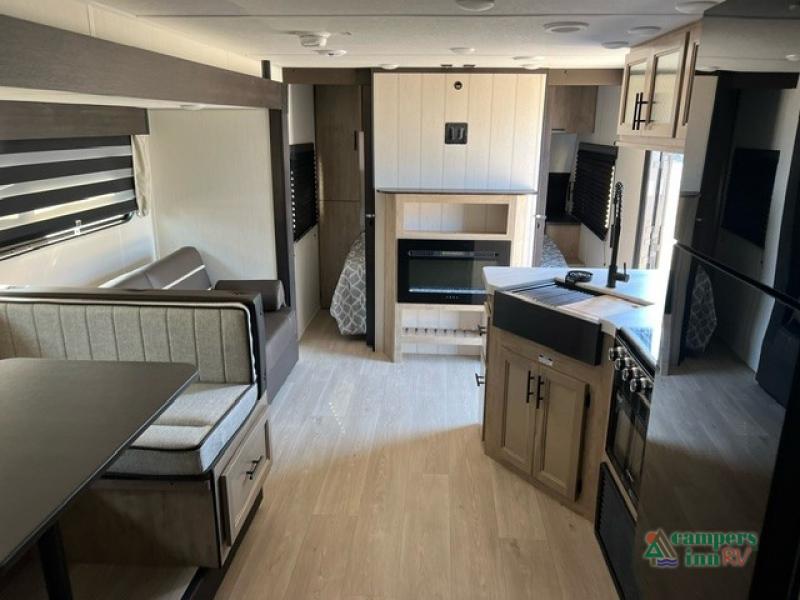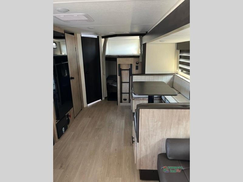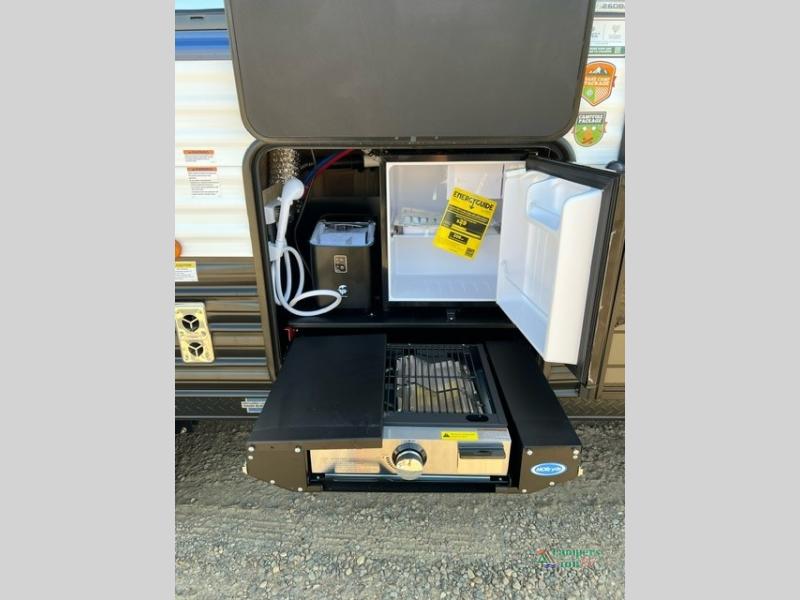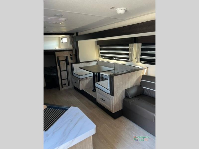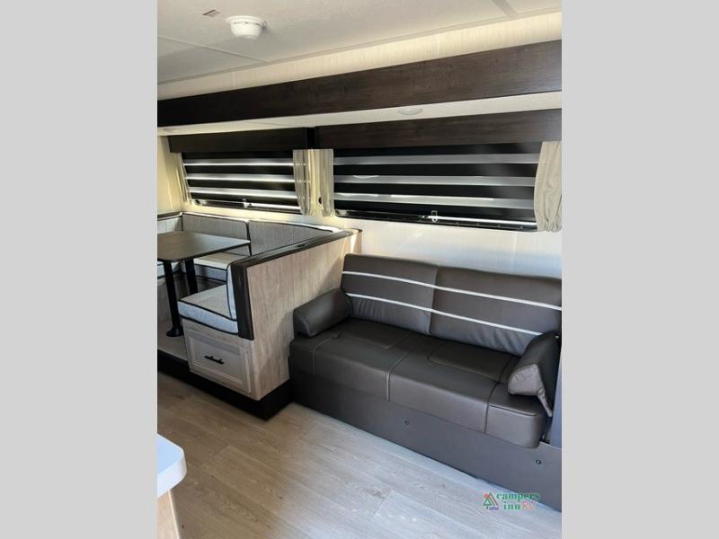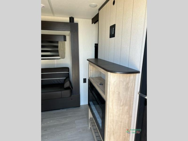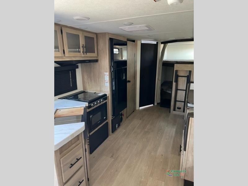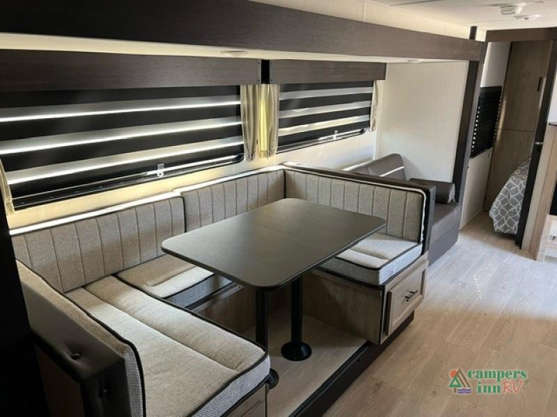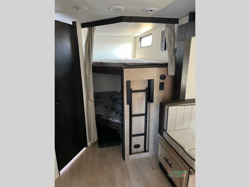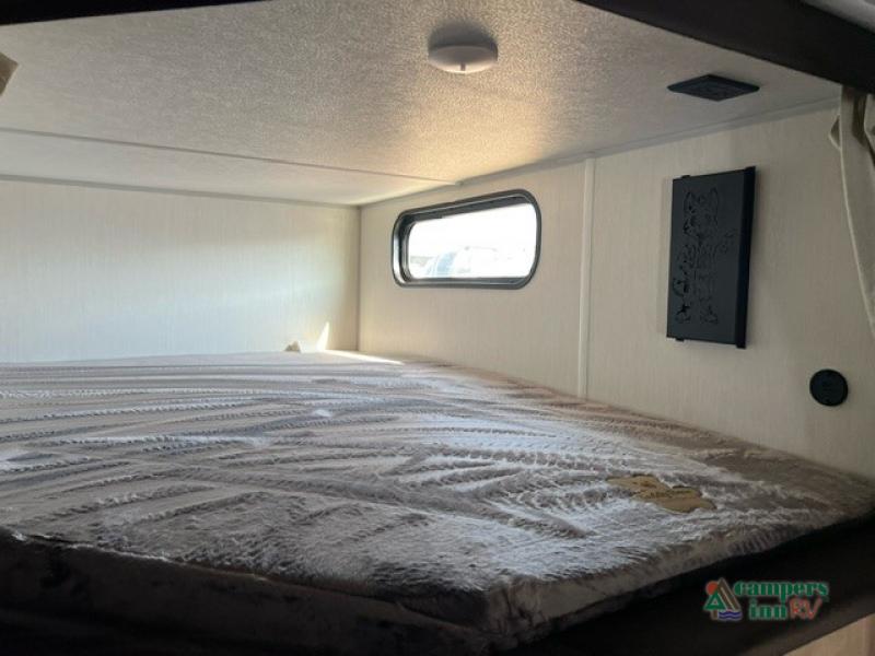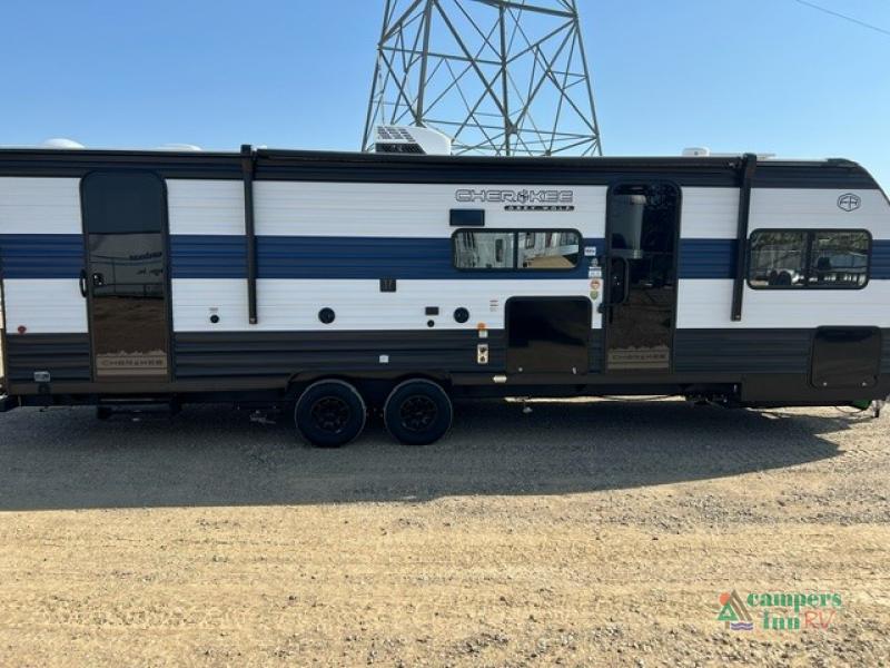 Come on inside this Cherokee Grey Wolf travel trailer and experience the convenience of a smooth flow of traffic in and out with two entry doors. The rear door leads into a full bath which is great for accessibility. Once inside, you will notice the large U-shaped dinette and the sofa which sit on the slide and create a spacious footprint for moving about, as well as great places to play games and socialize with your friends and family. A walk-in pantry provides plenty of storage allowing you to stock up on your favorite snacks and dry goods for your family adventure. At night, there is sleeping space for everyone between the double-size bunks and the RV king bed, plus the furniture.