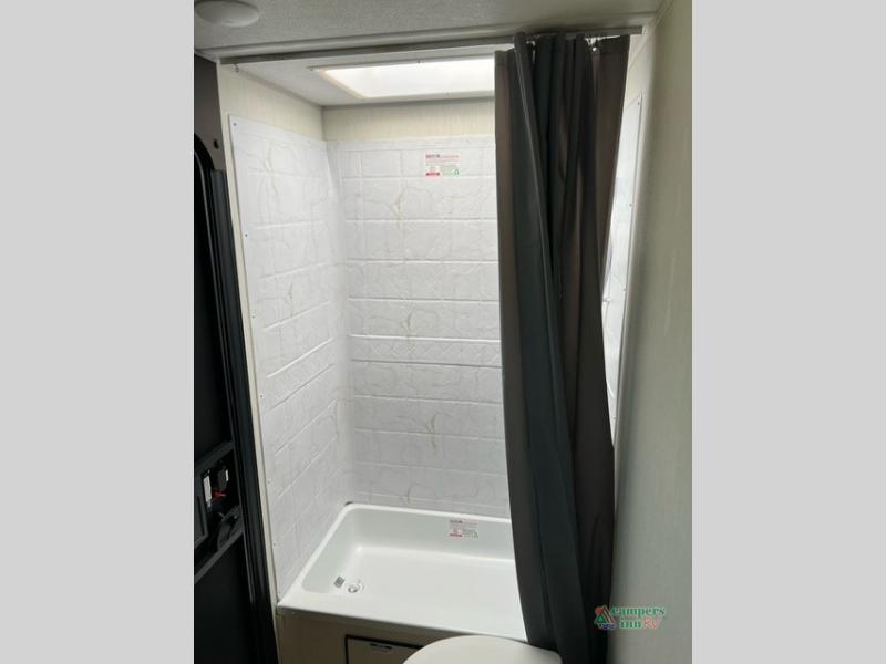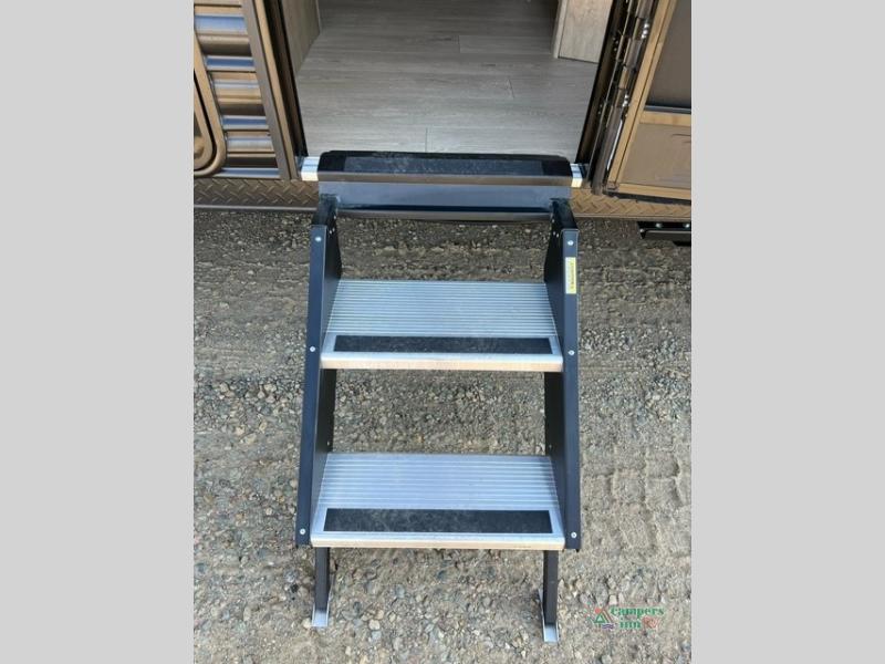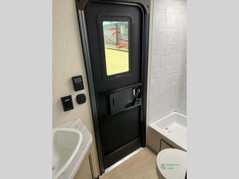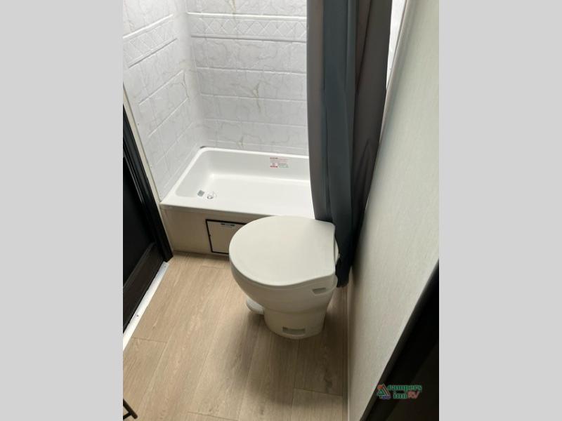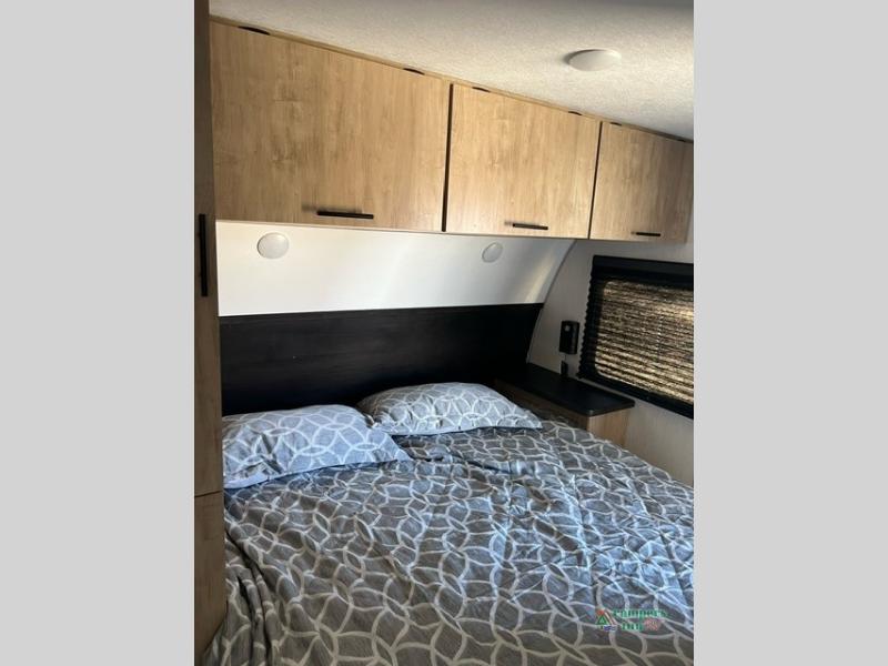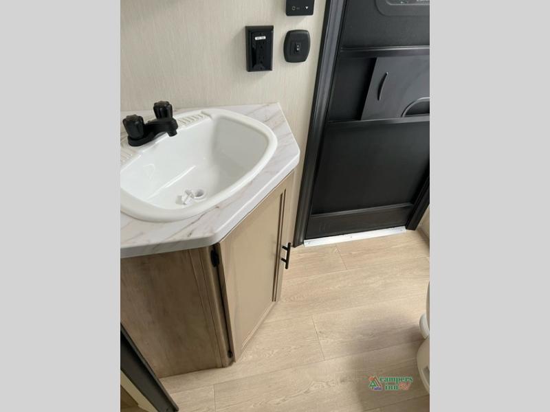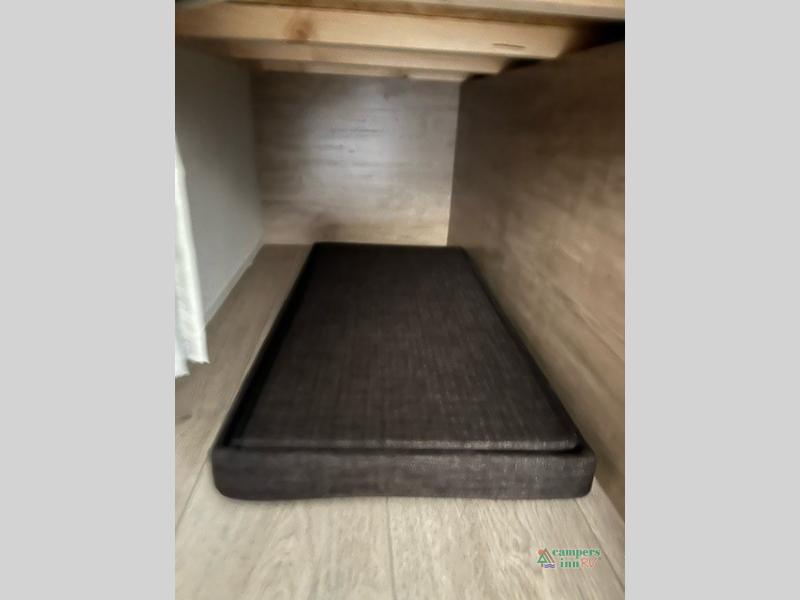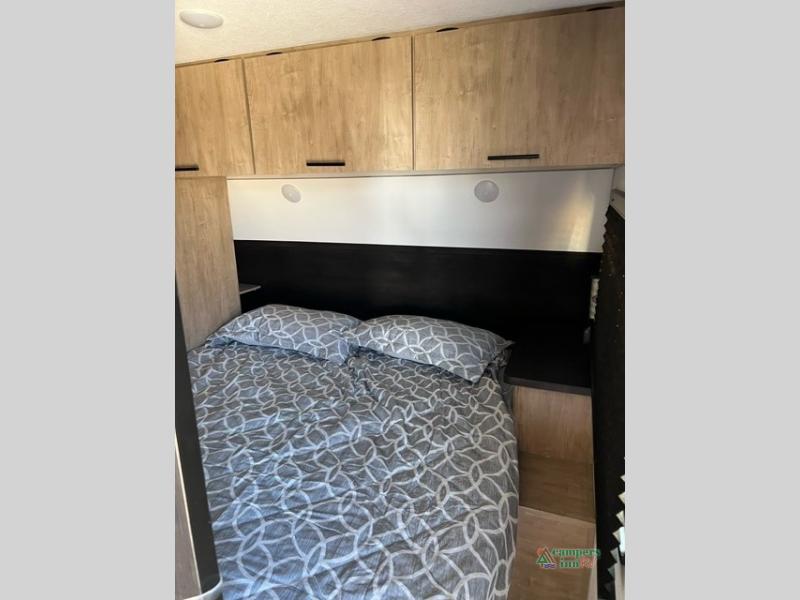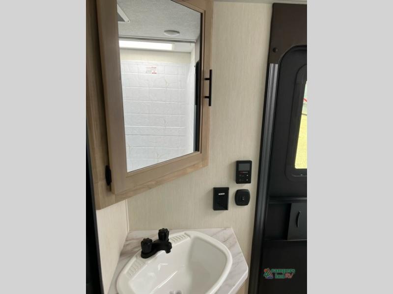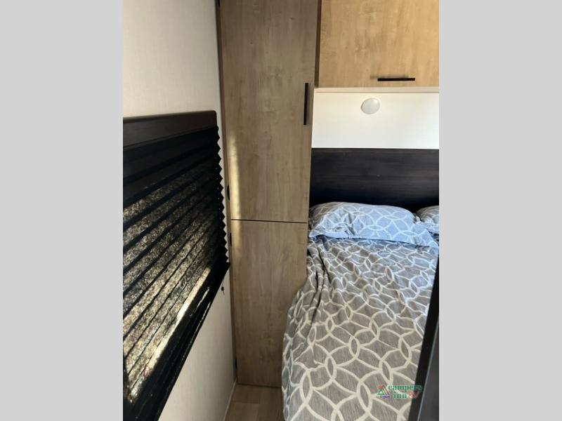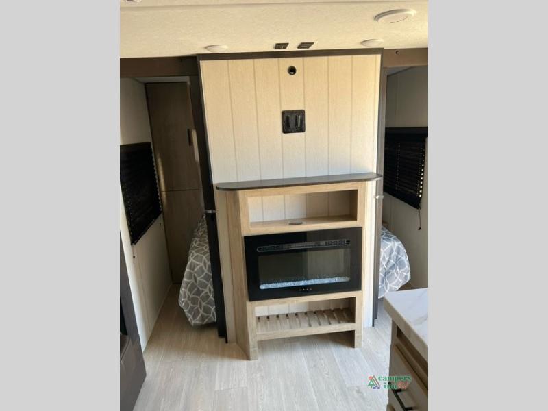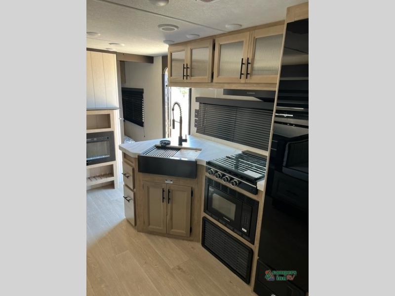 Come on inside this Cherokee Grey Wolf travel trailer and experience the convenience of a smooth flow of traffic in and out with two entry doors. The rear door leads into a full bath which is great for accessibility. Once inside, you will notice the large U-shaped dinette and the sofa which sit on the slide and create a spacious footprint for moving about, as well as great places to play games and socialize with your friends and family. A walk-in pantry provides plenty of storage allowing you to stock up on your favorite snacks and dry goods for your family adventure. At night, there is sleeping space for everyone between the double-size bunks and the RV king bed, plus the furniture.