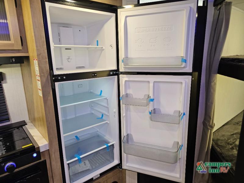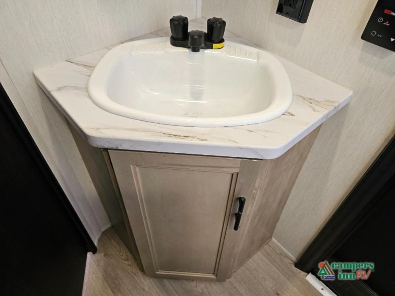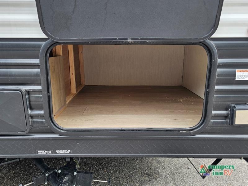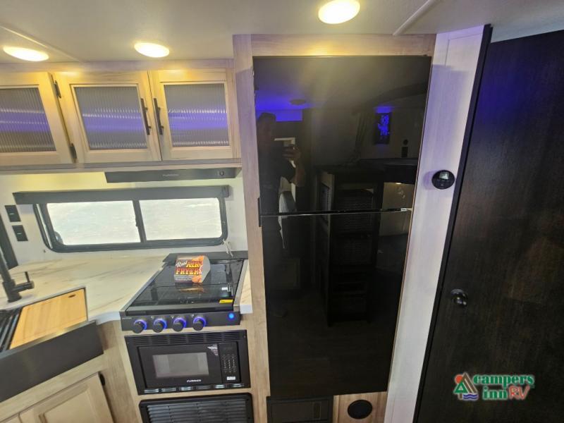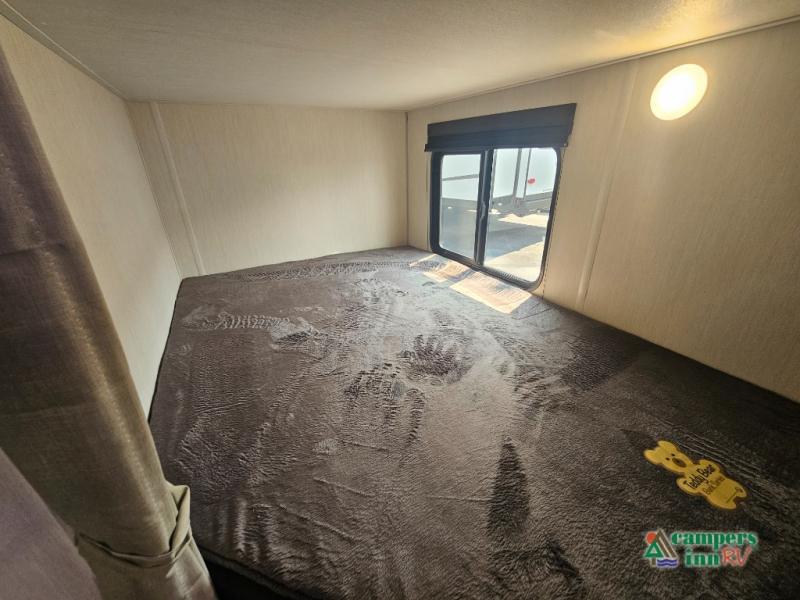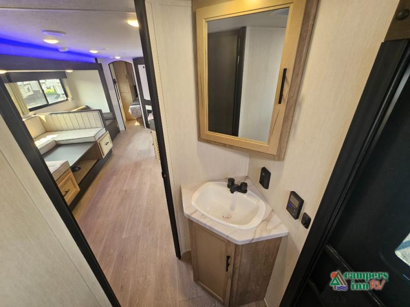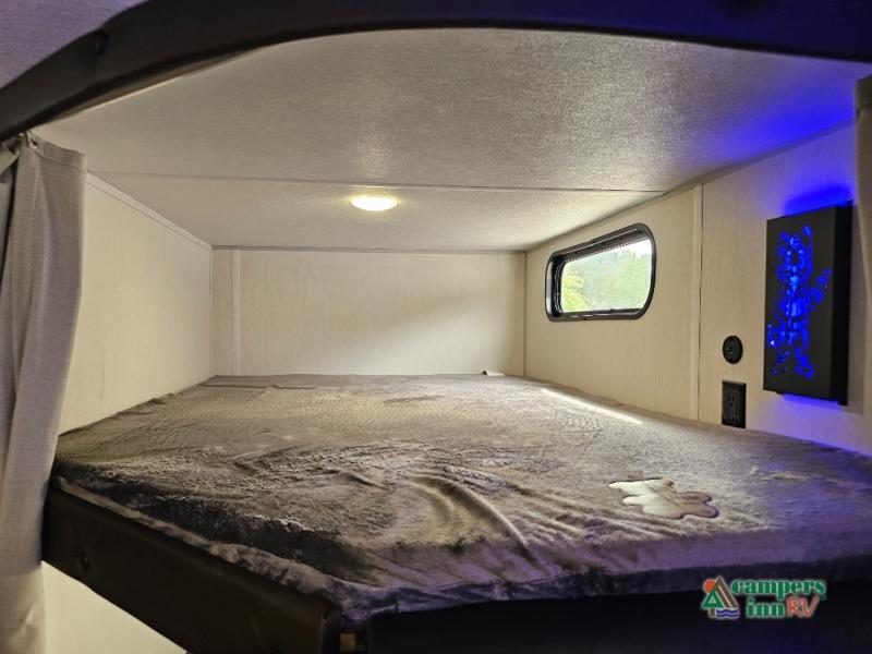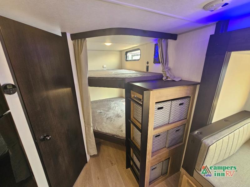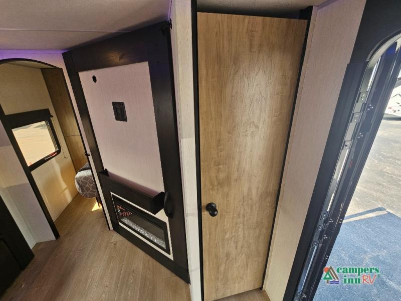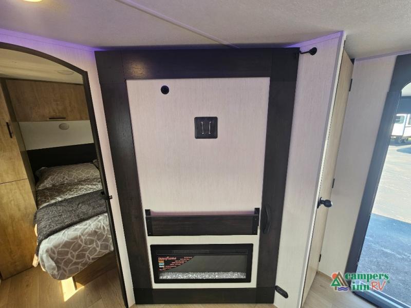 If you've been searching for a travel trailer with a larger sleeping capacity to camp with friends, this is the one! There are double-size bunks in the rear corner, and the full bath with its own exterior entry door is in the other rear corner for easy nighttime use. Up front, an RV king bed in the private bedroom is sure to bring a great night's rest, and you'll find a bedside wardrobe to keep your clothes picked up off of the floor. In the morning, everyone can meet in the main living room that includes a large slide out, U-shaped dinette, sofa, and a fireplace with a hidden pantry behind it for smart storage solutions. An outside kitchen will allow you to get some fresh air as you make dinner, but there's also a full interior kitchen if the weather isn't cooperating. Additional outdoor features include a rear storage rack, an outside TV mount, and a 15' awning for some shade!