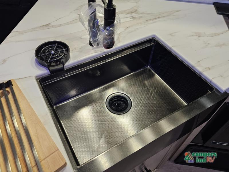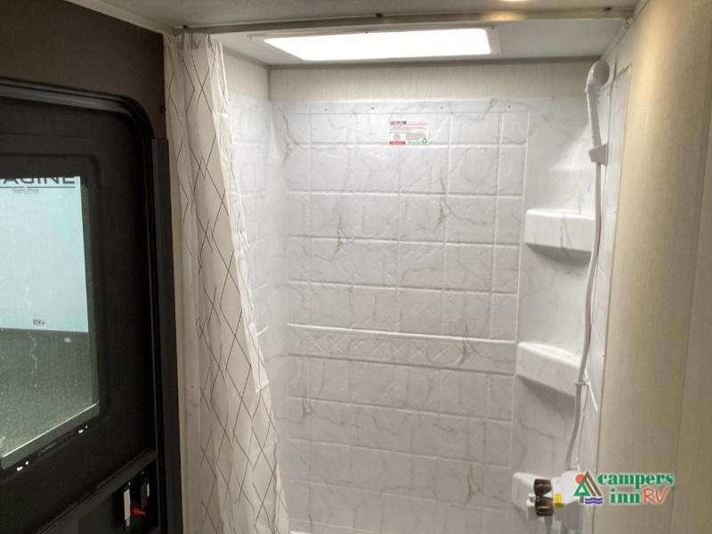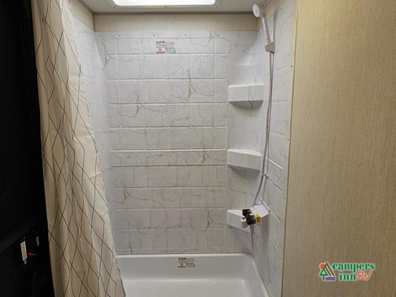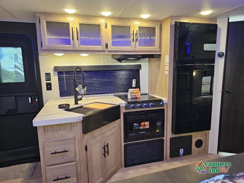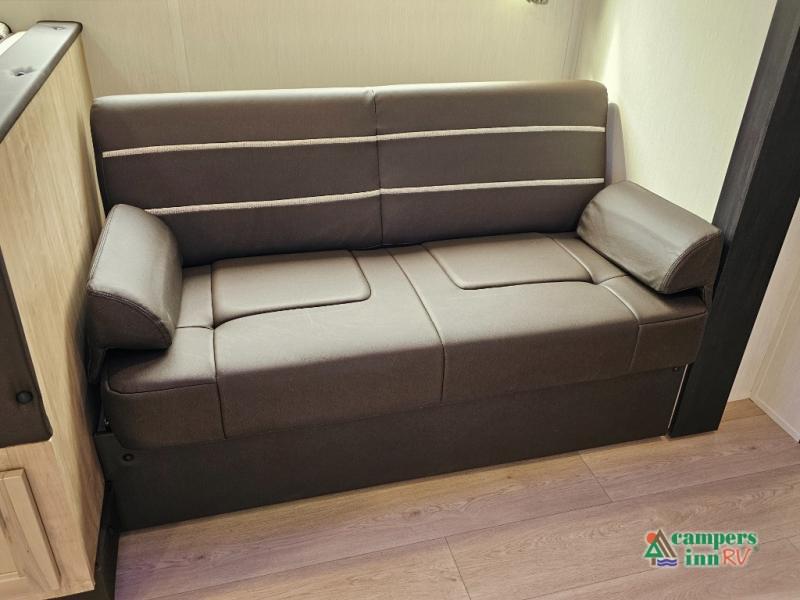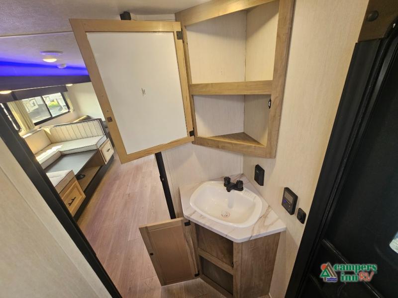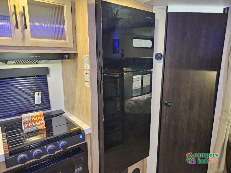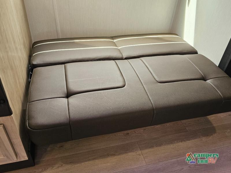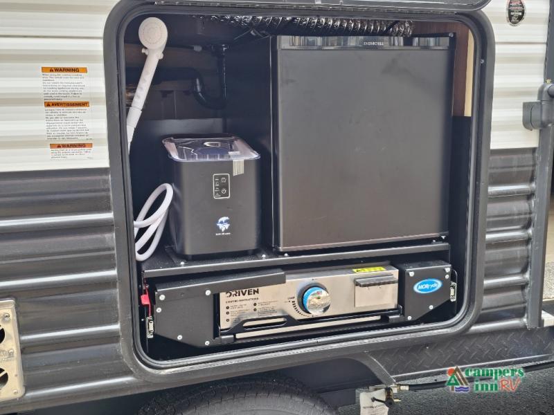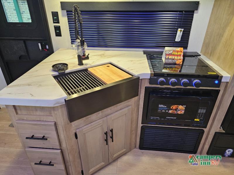 If you've been searching for a travel trailer with a larger sleeping capacity to camp with friends, this is the one! There are double-size bunks in the rear corner, and the full bath with its own exterior entry door is in the other rear corner for easy nighttime use. Up front, an RV king bed in the private bedroom is sure to bring a great night's rest, and you'll find a bedside wardrobe to keep your clothes picked up off of the floor. In the morning, everyone can meet in the main living room that includes a large slide out, U-shaped dinette, sofa, and a fireplace with a hidden pantry behind it for smart storage solutions. An outside kitchen will allow you to get some fresh air as you make dinner, but there's also a full interior kitchen if the weather isn't cooperating. Additional outdoor features include a rear storage rack, an outside TV mount, and a 15' awning for some shade!