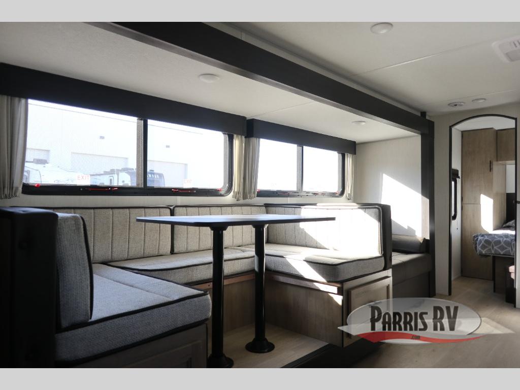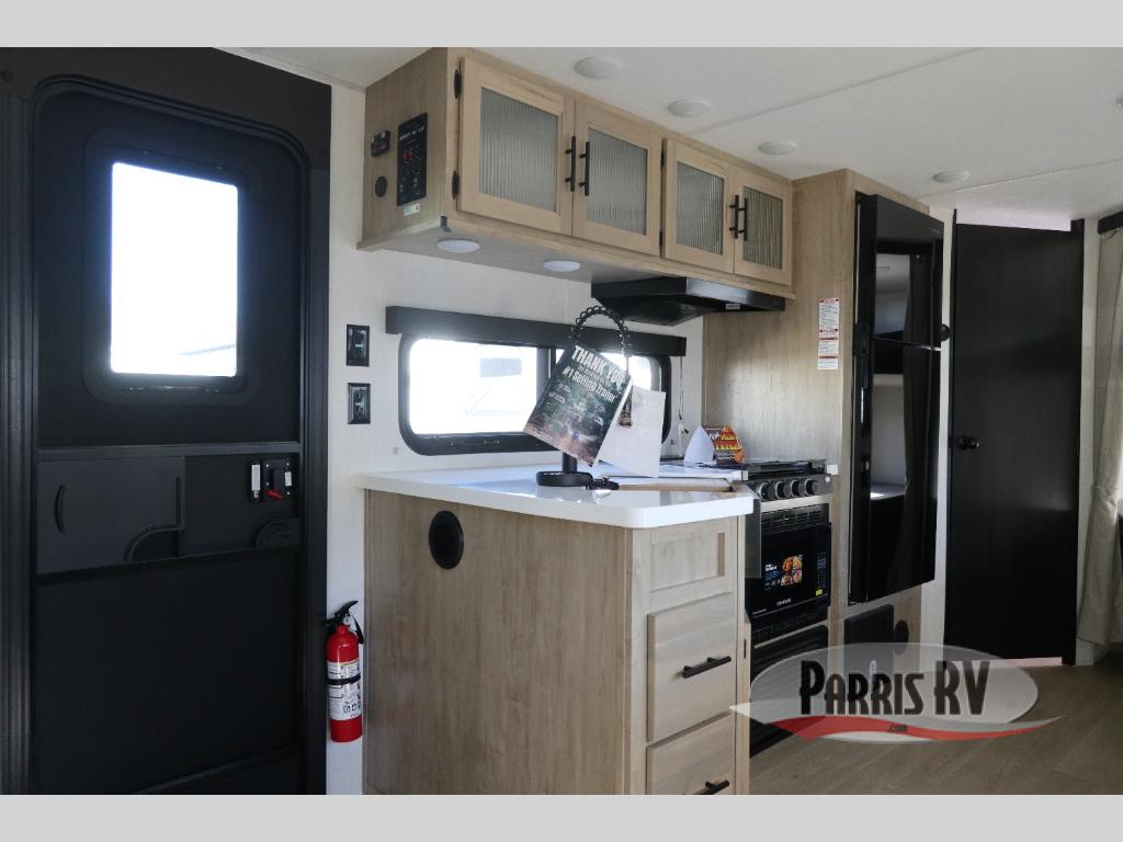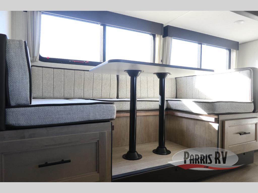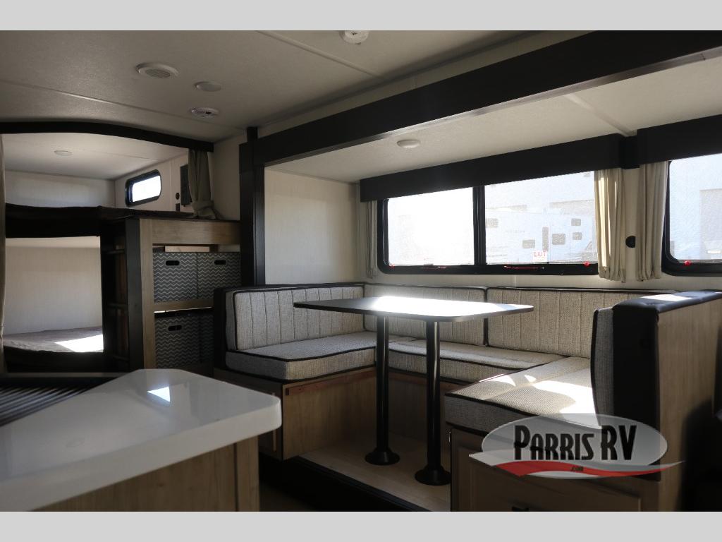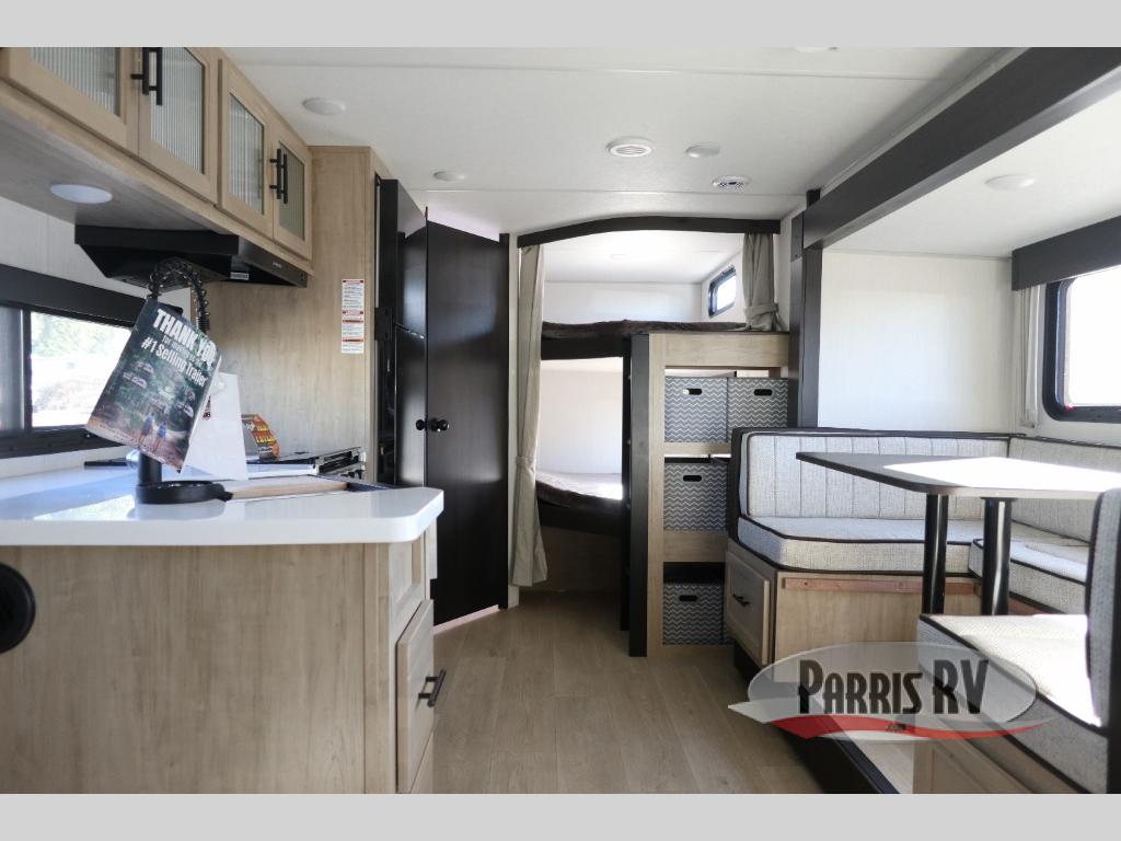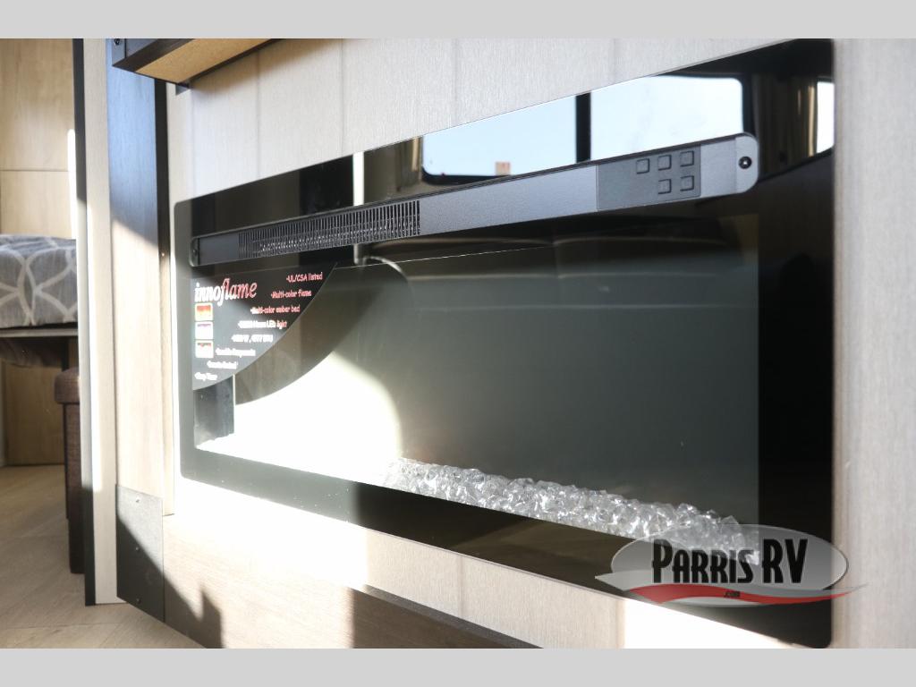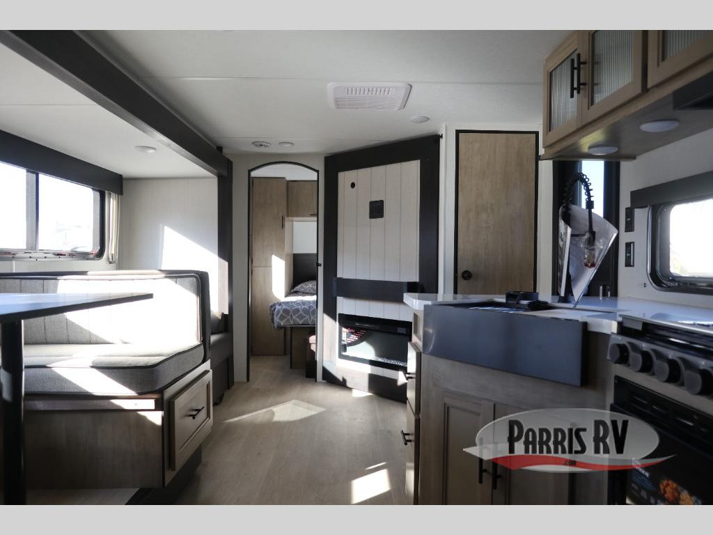 If you've been searching for a travel trailer with a larger sleeping capacity to camp with friends, this is the one! There are double-size bunks in the rear corner, and the full bath with its own exterior entry door is in the other rear corner for easy nighttime use. Up front, an RV king bed in the private bedroom is sure to bring a great night's rest, and you'll find a bedside wardrobe to keep your clothes picked up off of the floor. In the morning, everyone can meet in the main living room that includes a large slide out, U-shaped dinette, sofa, and a fireplace with a hidden pantry behind it for smart storage solutions. An outside kitchen will allow you to get some fresh air as you make dinner, but there's also a full interior kitchen if the weather isn't cooperating. Additional outdoor features include a rear storage rack, an outside TV mount, and a 15' awning for some shade!