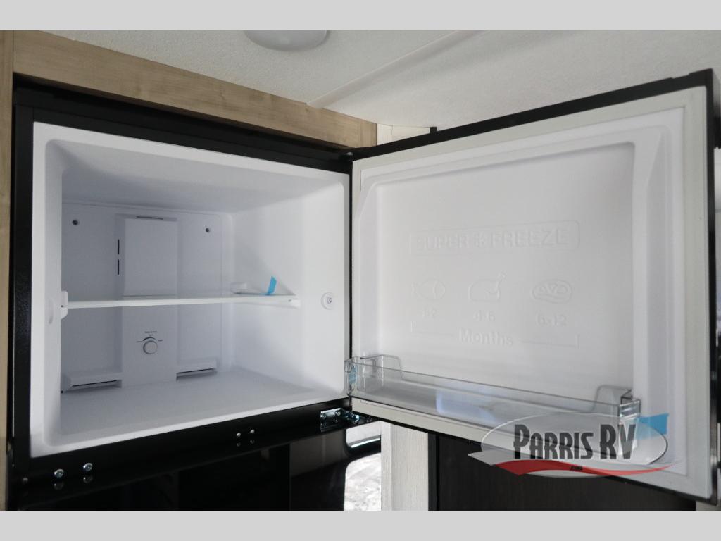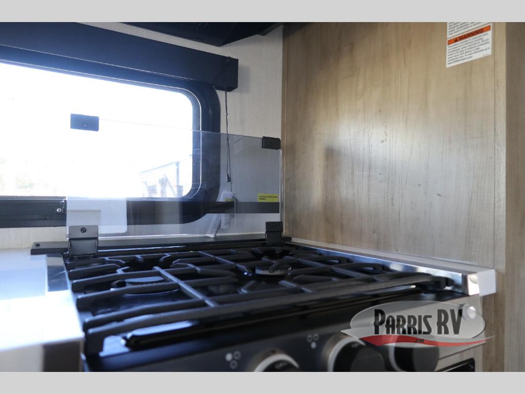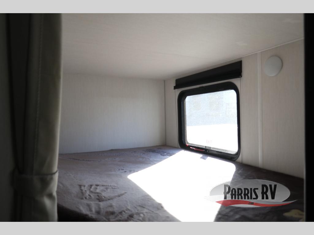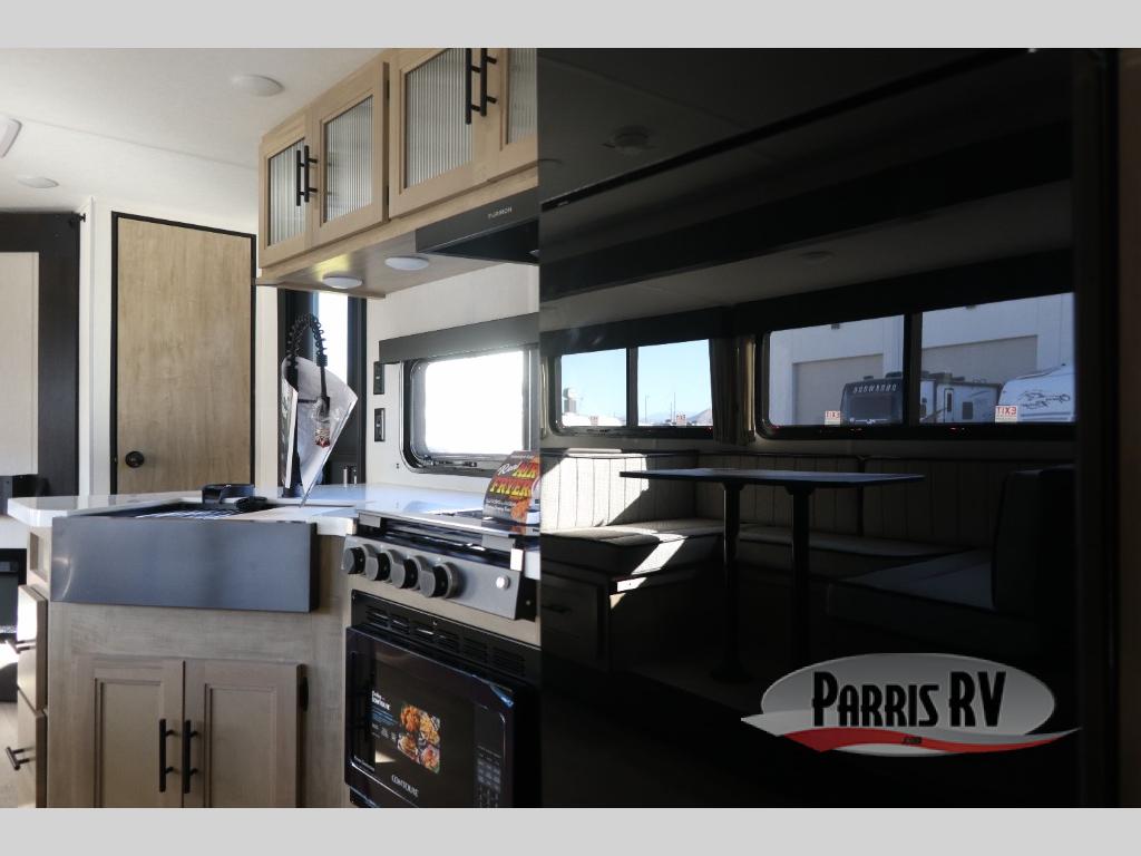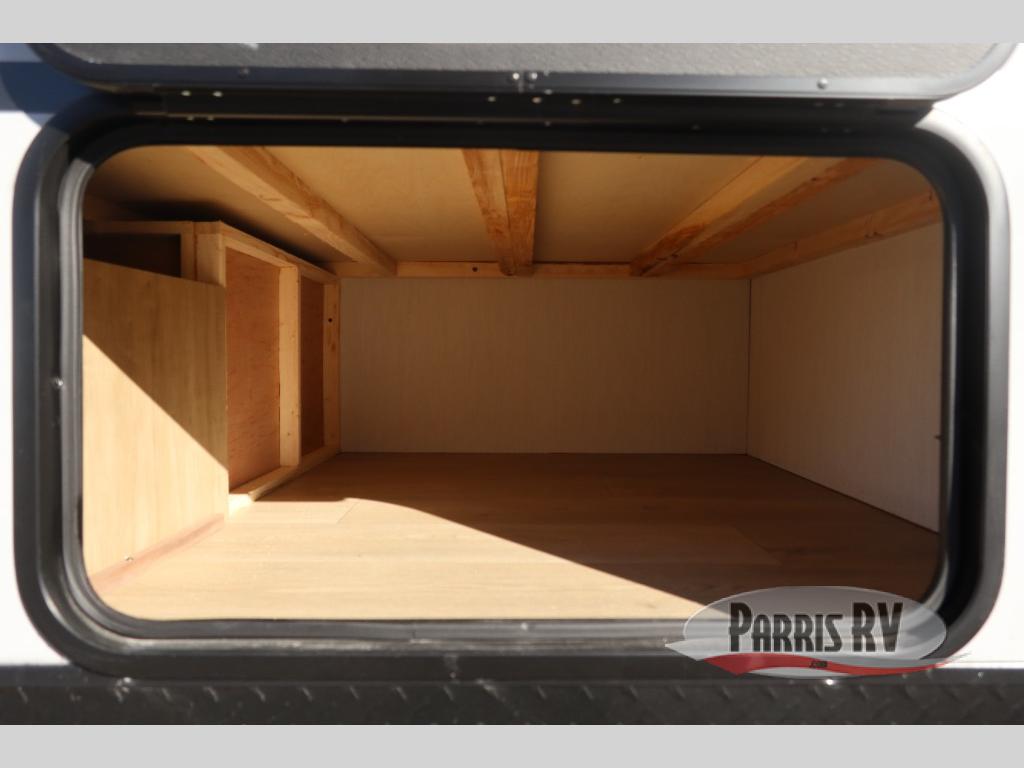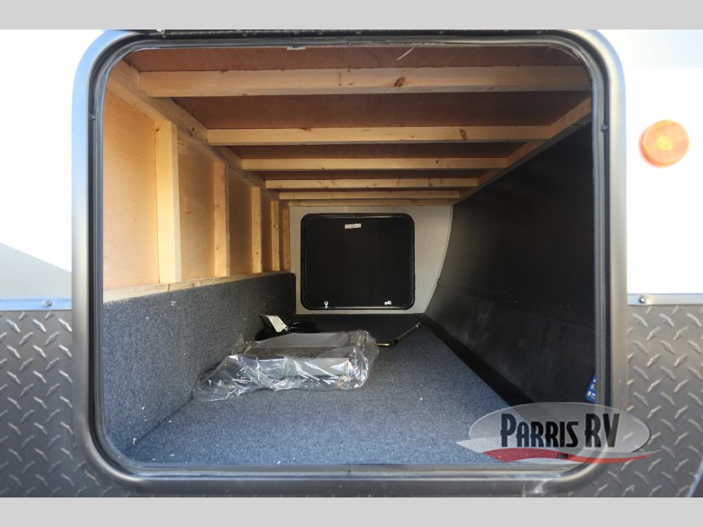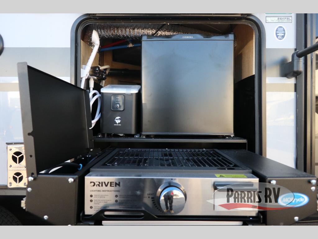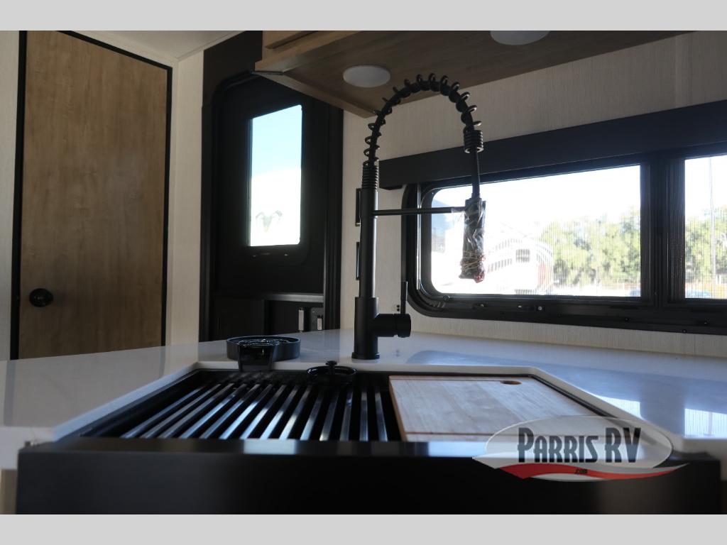 If you've been searching for a travel trailer with a larger sleeping capacity to camp with friends, this is the one! There are double-size bunks in the rear corner, and the full bath with its own exterior entry door is in the other rear corner for easy nighttime use. Up front, an RV king bed in the private bedroom is sure to bring a great night's rest, and you'll find a bedside wardrobe to keep your clothes picked up off of the floor. In the morning, everyone can meet in the main living room that includes a large slide out, U-shaped dinette, sofa, and a fireplace with a hidden pantry behind it for smart storage solutions. An outside kitchen will allow you to get some fresh air as you make dinner, but there's also a full interior kitchen if the weather isn't cooperating. Additional outdoor features include a rear storage rack, an outside TV mount, and a 15' awning for some shade!