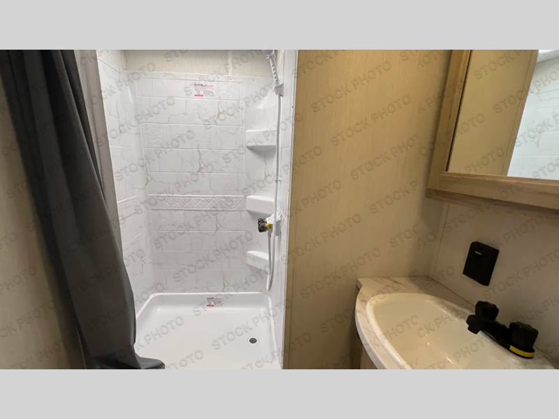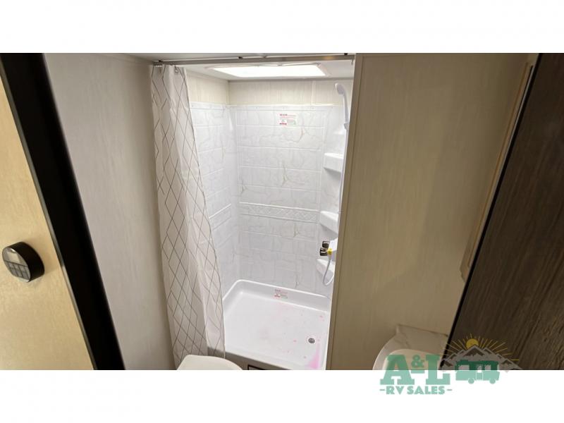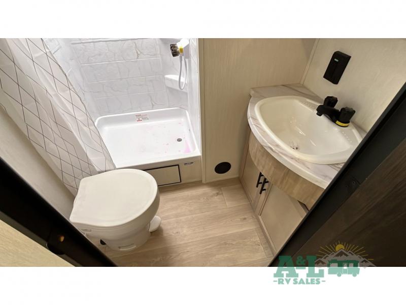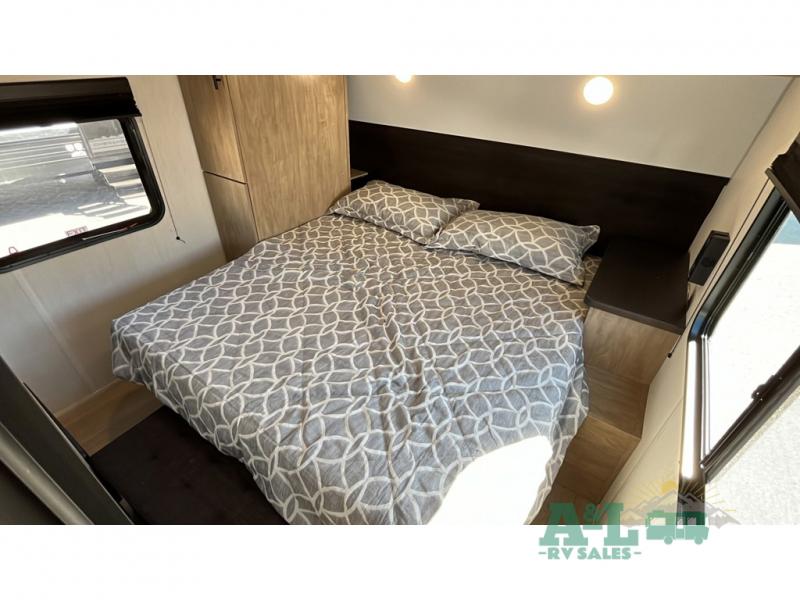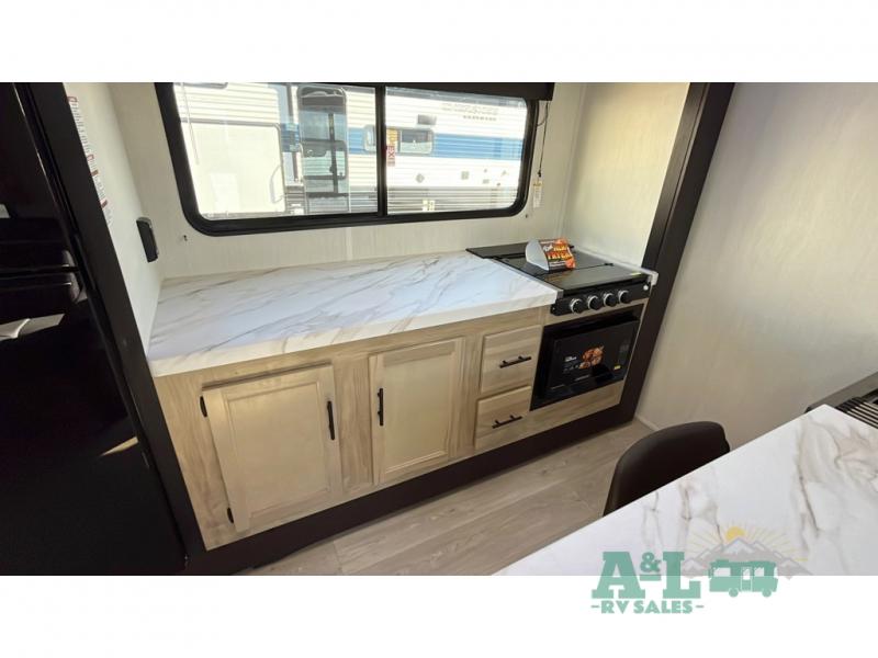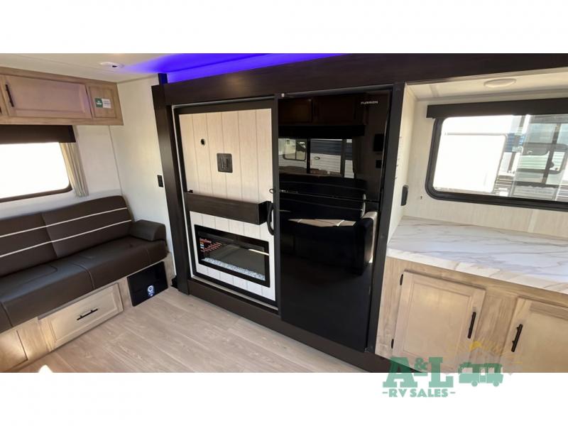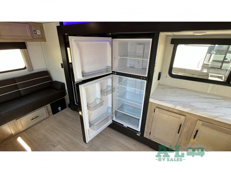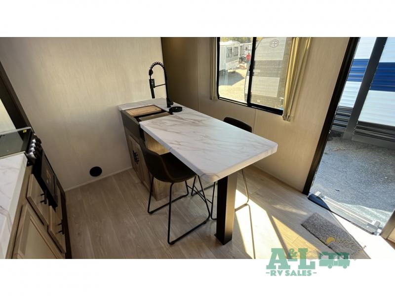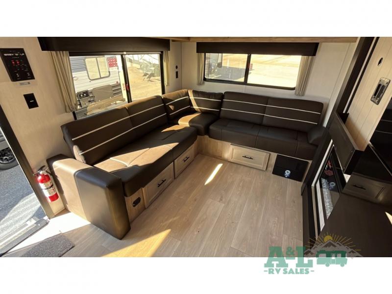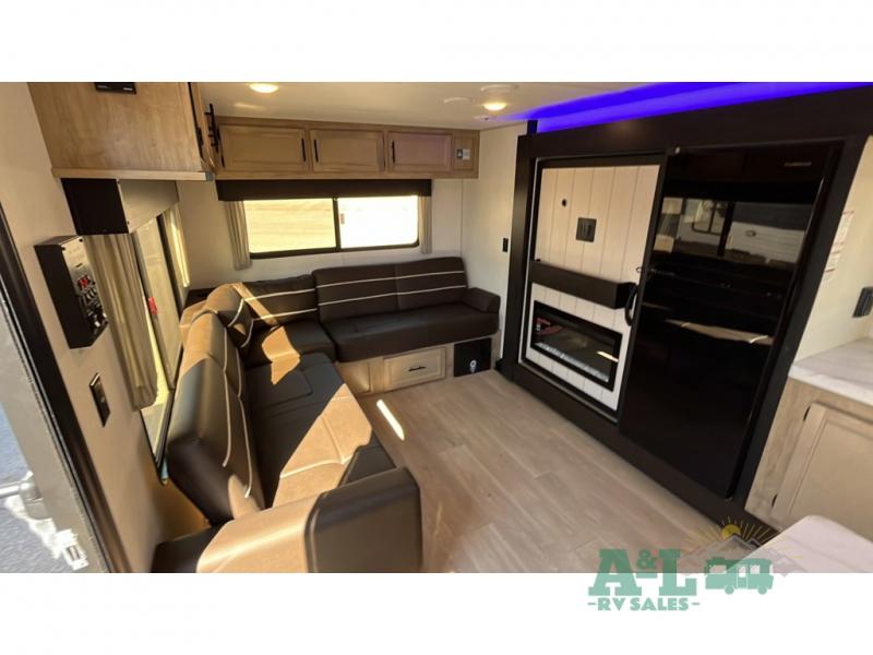 This travel trailer will feel just like home with its RV king bed in the front bedroom plus the full bath with a tub/shower, and there is a spacious living area thanks to the large slide out. Here, you'll find the air fryer and counter space, 12V refrigerator, and the fireplace with a hidden pantry behind it. Your crew can relax on the L-shaped sofa, or visit with the chef while they prep meals at the island peninsula. There are even two bar stools here for added convenience. Head outdoors to enjoy the power awning with LED lights in the evening!