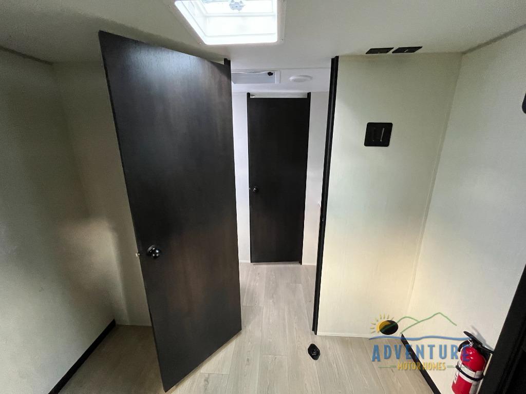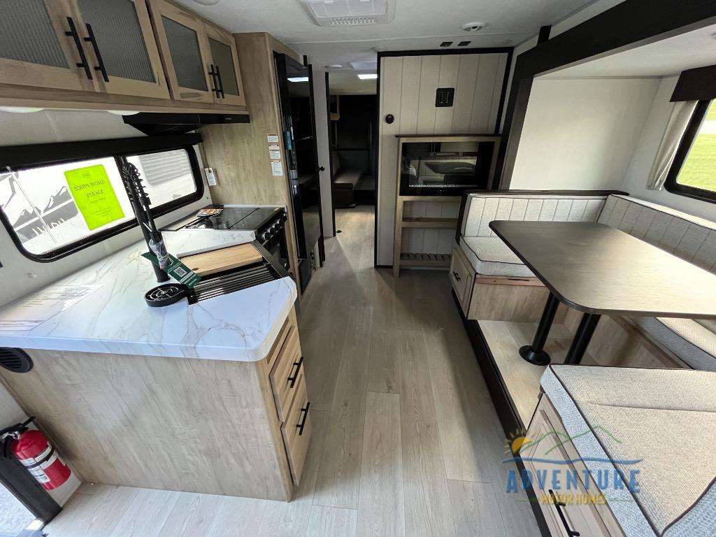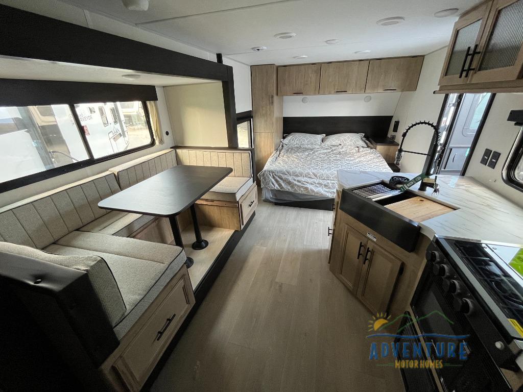 This Cherokee Grey Wolf toy hauler is perfect for those who are concerned about keeping the fuel smells and grime from entering the main living area. In this unit you can enjoy the separation with a door and the walk-though bath. In the cargo area, you will have plenty of space for hauling all of your favorite toys. This area also features dual fold-down sofas with a removable table that is great for your thrill seekers to come in for a break from riding. It also allows quick access into the bathroom without having to wander through the entire main living area where you are likely to leave a trail behind. After a full day of playing hard, you can get cleaned up and head into the main kitchen area where you will enjoy a U-shaped dinette. A full kitchen allows you to refuel your body, and there is also an RV king bed up front for a great night's rest!