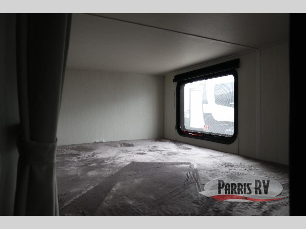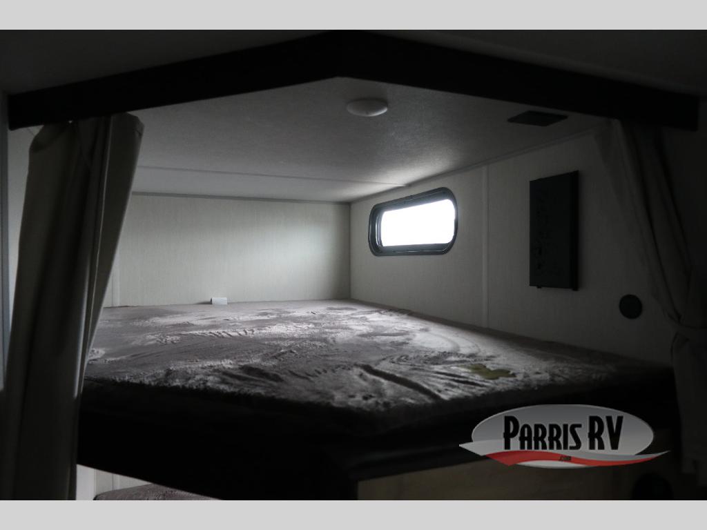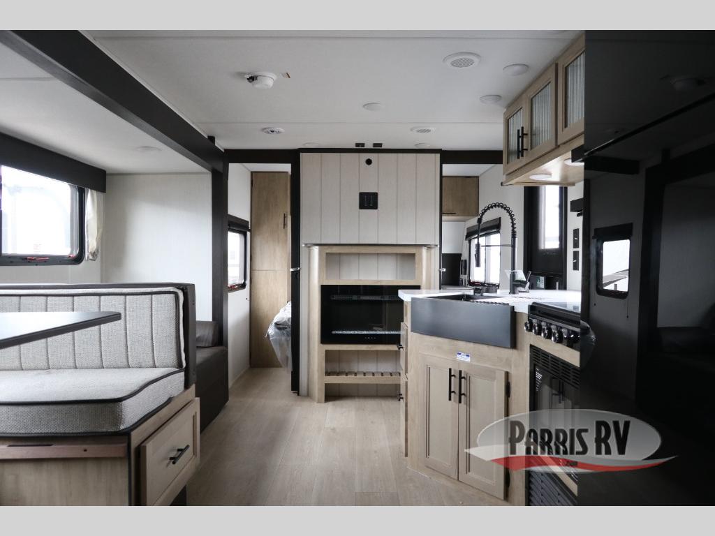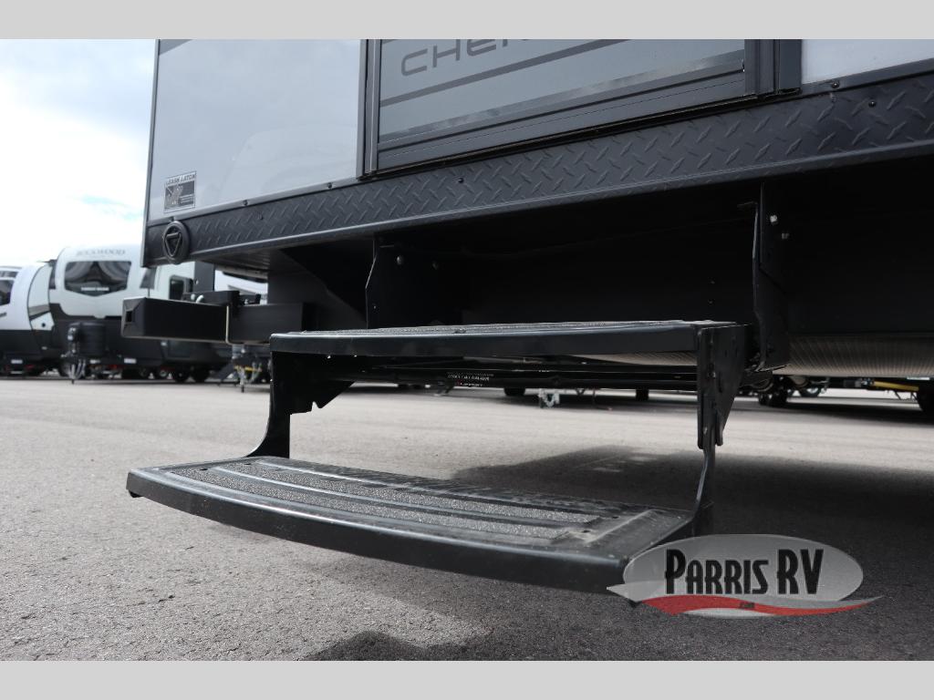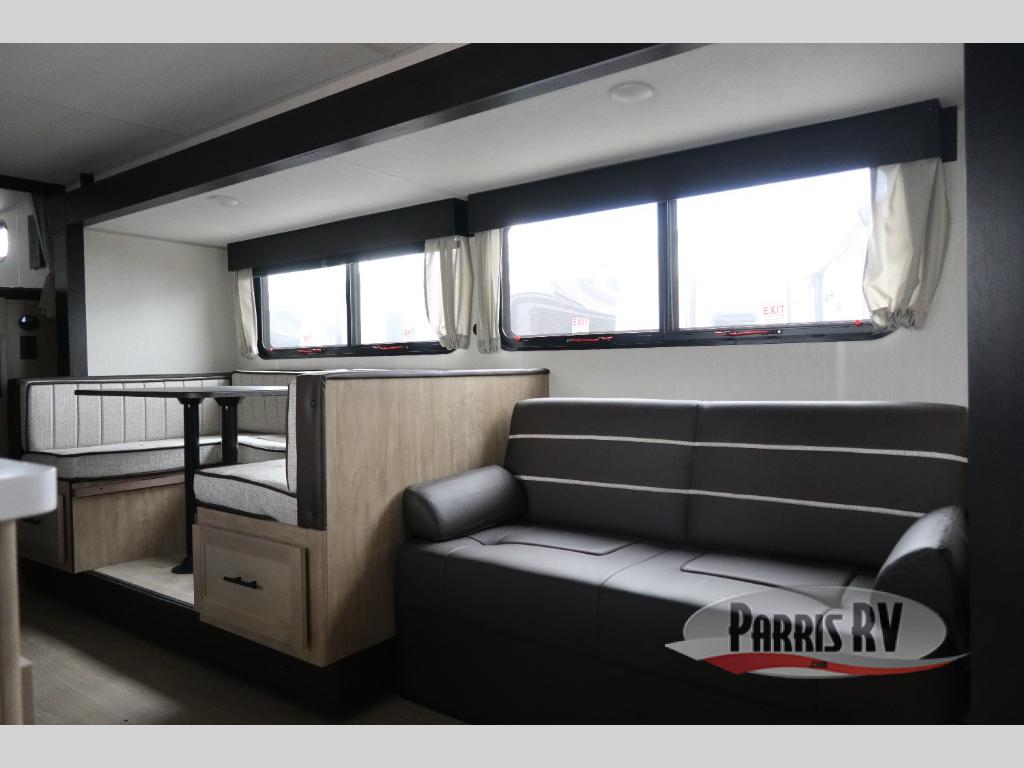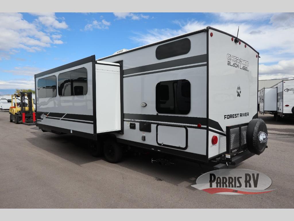 Come on inside this Cherokee Grey Wolf Black Label travel trailer and experience the convenience of a smooth flow of traffic in and out with two entry doors. The rear door leads into a full bath which is great for accessibility when outside and when you need to use the bathroom. Once inside, you will notice the large U-shaped dinette and the sofa which sit on the slide and create a spacious footprint for moving about, as well as great places to play games and socialize with your friends and family. A large pantry provides plenty of storage allowing you to stock up on your favorite snacks and dry goods for your family adventure. At night, there is sleeping space for everyone between the double-size bunks and the RV king bed, plus the furniture.