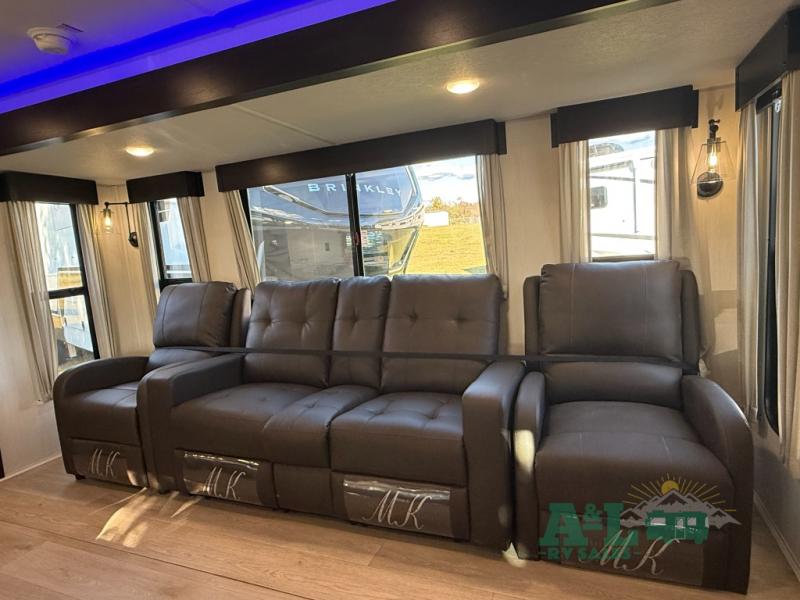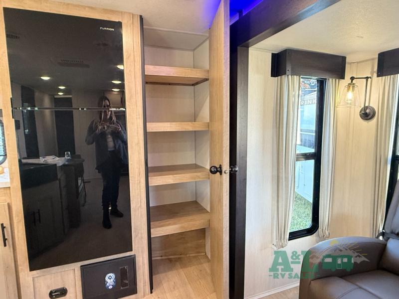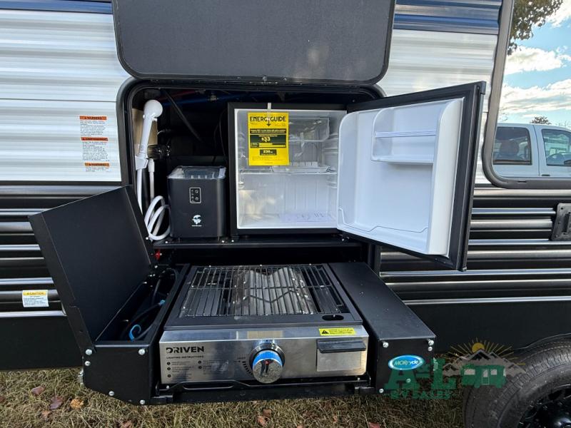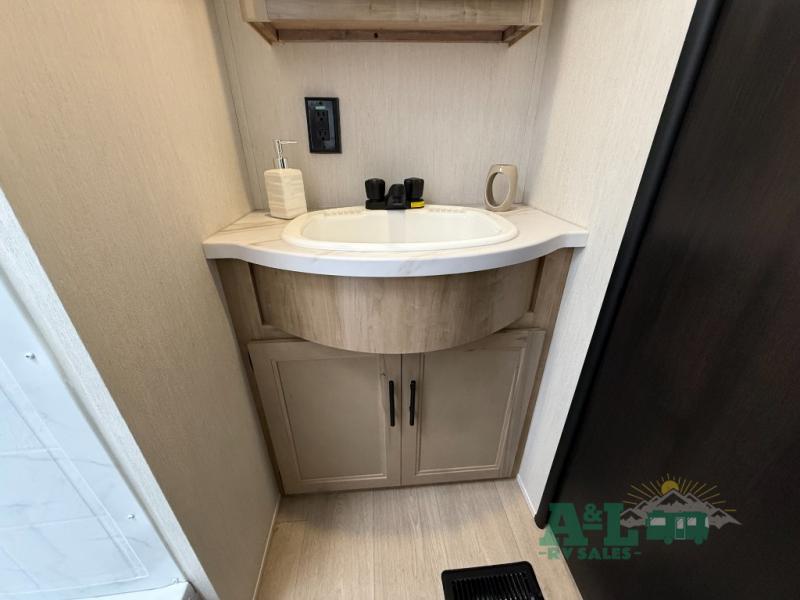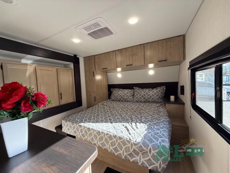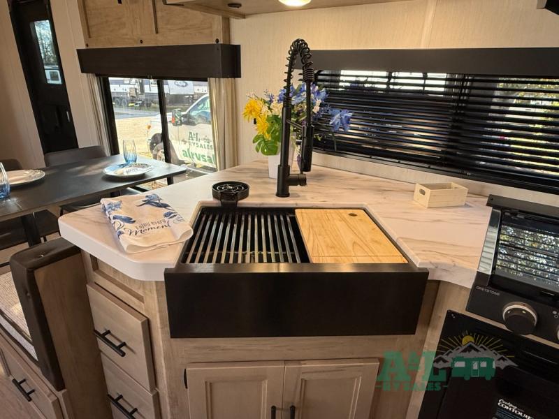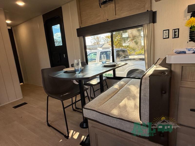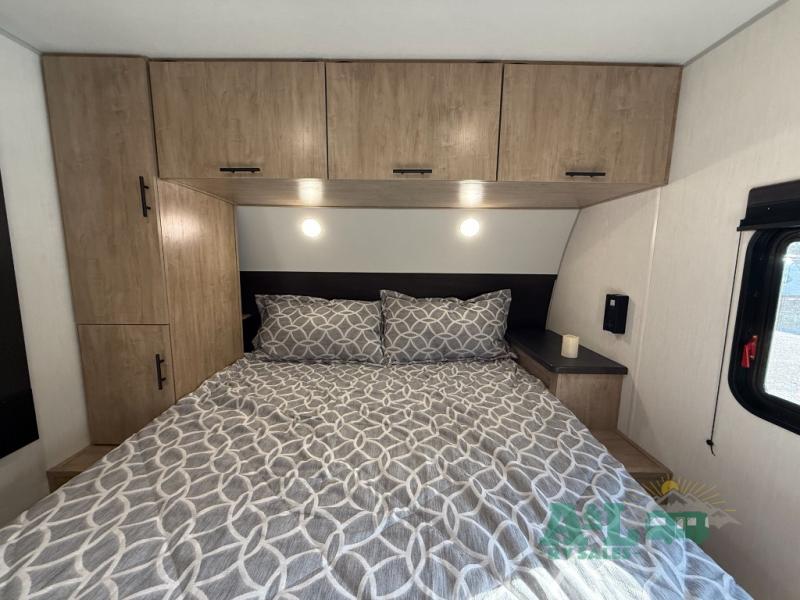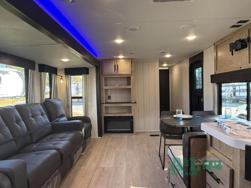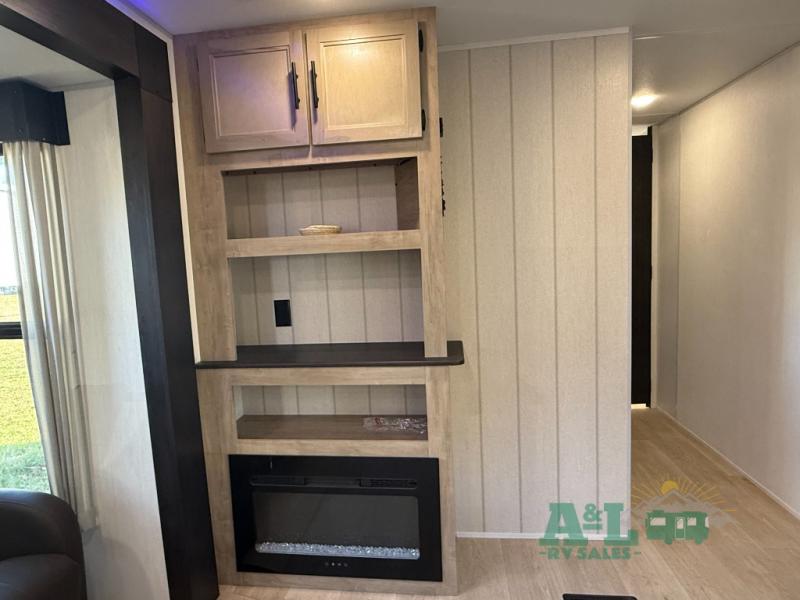 Camping trips to the lake just got sweeter in this spacious travel trailer. You will wake up feeling refreshed each morning after sleeping on the RV king bed. There are is also a bedside wardrobe, plus a dresser and a wardrobe slide out for more space. The linen closet with the option to add a washer and dryer will be another bonus if you plan to go full-time! The chef of your group will love the rear kitchen with a spacious pantry and refrigerator for food storage, plus there is an air fryer to make some crispy chicken. The dinette with bench seating on one side and two chairs on the other will provide a place to dine together, or you can take your plate outdoors to sit under the 15' power awning. The sofa and dual lounge chairs within the living room slide will make you feel right at home, especially with the fireplace close by!