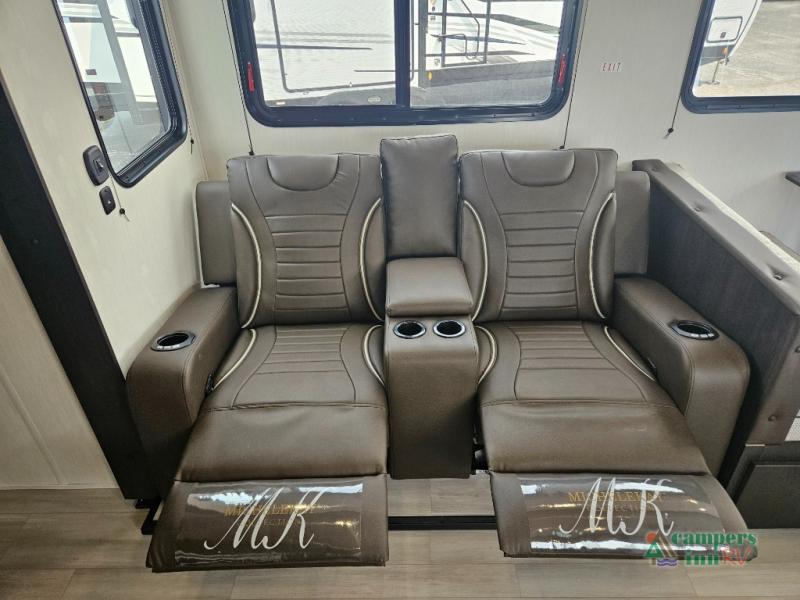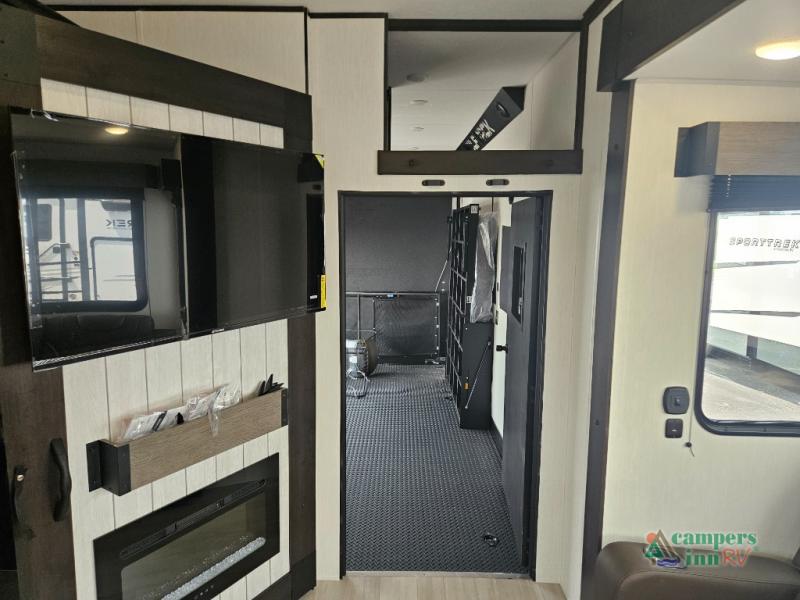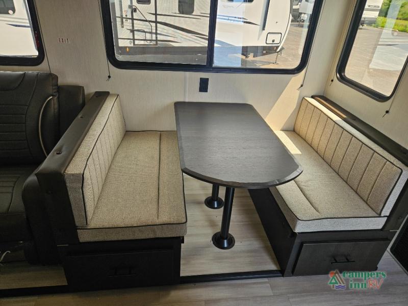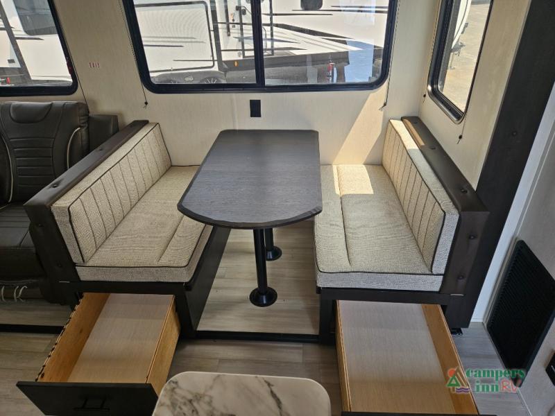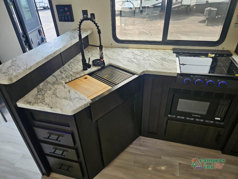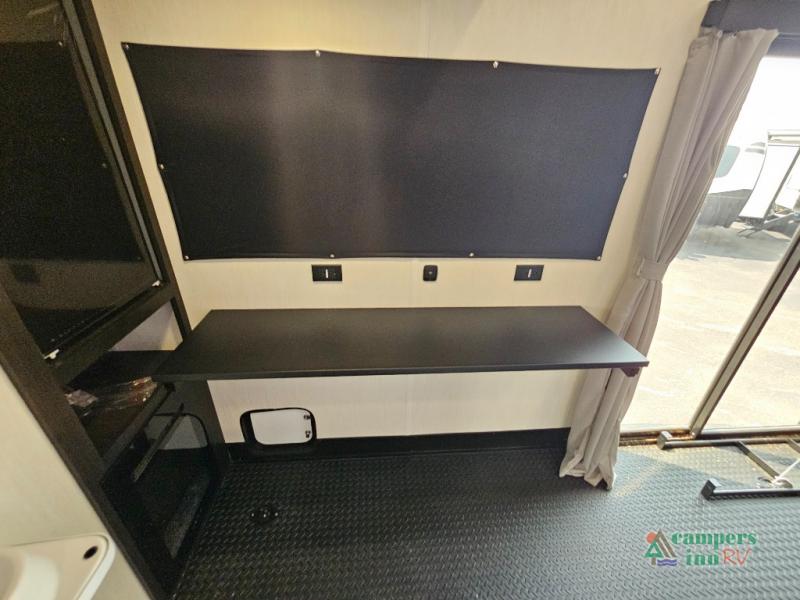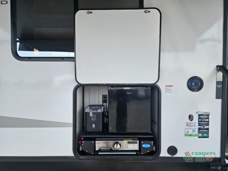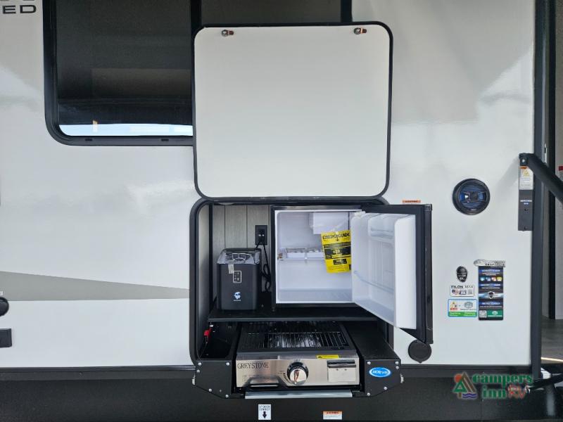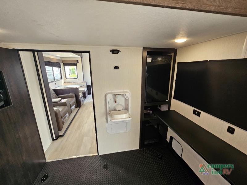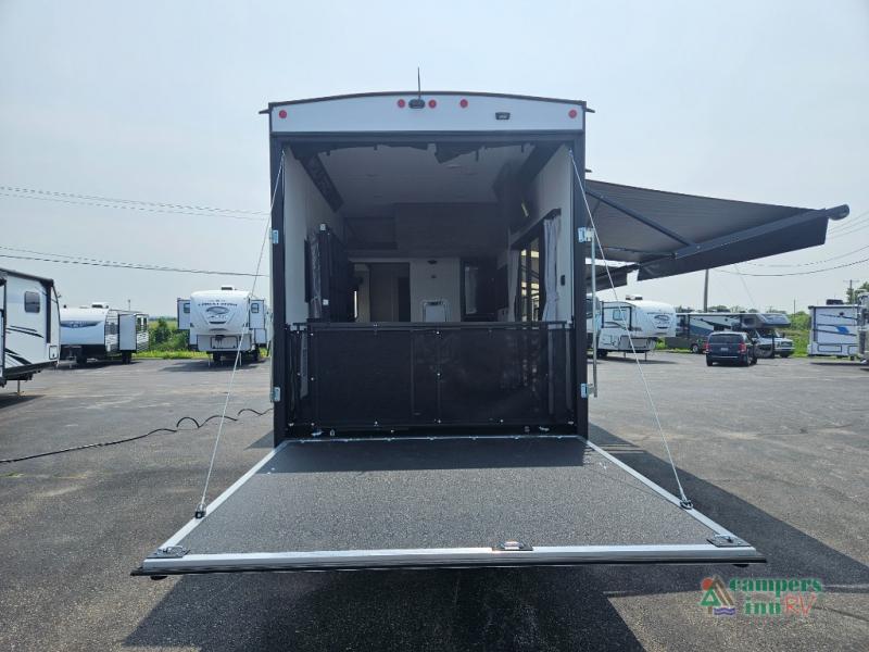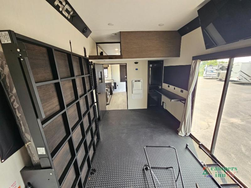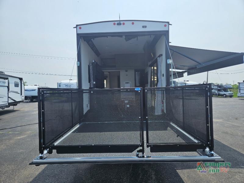 Fun at the campground begins with this dual entry toy hauler in tow! There is a 15' separate garage with glass patio doors, a loft above for guests, plus a patio deck to entertain guests. Your crew can get comfy on the theater seating or booth dinette, and there is an entertainment center with a fireplace and a hidden pantry for snacks. The chef of your group will love the full interior kitchen, along with an outdoor kitchen when the weather is nice. A full bath lets you freshen up after a trail ride, and the front private bedroom gives you your own space at night. This unit also features washer and dryer prep in the bedroom so you can add those appliances if you wish!
