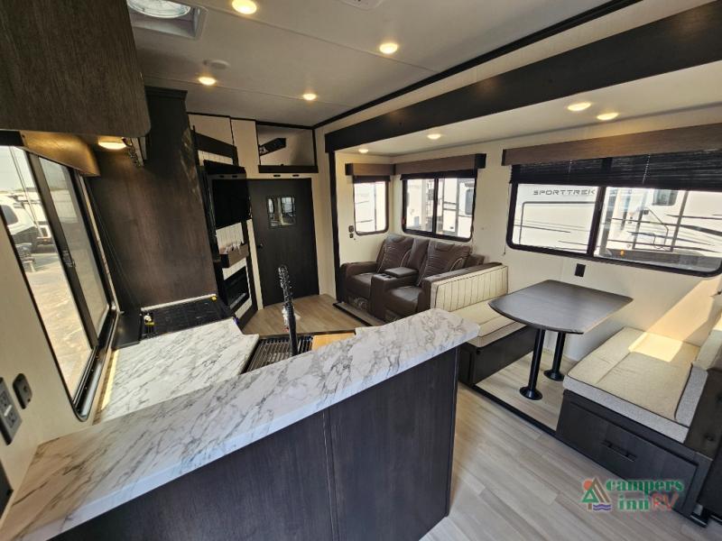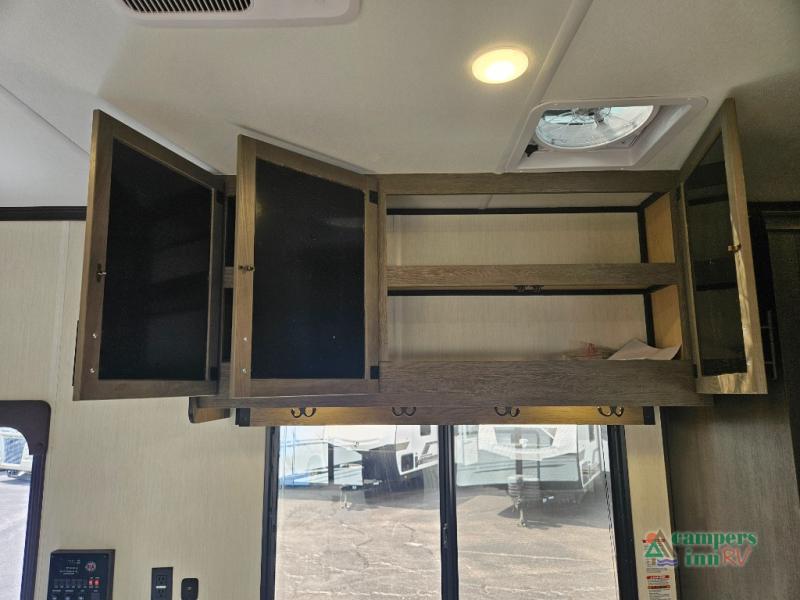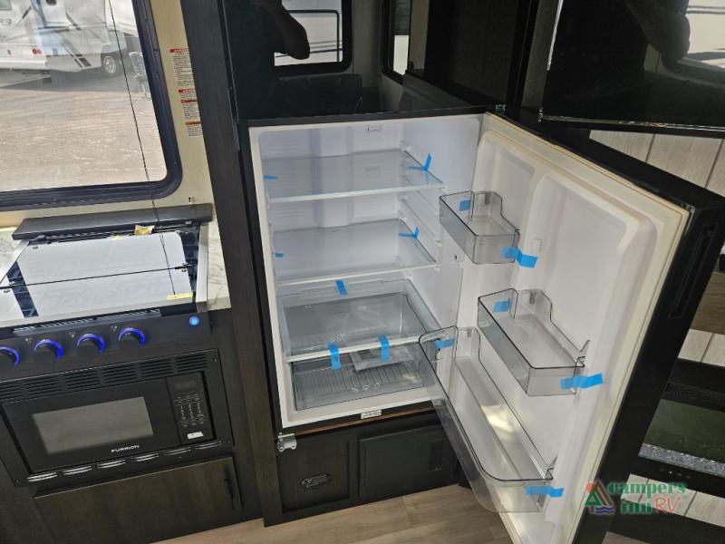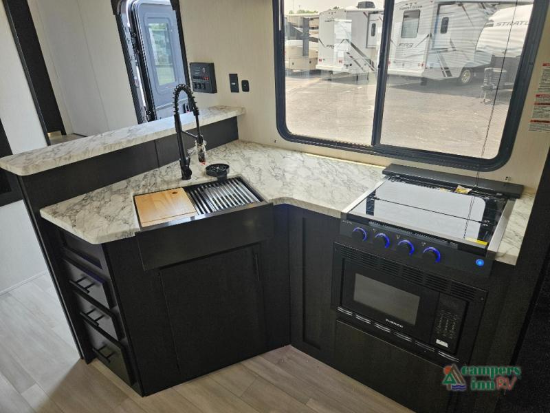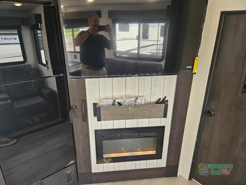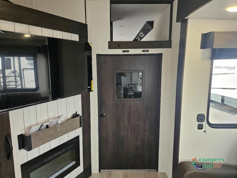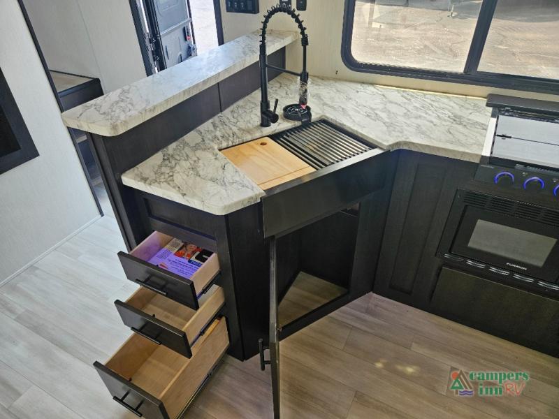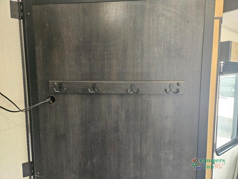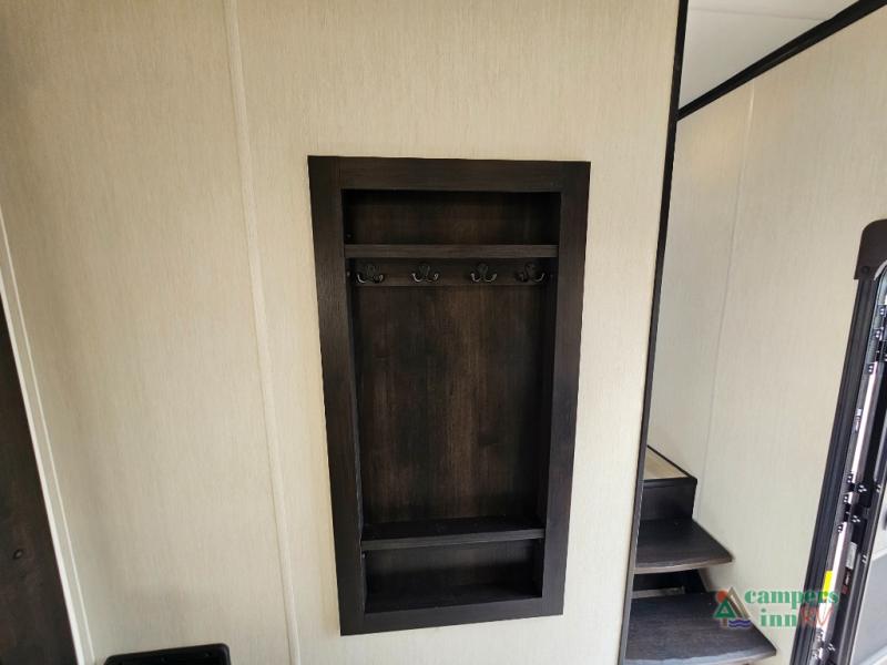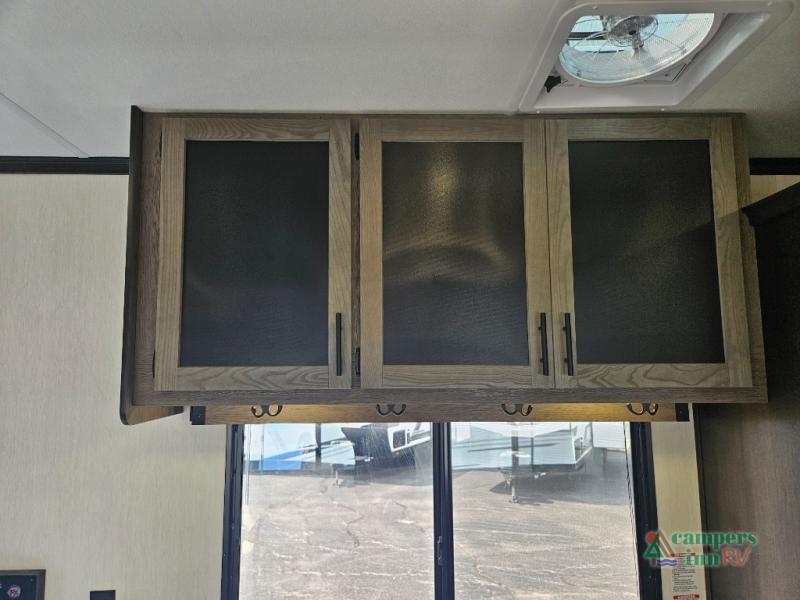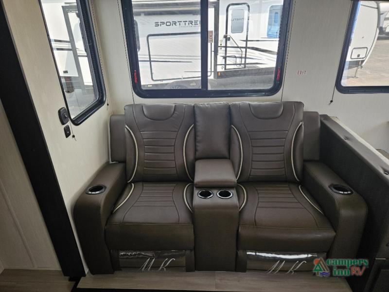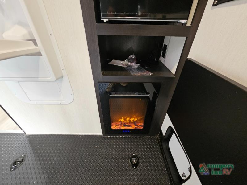 Fun at the campground begins with this dual entry toy hauler in tow! There is a 15' separate garage with glass patio doors, a loft above for guests, plus a patio deck to entertain guests. Your crew can get comfy on the theater seating or booth dinette, and there is an entertainment center with a fireplace and a hidden pantry for snacks. The chef of your group will love the full interior kitchen, along with an outdoor kitchen when the weather is nice. A full bath lets you freshen up after a trail ride, and the front private bedroom gives you your own space at night. This unit also features washer and dryer prep in the bedroom so you can add those appliances if you wish!
