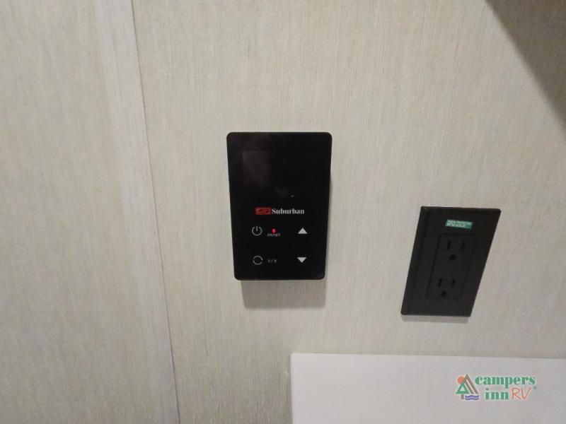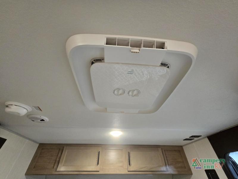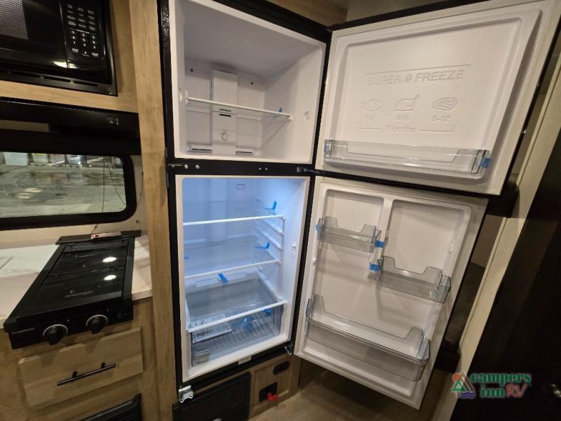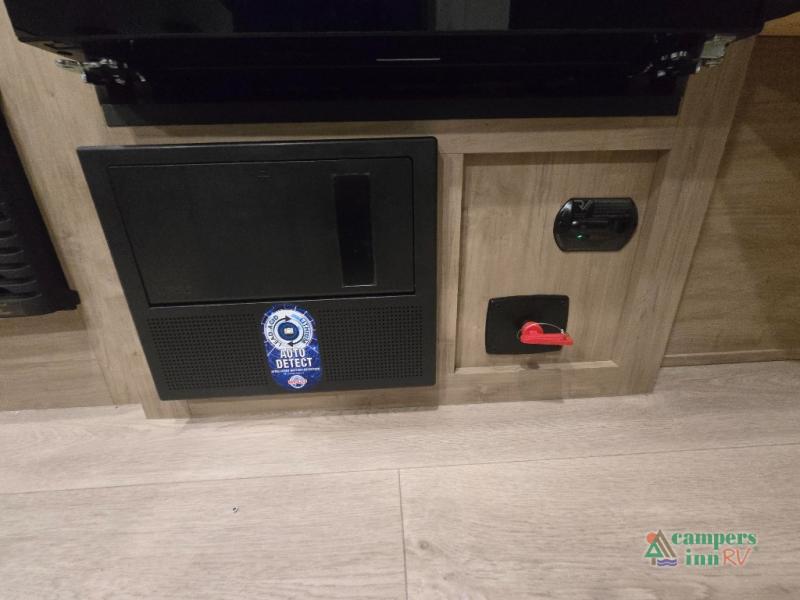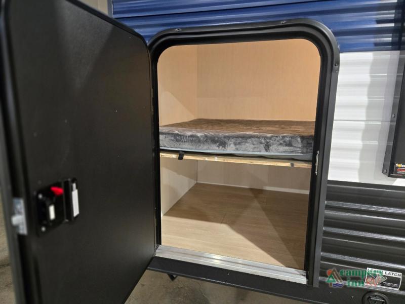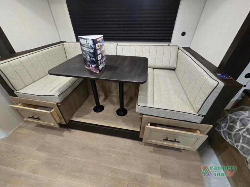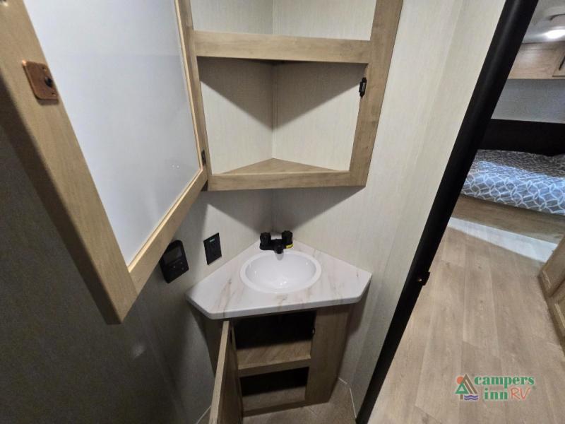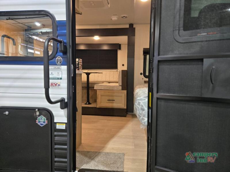 This family travel trailer is ready to head to the campground whenever you are! The kiddos can sleep on the set of double-size bed bunks, and you can sleep on the front queen bed, plus the U-shaped dinette slide can also transform into an extra sleeping space when you aren't using it to enjoy a meal prepared with the cooktop. You can also prepare your delicious meals at the outside mini kitchen and stay protected by the power awning. The exterior not only has outside storage and an outside TV mount but also features an outside storage plus door for access to the storage space underneath the bottom bunk bed. The rear corner bath allows everyone to stay clean and refreshed while you camp.
