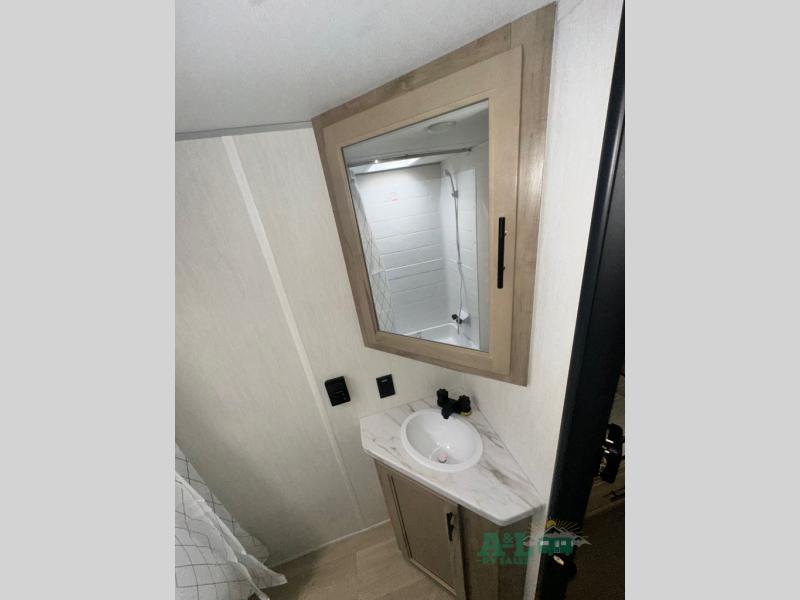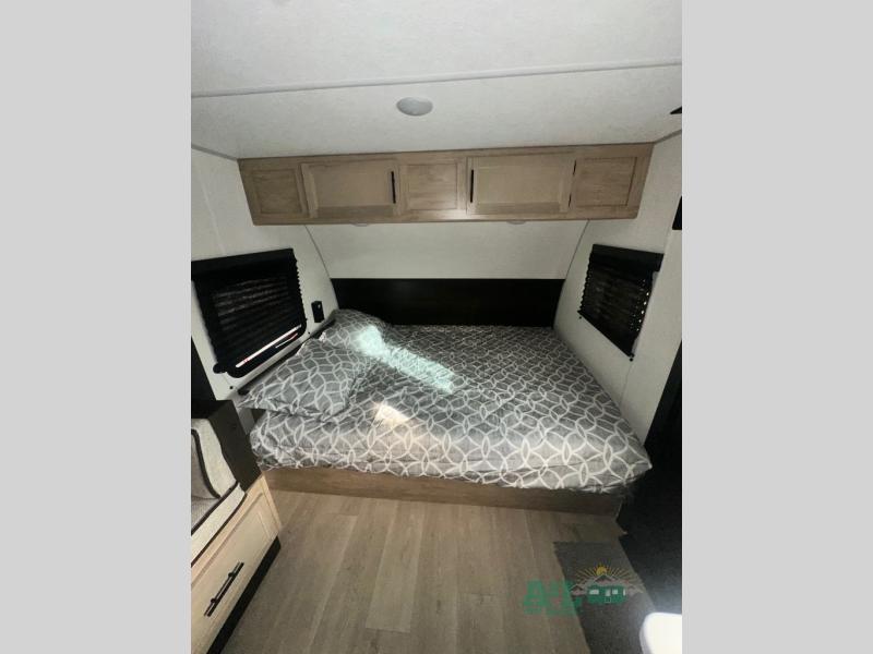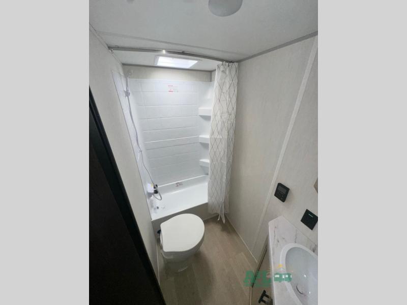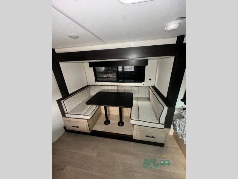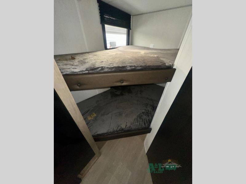 This family travel trailer is ready to head to the campground whenever you are! The kiddos can sleep on the set of double-size bed bunks, and you can sleep on the front queen bed, plus the U-shaped dinette slide can also transform into an extra sleeping space when you aren't using it to enjoy a meal prepared with the cooktop. You can also prepare your delicious meals at the outside mini kitchen and stay protected by the power awning. The exterior not only has outside storage and an outside TV mount but also features an outside storage plus door for access to the storage space underneath the bottom bunk bed. The rear corner bath allows everyone to stay clean and refreshed while you camp.