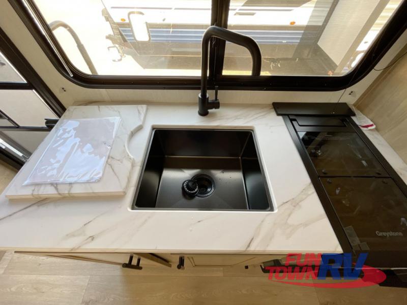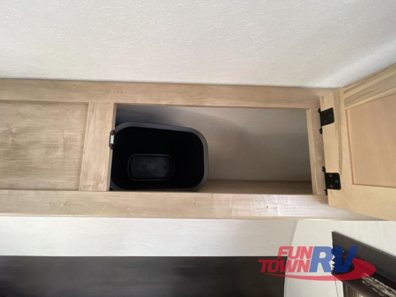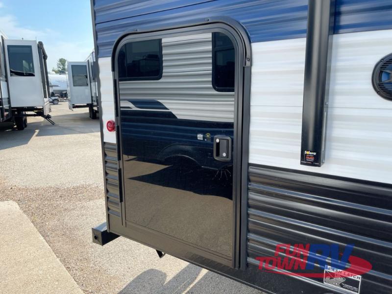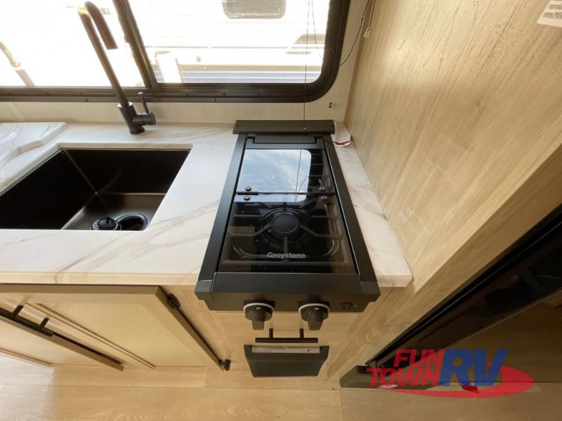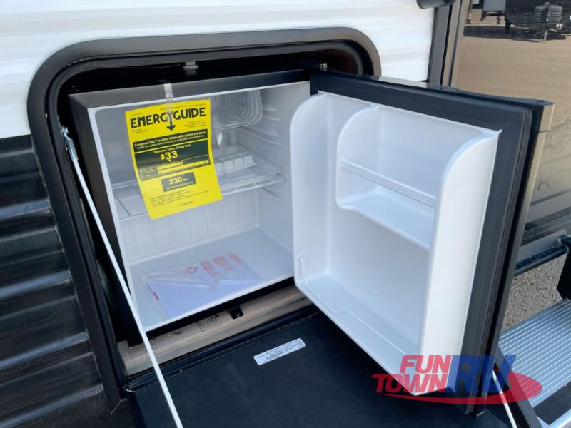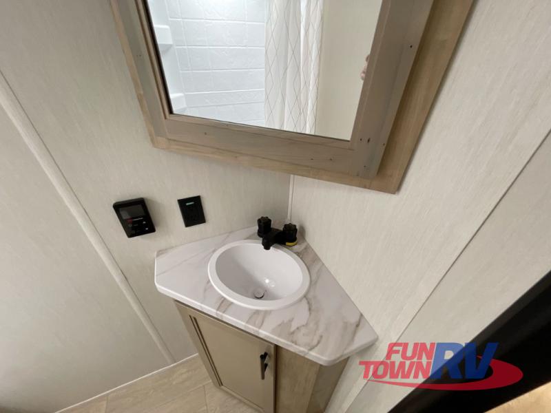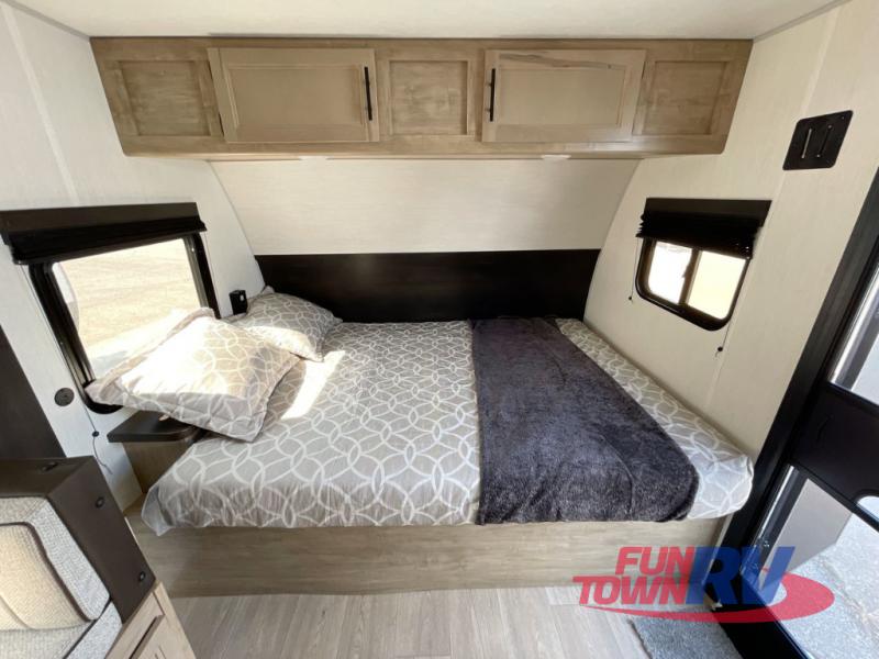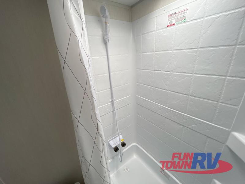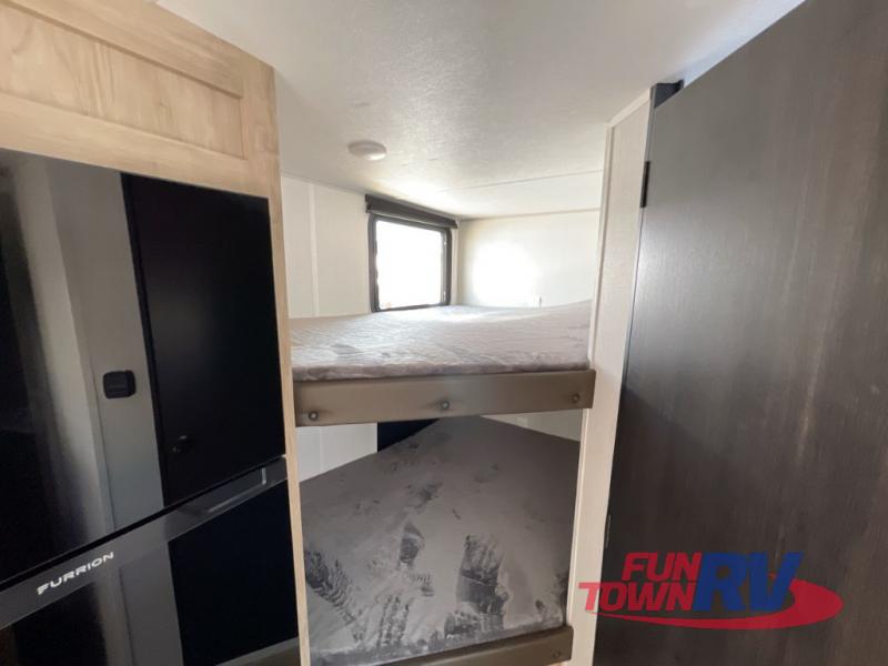 This family travel trailer is ready to head to the campground whenever you are! The kiddos can sleep on the set of double-size bed bunks and you can sleep on the front queen bed, plus the U-shaped dinette slide can also transform into an extra sleeping space when you aren't using it to enjoy a meal prepared with the high output cooktop. You can also prepare your delicious meals at the outside mini kitchen and stay protected by the power awning. The exterior not only has outside storage and an outside TV mount, but also features an outside storage plus door for access to the storage space underneath the bottom bunk bed. The rear corner bath allows everyone to stay clean and refreshed while you camp.