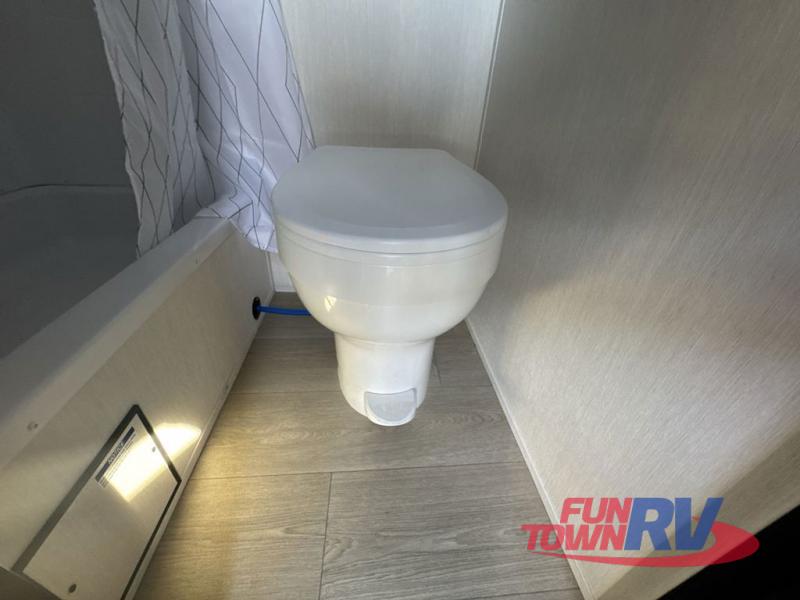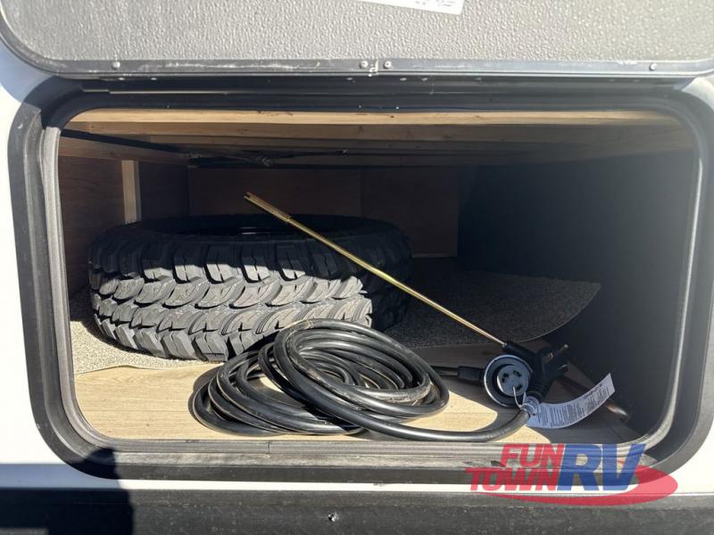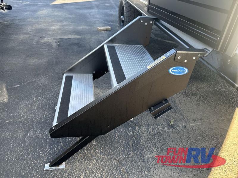 Load up your favorite off-road toys with the ramp door into the 9' 4" garage with 13' 11" total cargo space when you utilize the space up front! Enjoy all of the at home features like a fully equipped kitchen with a cooktop, refrigerator, and a microwave. Comfortably eat your delicious meals at the rear dinette with a removable table for convenience. The private bathroom has a tub/shower for you to freshen up in the morning after getting a good night's rest on the front queen bed which also has a bunk bed above it too. There is also outside storage for your hiking or riding gear!