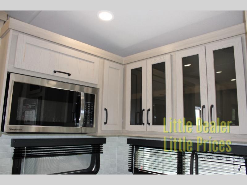 Create your campsite culinary masterpieces in a fully equipped rear kitchen with generous countertop space, an 11 cu. ft. refrigerator, a microwave, and a three-burner cooktop. Everything you need to eat well in the wild.