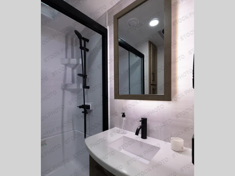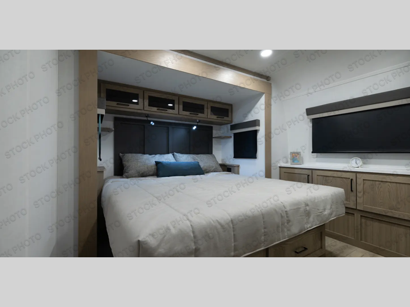 The large windows in the rear and door side slide will bring nature's scenery indoors with this travel trailer! Everyone can relax together in the rear living area featuring a 78" hide-a-bed sofa and 60" theater seating across from the entertainment center with a fireplace. Meal prepping will be even easier with the kitchen island, and the table and chairs with a bench is a comfortable place to enjoy your meals. The full bathroom has a shower with a seat and a linen closet to keep your towels close. You will feel well rested each morning after sleeping on the king bed slide in the front private bedroom which also has a wardrobe with washer and dryer prep and an area to add an optional TV!