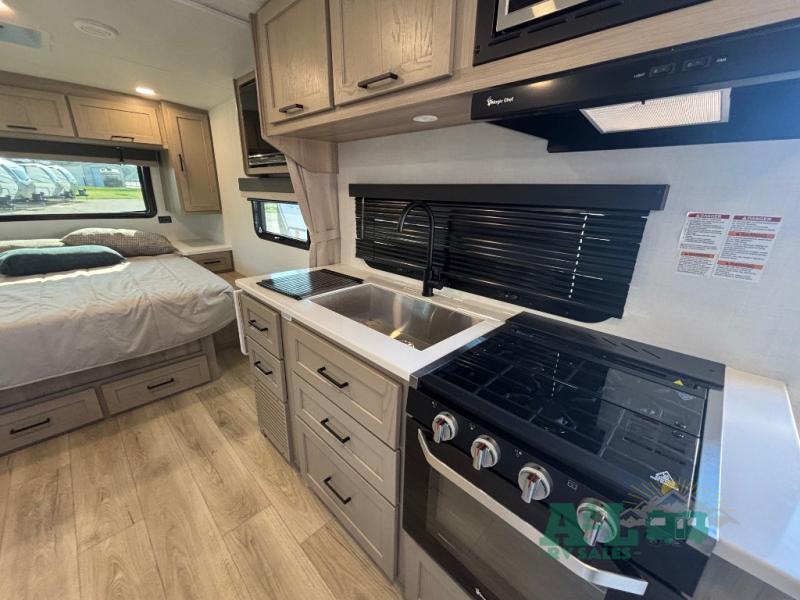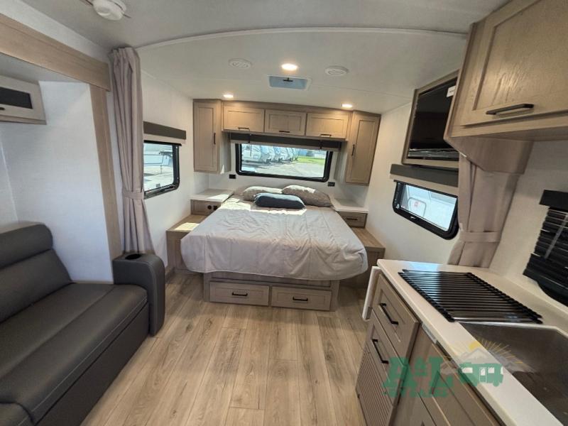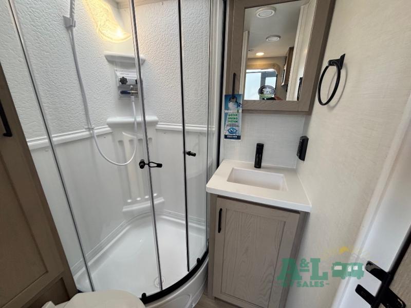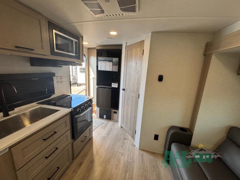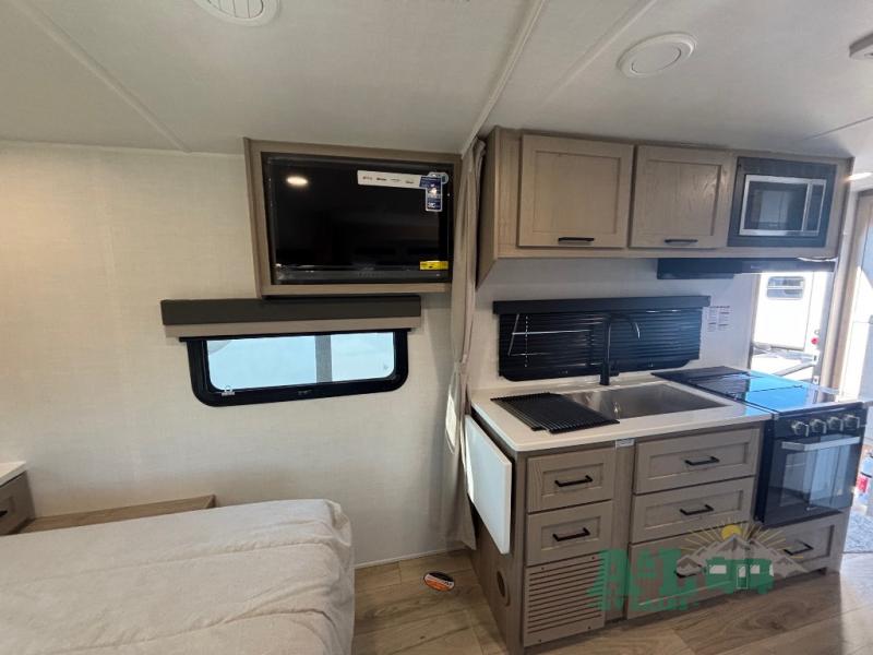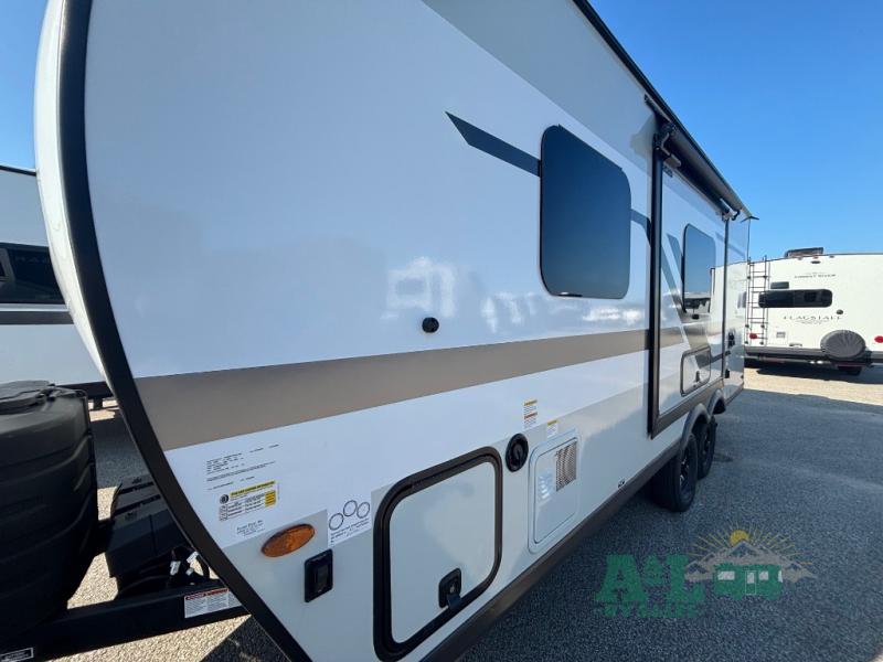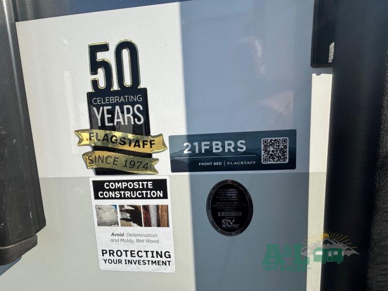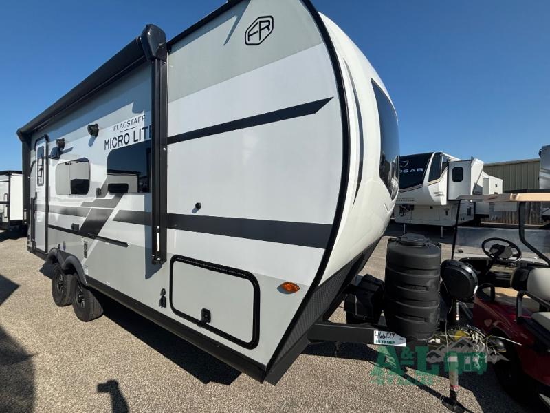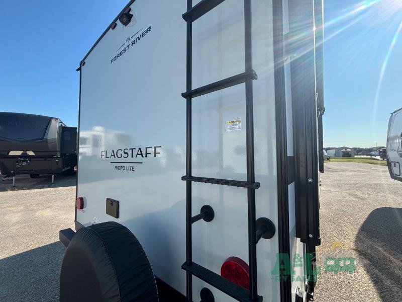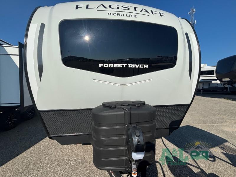 With any Flagstaff Micro Lite travel trailer by Forest River you will enjoy lightweight towing, durable construction, and added interior comforts to make each trip memorable! Each model features RoadTech tire pressure monitoring, Dexter Torflex axles, and nitrogen-filled Goodyear endurance tires for smooth towing from home to campground. The 6-sided aluminum framed construction provides a strong foundation so you can enjoy your RV for years to come, plus the radiant foil in the front cap, underbelly and slides help insulate your trailer. Additional exterior features include a 200W solar panel, back-up camera prep, frameless windows, and slam baggage doors. Each model includes the Great Expectations Package with roller shades, solid surface kitchen countertops, and hidden hinge cabinet doors. There is also an exterior hot/cold water port, outside speakers, a power tongue jack and stabilizer jacks, plus many more conveniences.