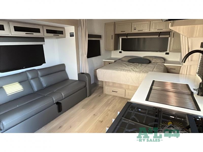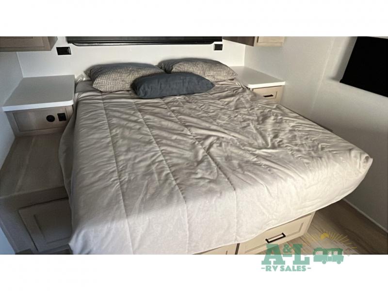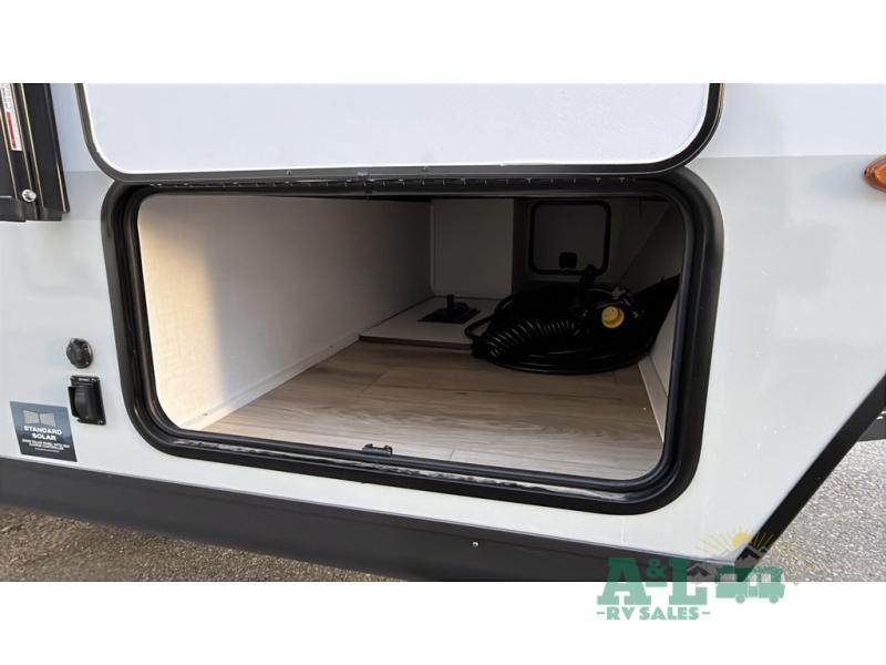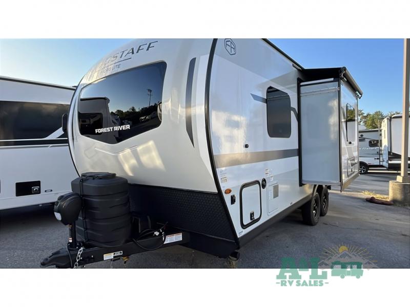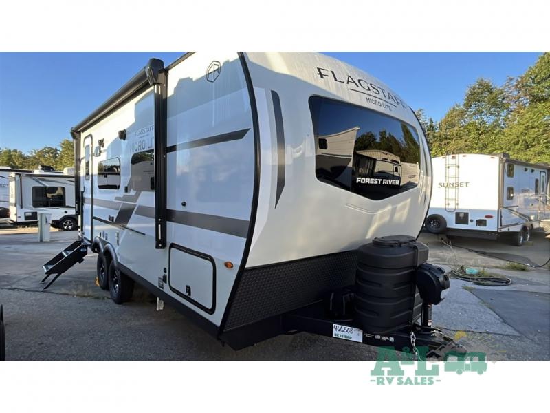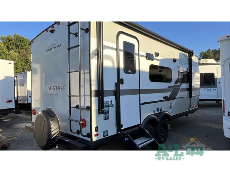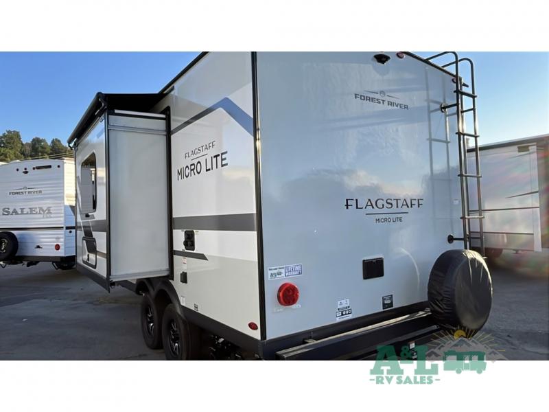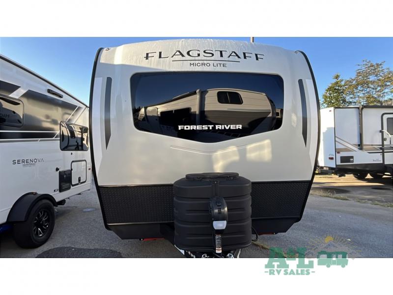 With any Flagstaff Micro Lite travel trailer by Forest River you will enjoy lightweight towing, durable construction, and added interior comforts to make each trip memorable! Each model features RoadTech tire pressure monitoring, Dexter Torflex axles, and nitrogen-filled Goodyear endurance tires for smooth towing from home to campground. The 6-sided aluminum framed construction provides a strong foundation so you can enjoy your RV for years to come, plus the radiant foil in the front cap, underbelly and slides help insulate your trailer. Additional exterior features include a 200W solar panel, back-up camera prep, frameless windows, and slam baggage doors. Each model includes the Great Expectations Package with roller shades, solid surface kitchen countertops, and hidden hinge cabinet doors. There is also an exterior hot/cold water port, outside speakers, a power tongue jack and stabilizer jacks, plus many more conveniences.