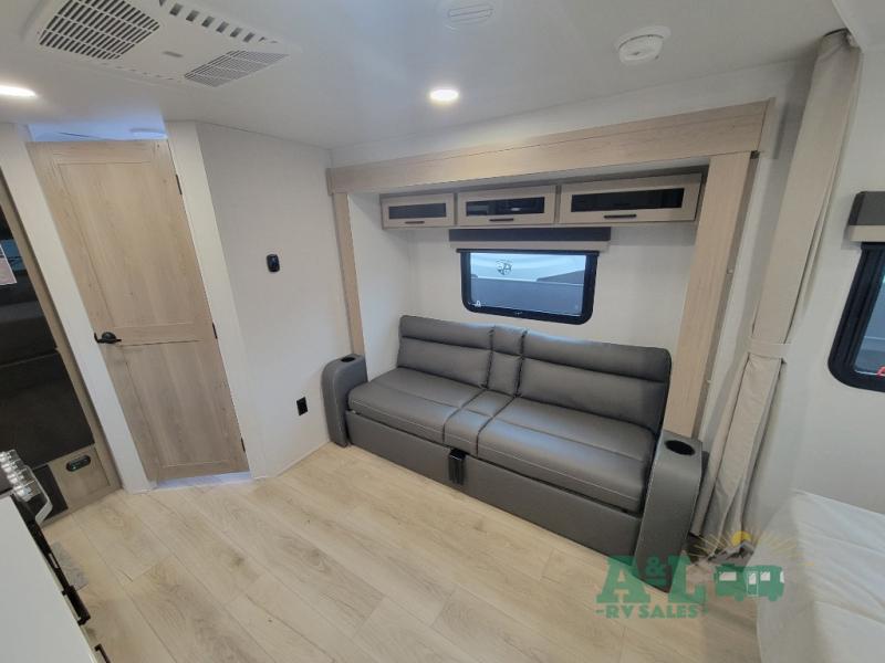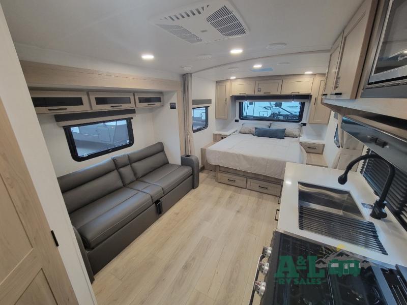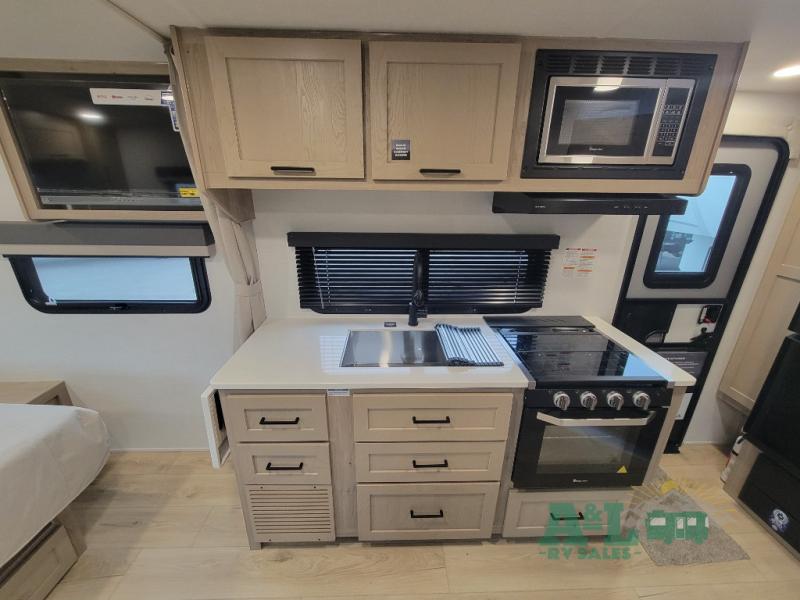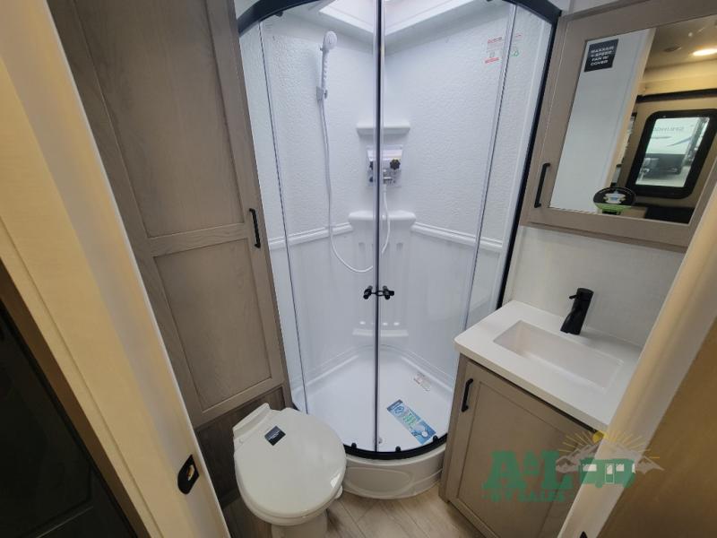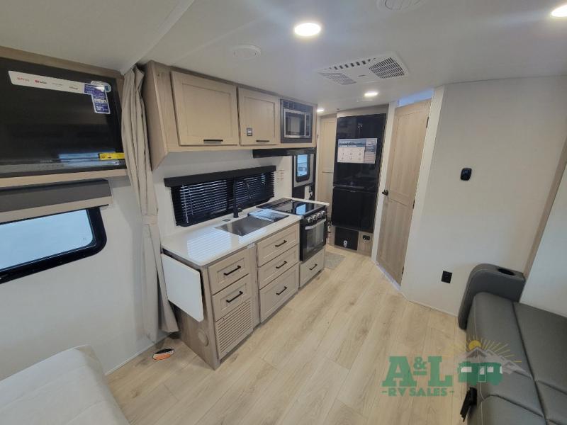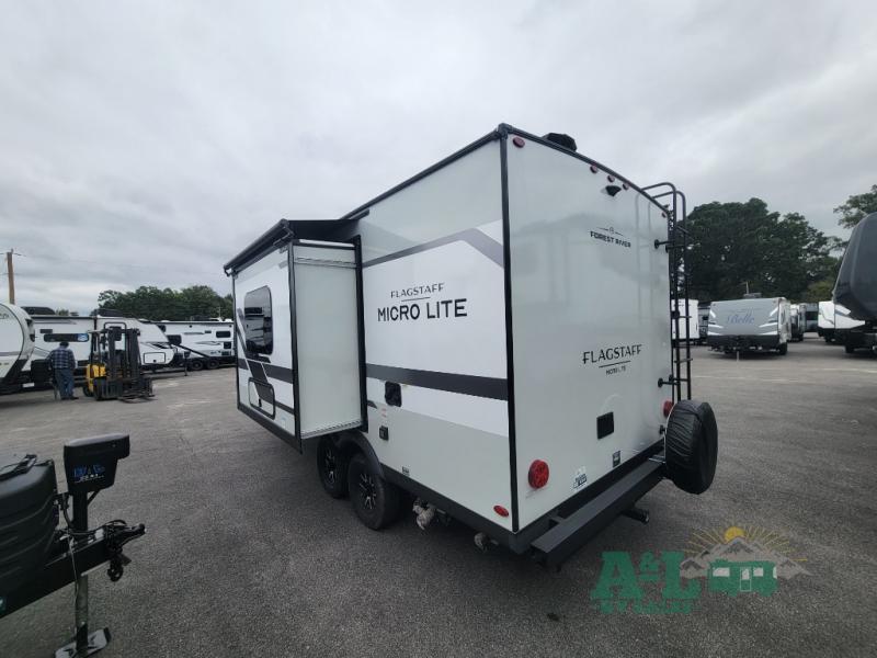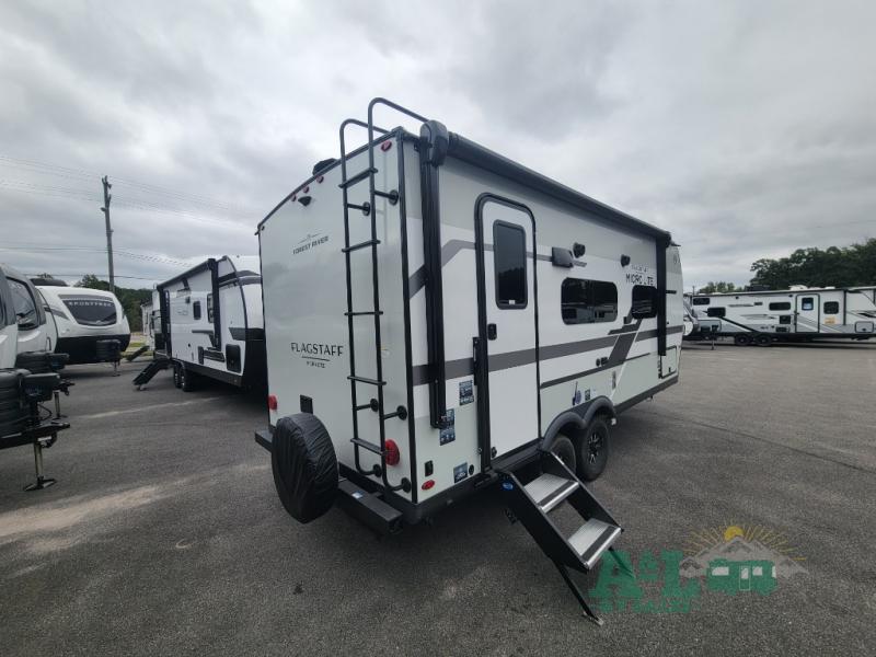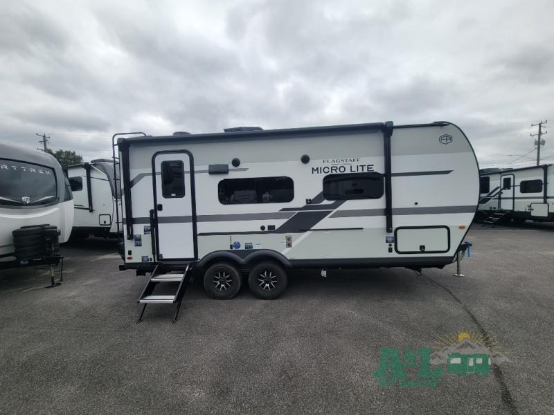 With any Flagstaff Micro Lite travel trailer by Forest River you will enjoy lightweight towing, durable construction, and added interior comforts to make each trip memorable! Each model features RoadTech tire pressure monitoring, Dexter Torflex axles, and nitrogen-filled Goodyear endurance tires for smooth towing from home to campground. The 6-sided aluminum framed construction provides a strong foundation so you can enjoy your RV for years to come, plus the radiant foil in the front cap, underbelly and slides help insulate your trailer. Additional exterior features include a 200W solar panel, back-up camera prep, frameless windows, and slam baggage doors. Each model includes the Great Expectations Package with roller shades, solid surface kitchen countertops, and hidden hinge cabinet doors. There is also an exterior hot/cold water port, outside speakers, a power tongue jack and stabilizer jacks, plus many more conveniences.