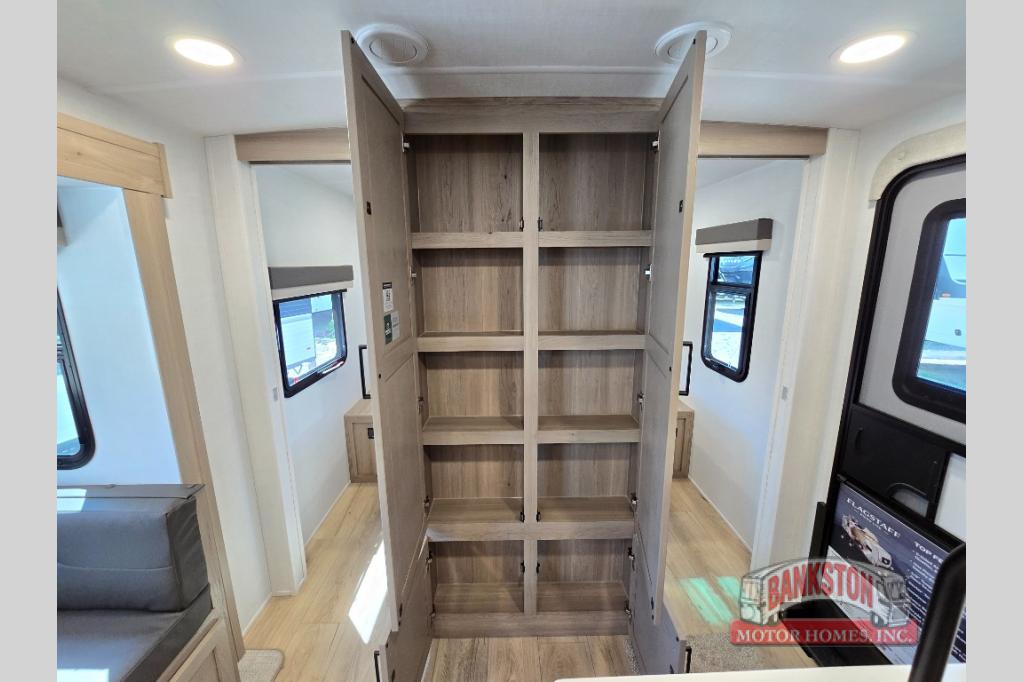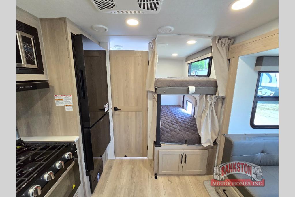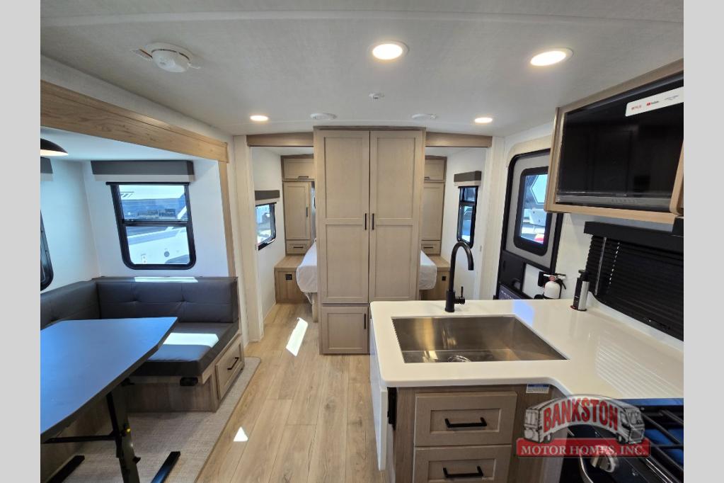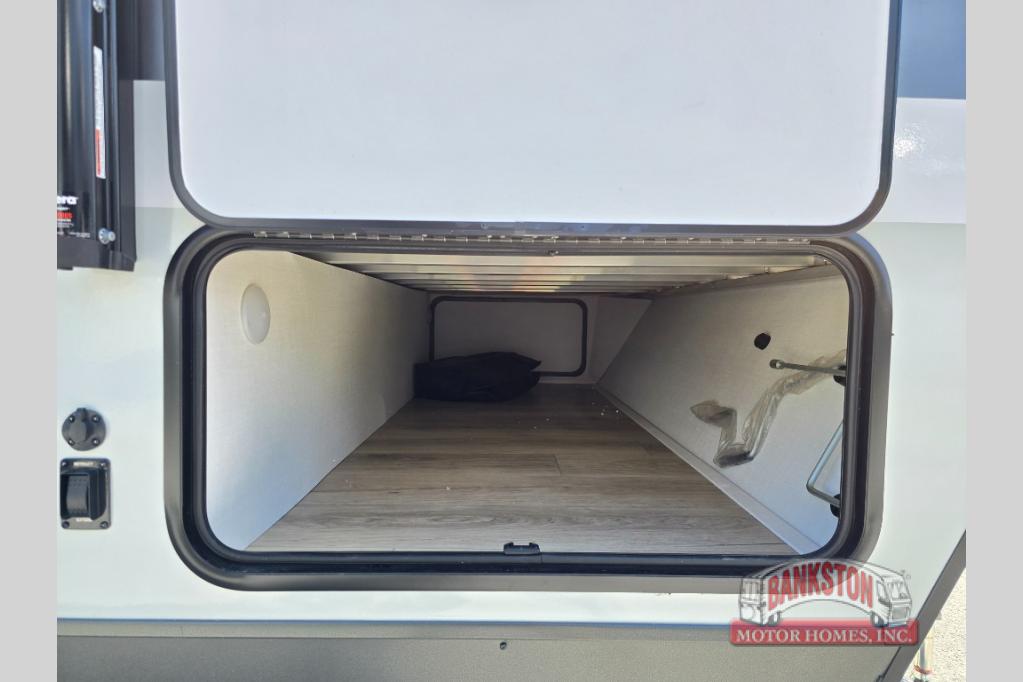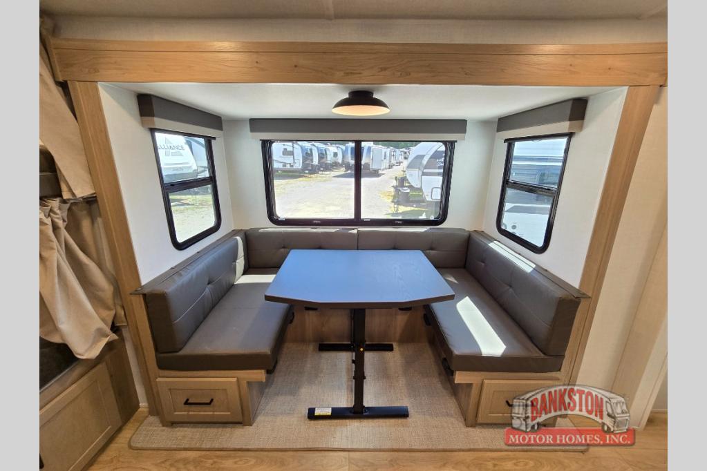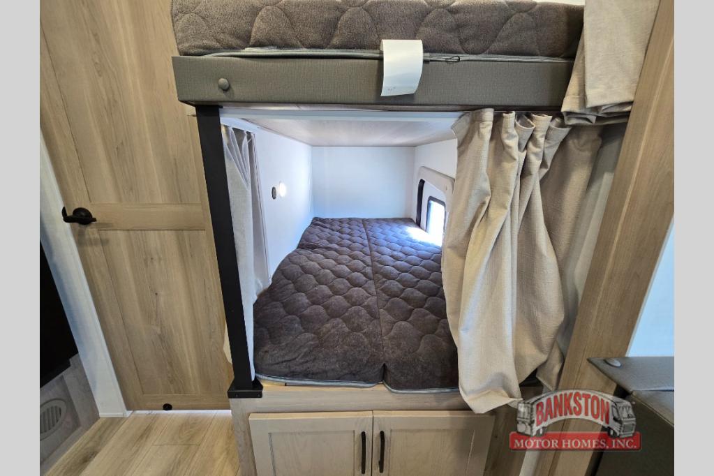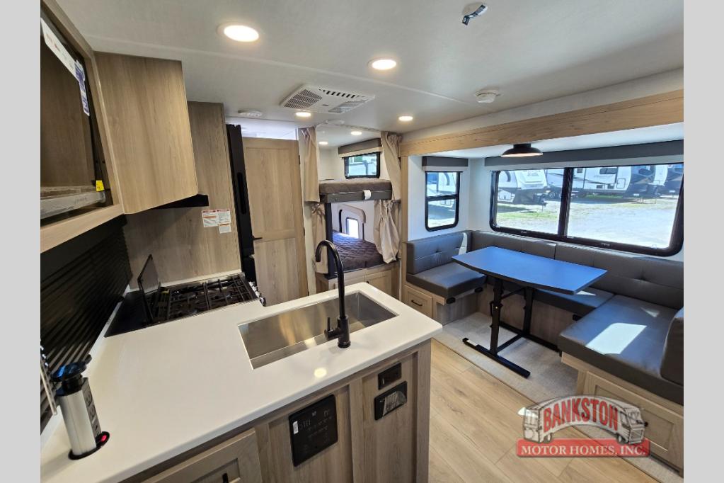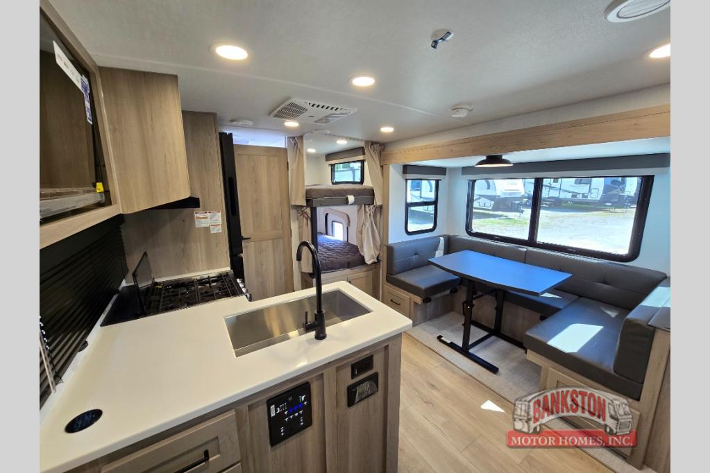 Camping in this single slide out travel trailer will make weekends at the campground comfy and hassle-free! Once you arrive, you can unload the pass-through storage, put out the 18' power awning, then make lunch on the exterior griddle. There is also a full interior kitchen to make meals when the weather isn't cooperating. Everyone can gather around the U-shaped dinette slide for meal times or game night, and there is a spacious pantry where you can store snacks! The bunk beds include a flip-up bottom bunk and an exterior bike door so you can easily pack camp gear away, and the full bath is right next to the bunks for easy nighttime use. Head up front to enjoy your own private bedroom with an RV queen bed, dual wardrobes, and flip-up storage!