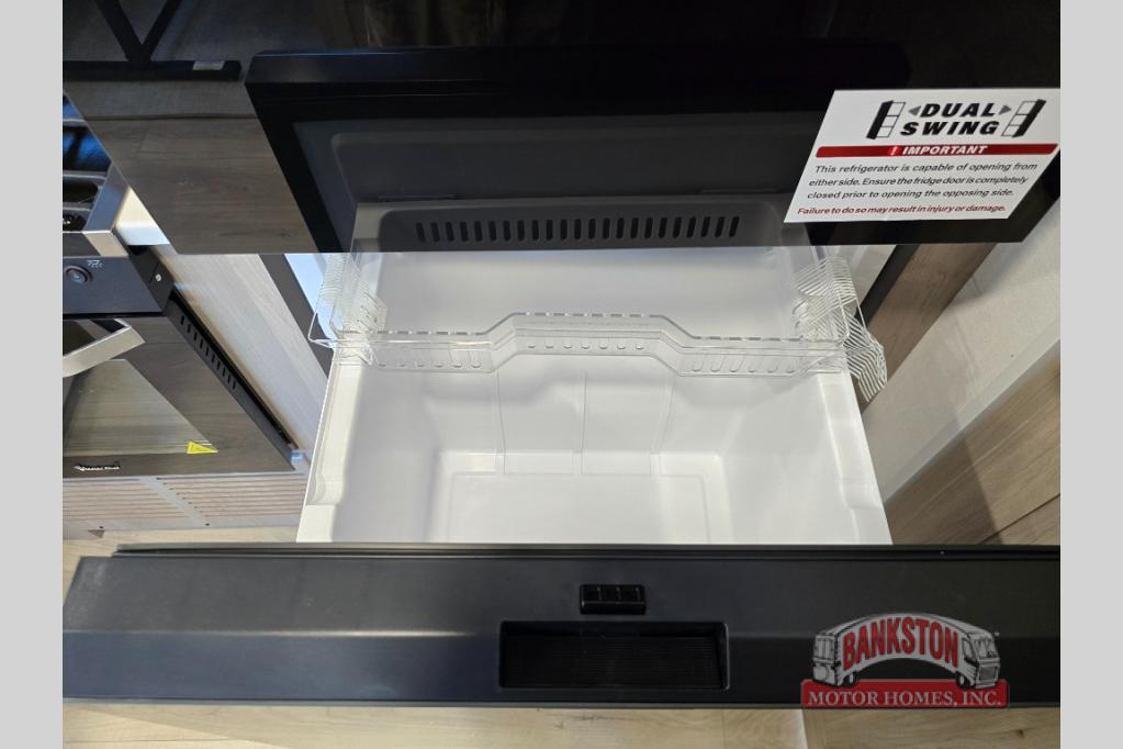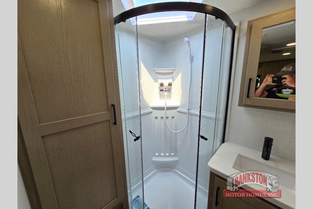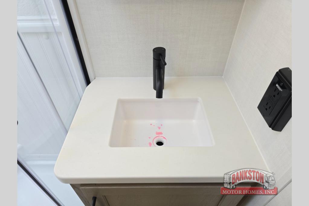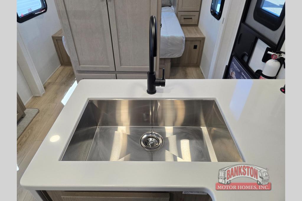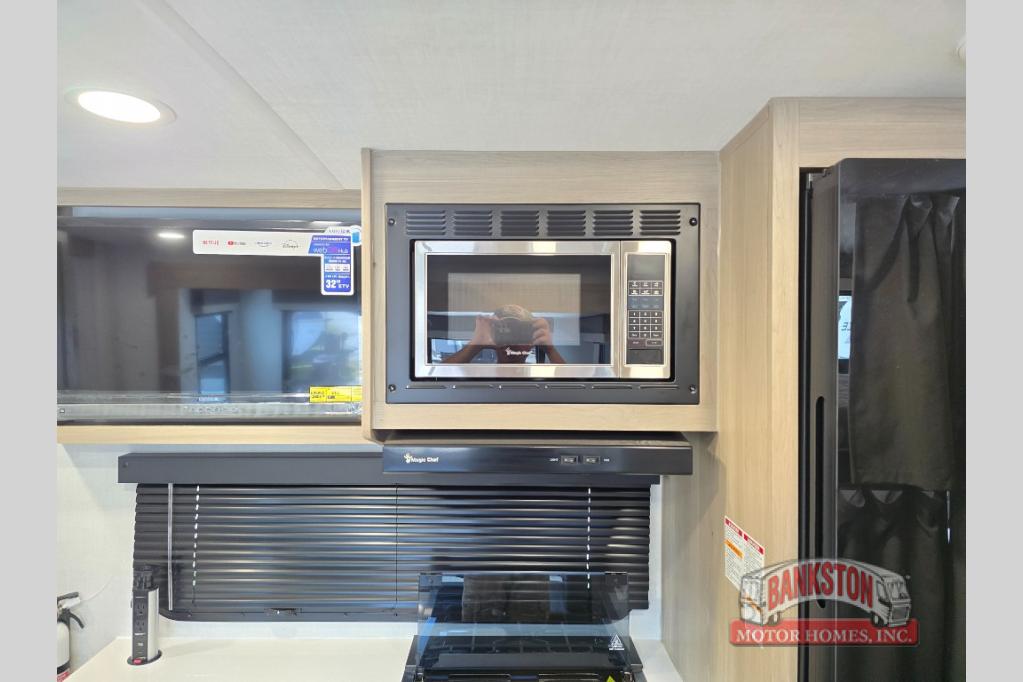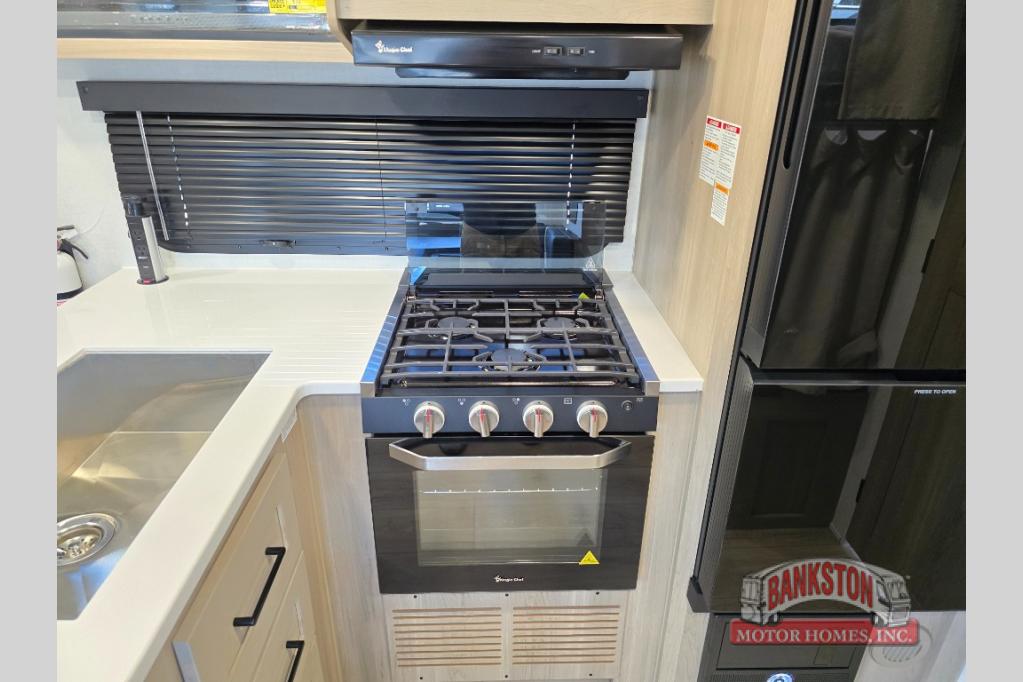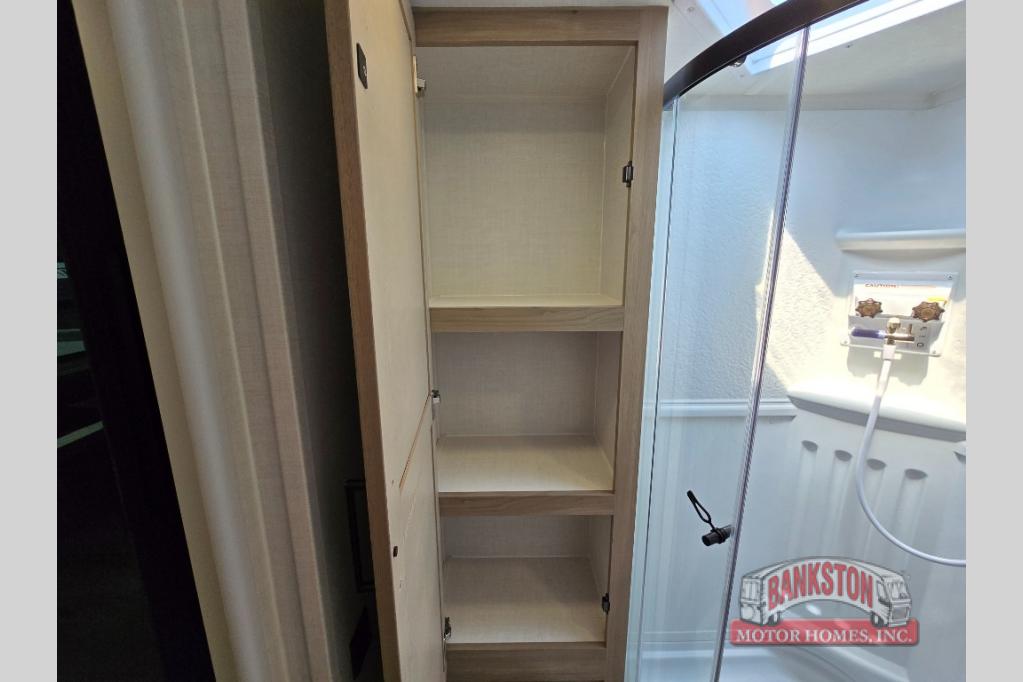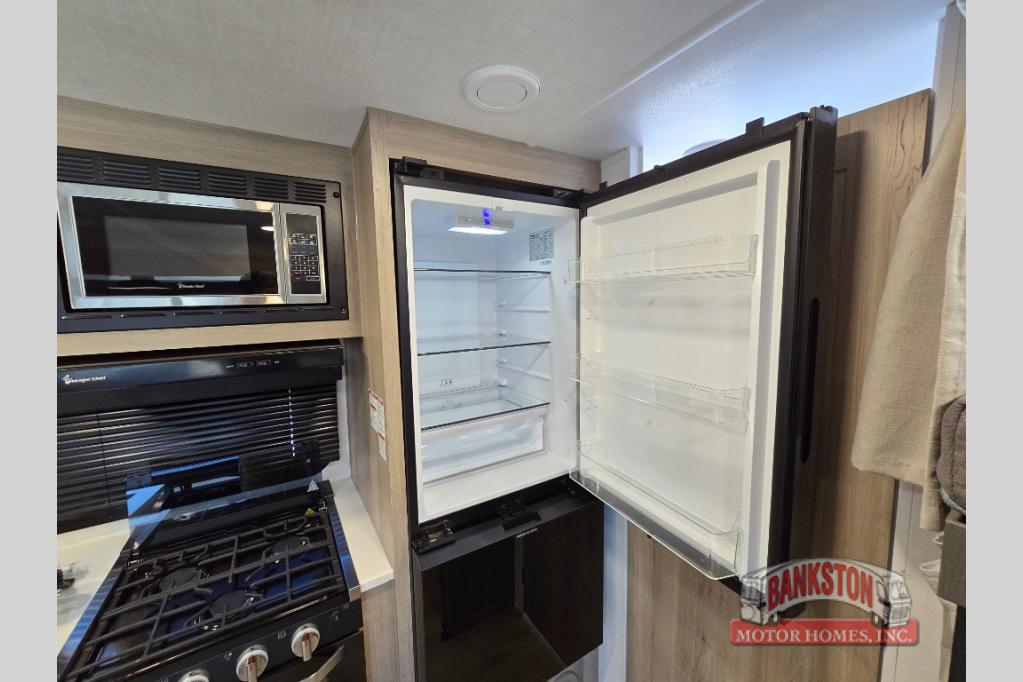 Camping in this single slide out travel trailer will make weekends at the campground comfy and hassle-free! Once you arrive, you can unload the pass-through storage, put out the 18' power awning, then make lunch on the exterior griddle. There is also a full interior kitchen to make meals when the weather isn't cooperating. Everyone can gather around the U-shaped dinette slide for meal times or game night, and there is a spacious pantry where you can store snacks! The bunk beds include a flip-up bottom bunk and an exterior bike door so you can easily pack camp gear away, and the full bath is right next to the bunks for easy nighttime use. Head up front to enjoy your own private bedroom with an RV queen bed, dual wardrobes, and flip-up storage!