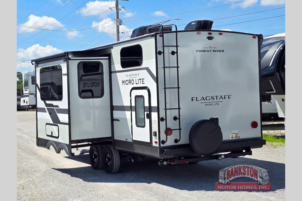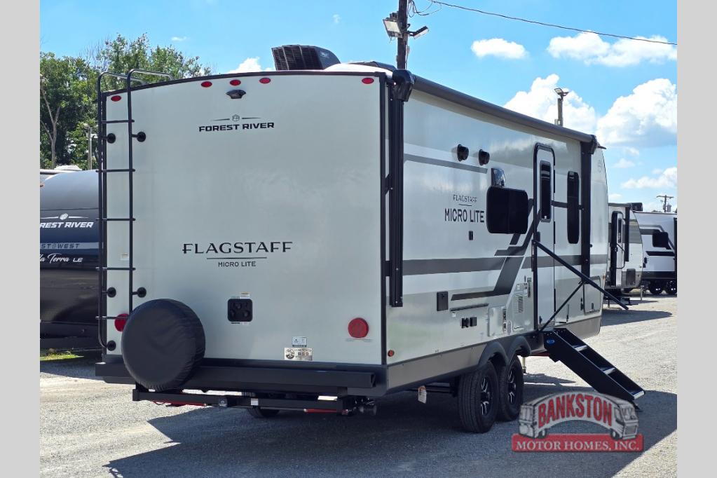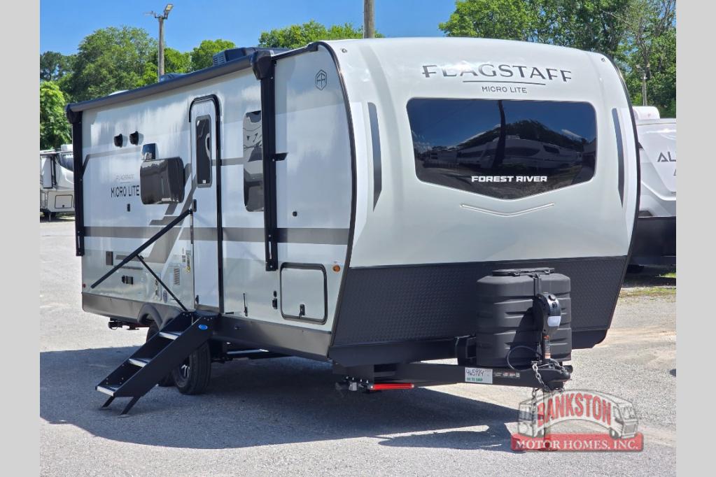 With any Flagstaff Micro Lite travel trailer by Forest River you will enjoy lightweight towing, durable construction, and added interior comforts to make each trip memorable! Each model features a torsion axle, Rubber-Ryde suspension, nitrogen filled, Goodyear Endurance tires, and easy lube axles with Nev-R-Adjust brakes for smooth towing from home to campground. The 6-sided aluminum framed construction provides a strong foundation so you can enjoy your RV for years to come, plus electronically controlled heated holding tanks and an enclosed underbelly will let you camp all year long. Head inside to find hybrid woven flooring in the slide outs, Sedona wood cabinetry, solid surface kitchen countertops, and many more amenities. These travel trailers also include exterior conveniences for hassle-free camping, like the power tongue jack, magnetic compartment door catches, Keyed Alike locks, and rear ladder to name a few!