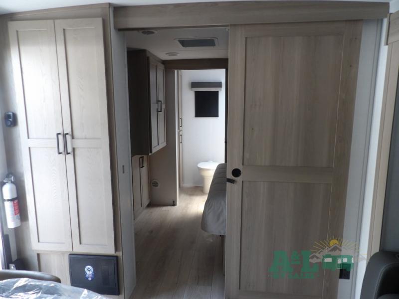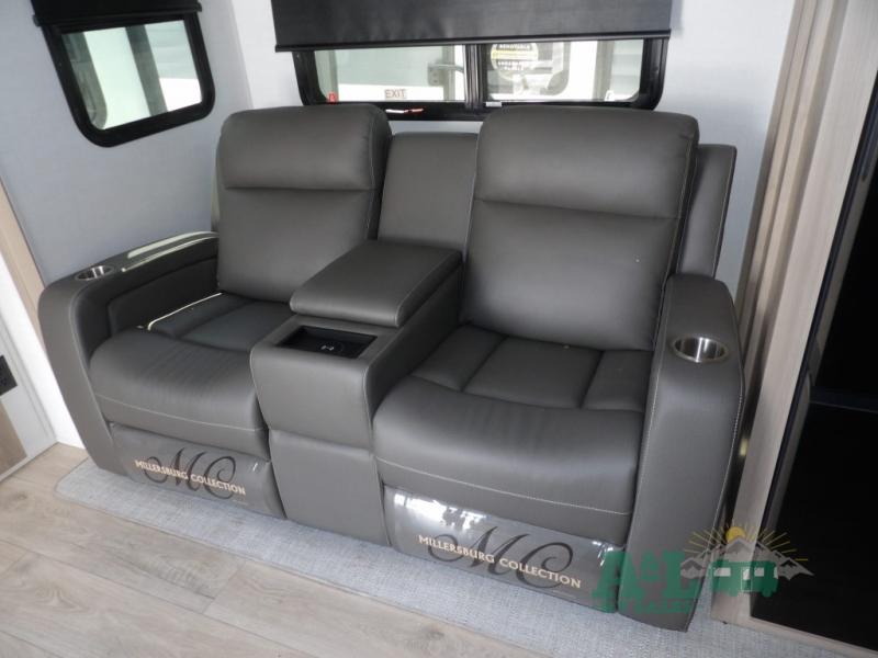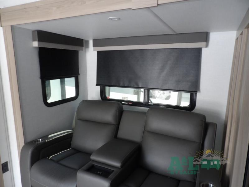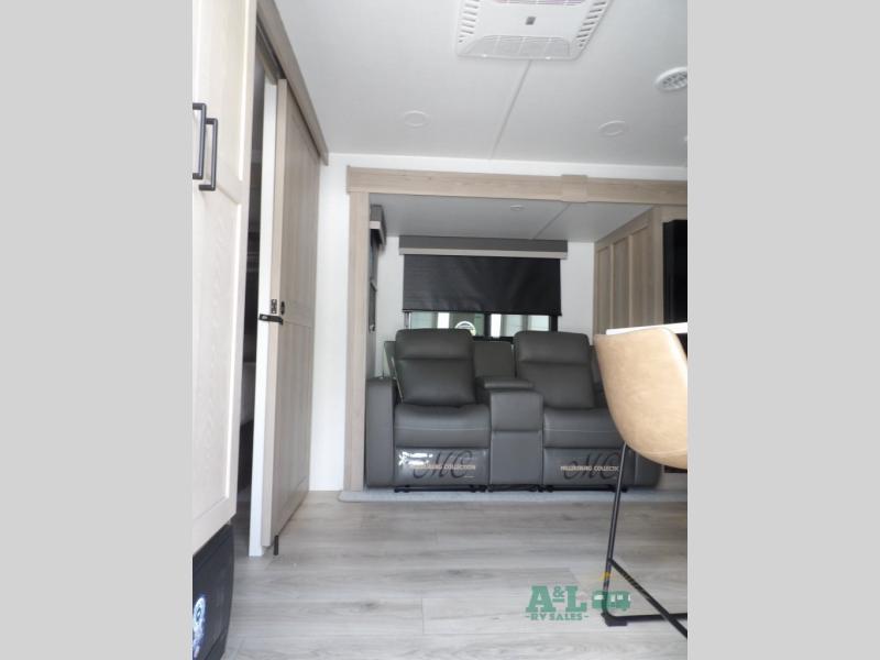 This front kitchen travel trailer is sure to make all your camping wishes come true. It's perfect for a couple since there is a master bedroom with a 60" x 80" queen bed, plus a theater seat in the main living area. If you're needing additional sleeping spaces, just choose the optional hide-a-bed sofa in place of the theater seat. The generous counter space in the kitchen will give you plenty of space to prep meals, and there is a bartop with stools where you can dine together. Along with the queen bed slide, the bedroom also includes a dresser, a TV option, plus a wardrobe with washer and dryer prep if you choose to add these appliances. And don't overlook the full rear bath to freshen up each day!