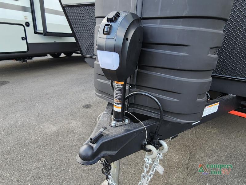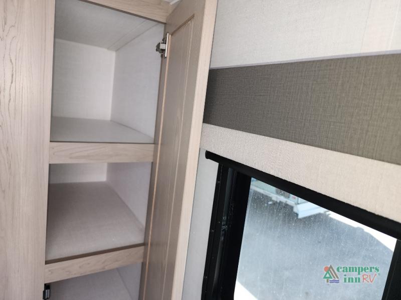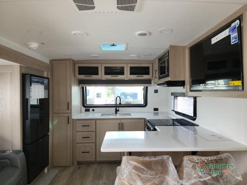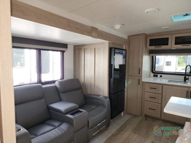 This front kitchen travel trailer is sure to make all your camping wishes come true. It's perfect for a couple since there is a master bedroom with a 60" x 80" queen bed, plus a theater seat in the main living area. If you're needing additional sleeping spaces, just choose the optional hide-a-bed sofa in place of the theater seat. The generous counter space in the kitchen will give you plenty of space to prep meals, and there is a bartop with stools where you can dine together. Along with the queen bed slide, the bedroom also includes a dresser, a TV option, plus a wardrobe with washer and dryer prep if you choose to add these appliances. And don't overlook the full rear bath to freshen up each day!
