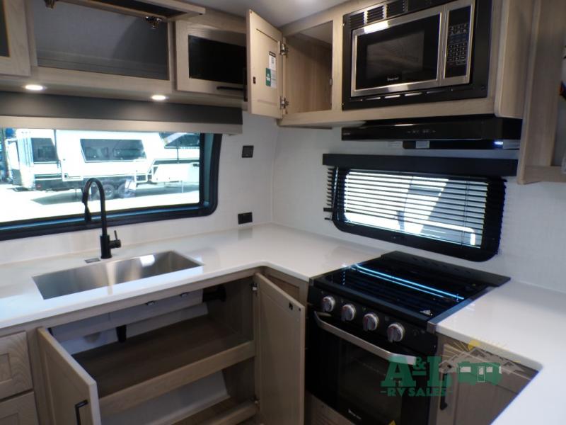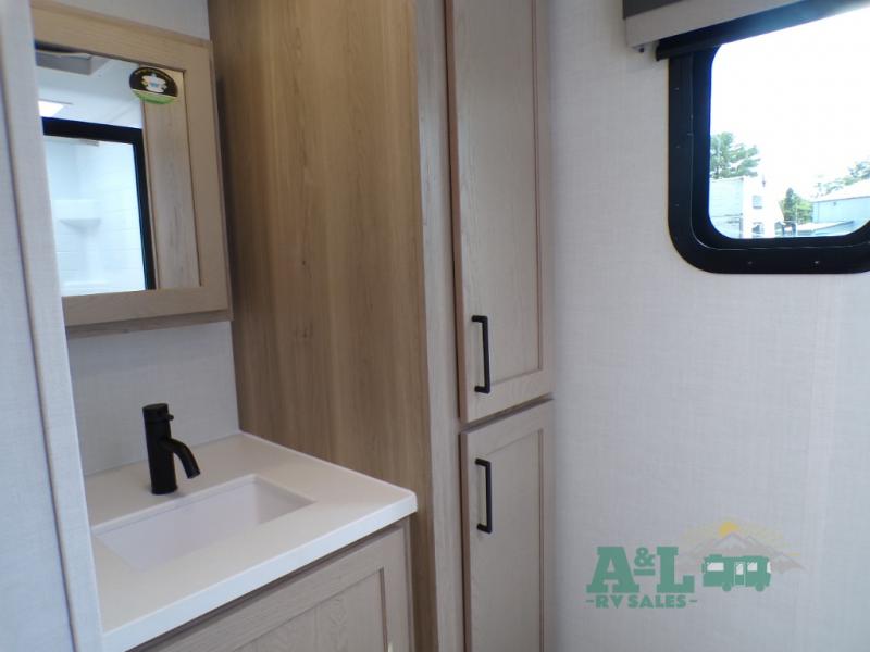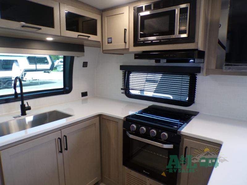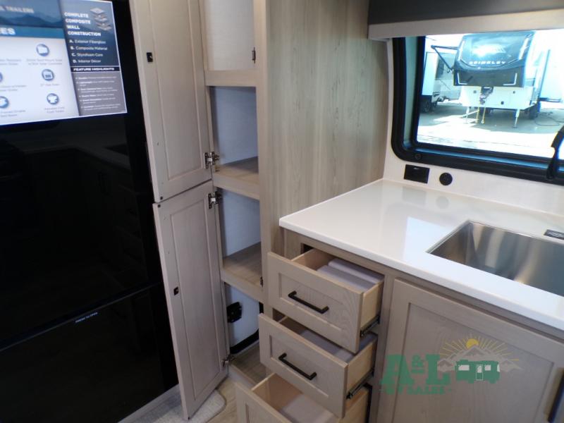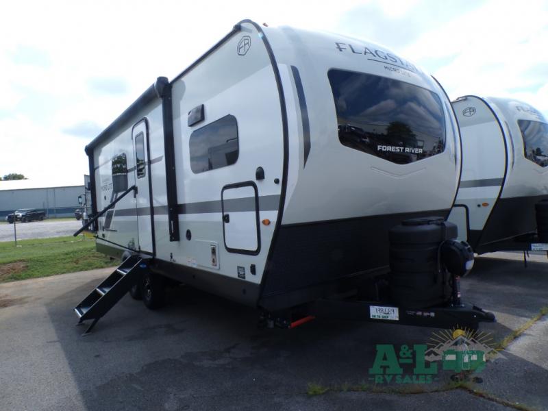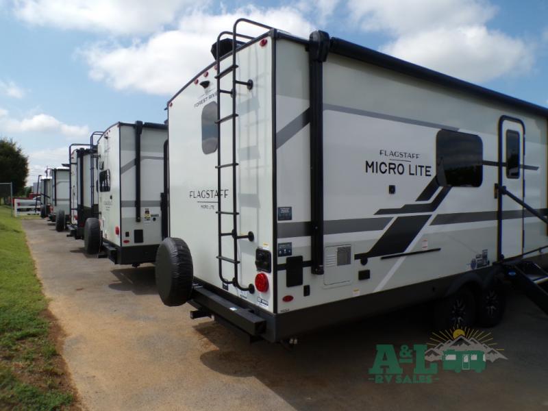 With any Flagstaff Micro Lite travel trailer by Forest River you will enjoy lightweight towing, durable construction, and added interior comforts to make each trip memorable! Each model features RoadTech tire pressure monitoring, Dexter Torflex axles, and nitrogen-filled Goodyear endurance tires for smooth towing from home to campground. The 6-sided aluminum framed construction provides a strong foundation so you can enjoy your RV for years to come, plus the radiant foil in the front cap, underbelly and slides help insulate your trailer. Additional exterior features include a 200W solar panel, back-up camera prep, frameless windows, and slam baggage doors. Each model includes the Great Expectations Package with roller shades, solid surface kitchen countertops, and hidden hinge cabinet doors. There is also an exterior hot/cold water port, outside speakers, a power tongue jack and stabilizer jacks, plus many more conveniences.