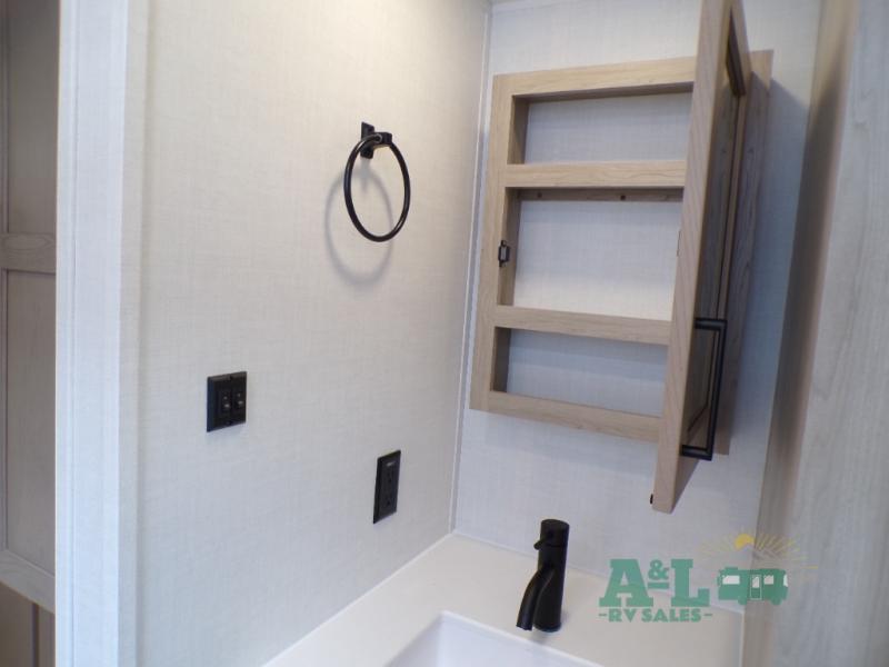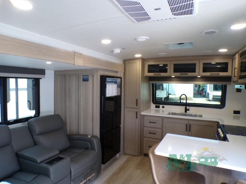 This front kitchen travel trailer is sure to make all your camping wishes come true. It's perfect for a couple since there is a master bedroom with a 60" x 80" queen bed, plus a theater seat in the main living area. If you're needing additional sleeping spaces, just choose the optional hide-a-bed sofa in place of the theater seat. The generous counter space in the kitchen will give you plenty of space to prep meals, and there is a bartop with stools where you can dine together. Along with the queen bed slide, the bedroom also includes a dresser, a TV option, plus a wardrobe with washer and dryer prep if you choose to add these appliances. And don't overlook the full rear bath to freshen up each day!