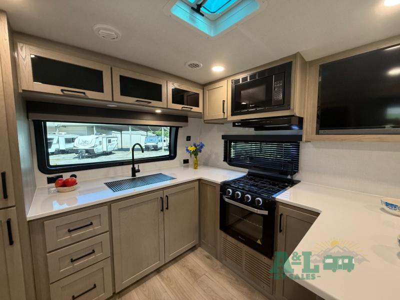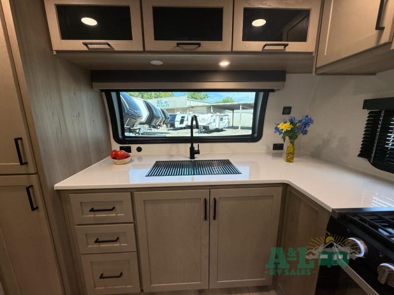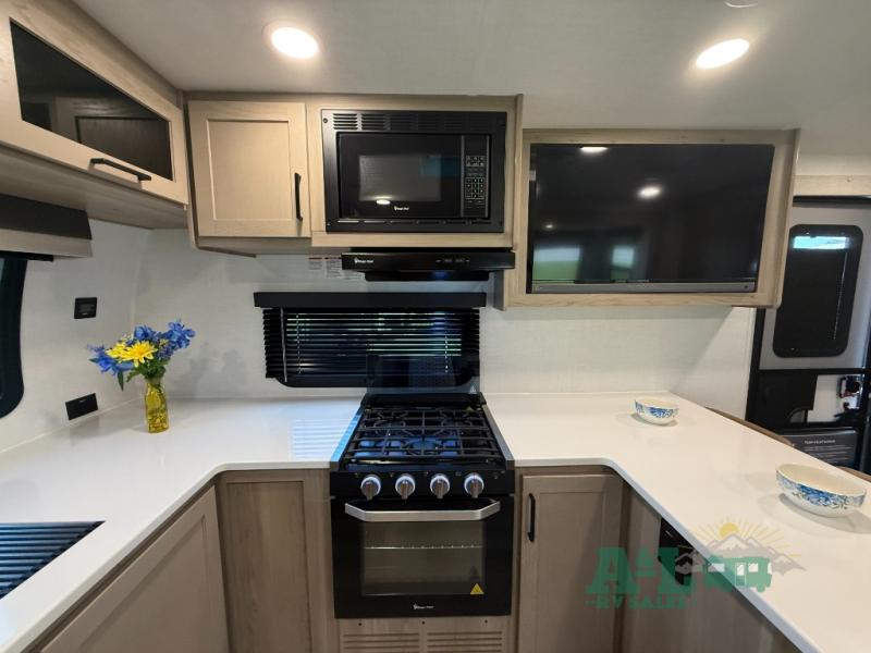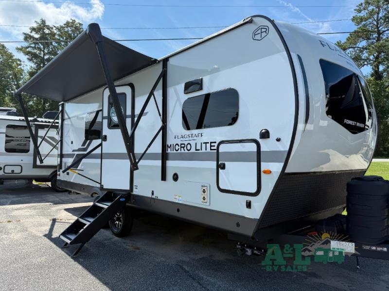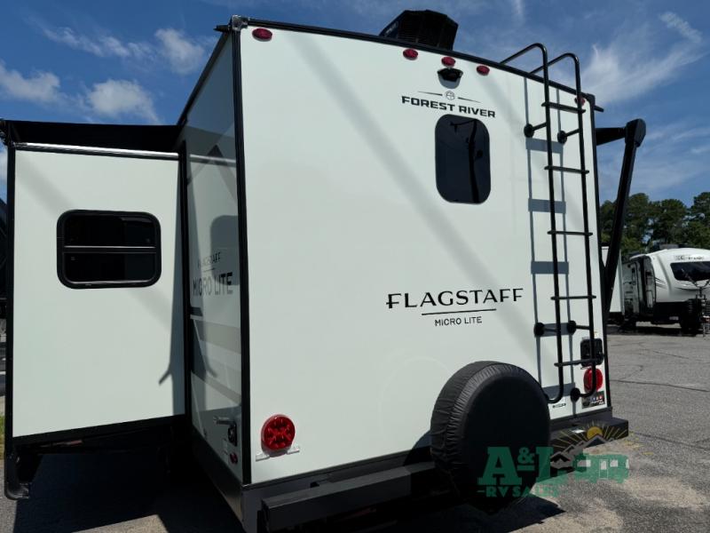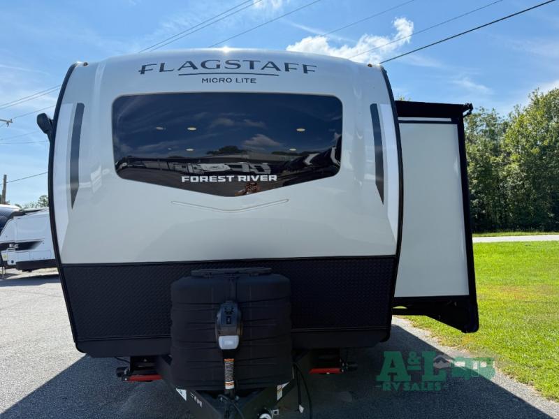 With any Flagstaff Micro Lite travel trailer by Forest River you will enjoy lightweight towing, durable construction, and added interior comforts to make each trip memorable! Each model features RoadTech tire pressure monitoring, Dexter Torflex axles, and nitrogen-filled Goodyear endurance tires for smooth towing from home to campground. The 6-sided aluminum framed construction provides a strong foundation so you can enjoy your RV for years to come, plus the radiant foil in the front cap, underbelly and slides help insulate your trailer. Additional exterior features include a 200W solar panel, back-up camera prep, frameless windows, and slam baggage doors. Each model includes the Great Expectations Package with roller shades, solid surface kitchen countertops, and hidden hinge cabinet doors. There is also an exterior hot/cold water port, outside speakers, a power tongue jack and stabilizer jacks, plus many more conveniences.