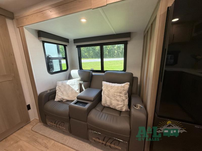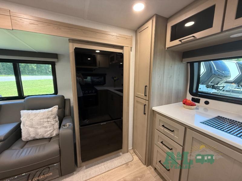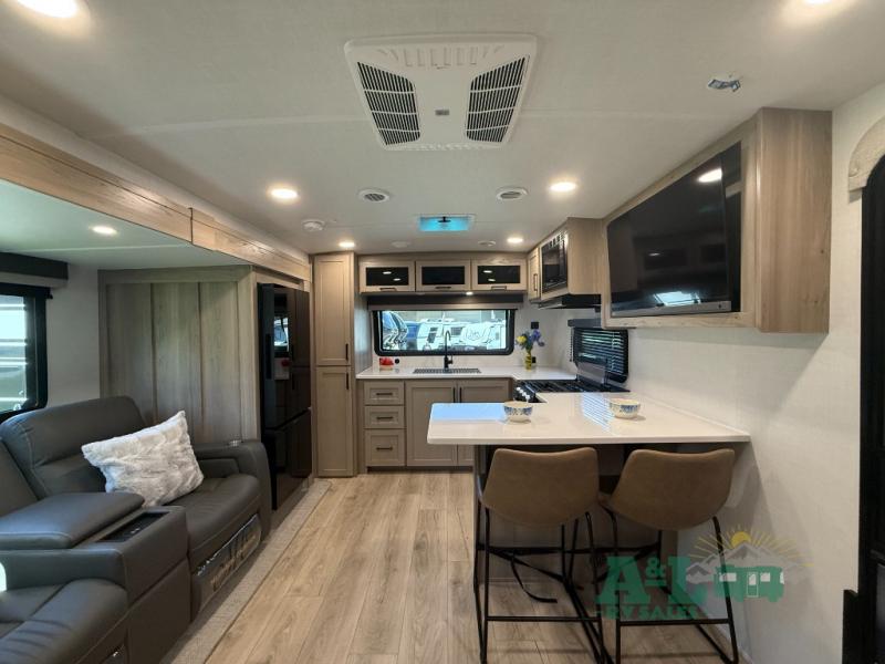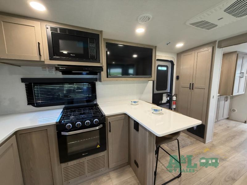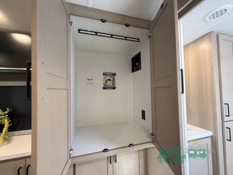 This front kitchen travel trailer is sure to make all your camping wishes come true. It's perfect for a couple since there is a master bedroom with a 60" x 80" queen bed, plus a theater seat in the main living area. If you're needing additional sleeping spaces, just choose the optional hide-a-bed sofa in place of the theater seat. The generous counter space in the kitchen will give you plenty of space to prep meals, and there is a bartop with stools where you can dine together. Along with the queen bed slide, the bedroom also includes a dresser, a TV option, plus a wardrobe with washer and dryer prep if you choose to add these appliances. And don't overlook the full rear bath to freshen up each day!