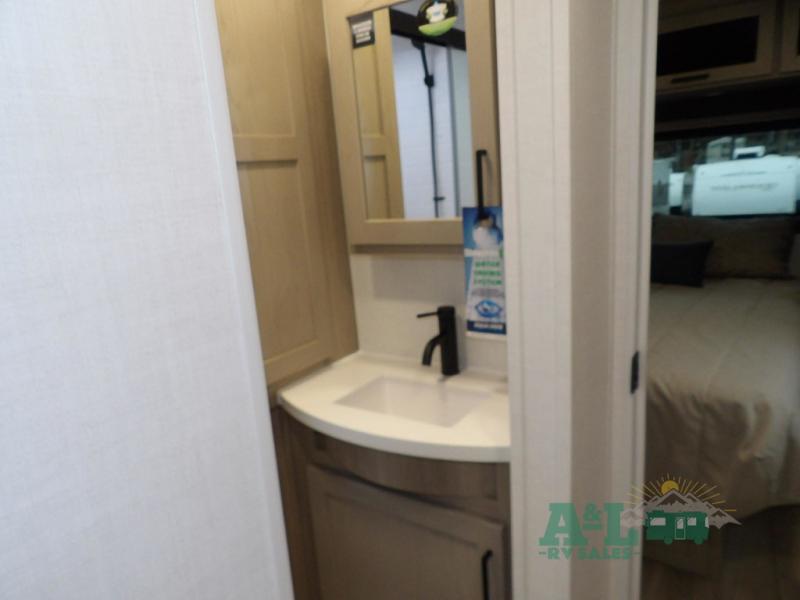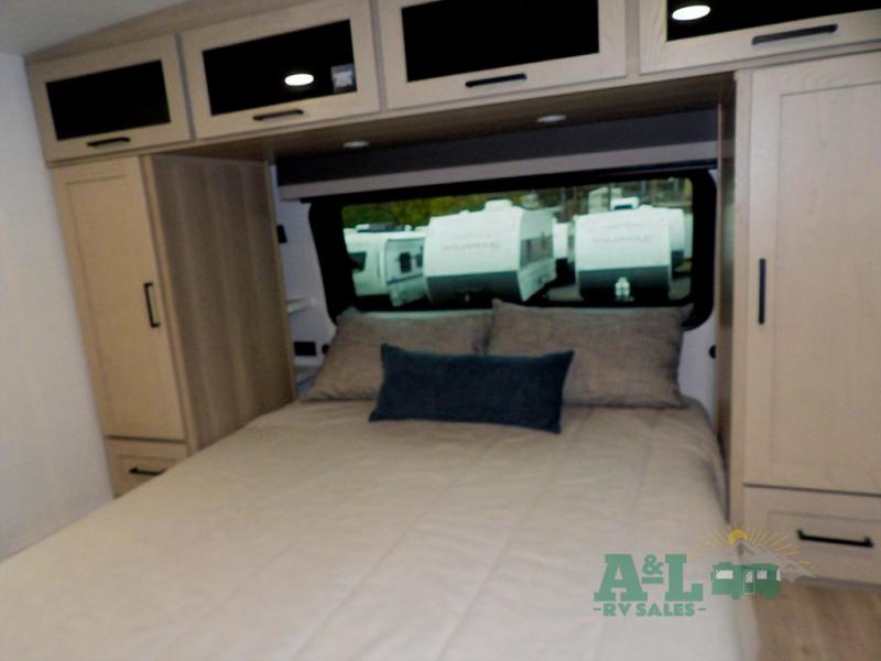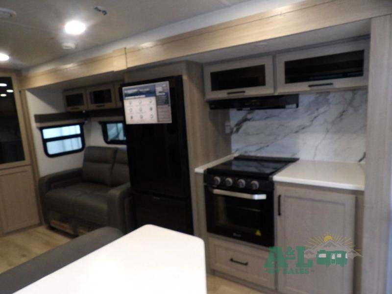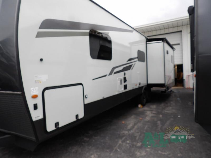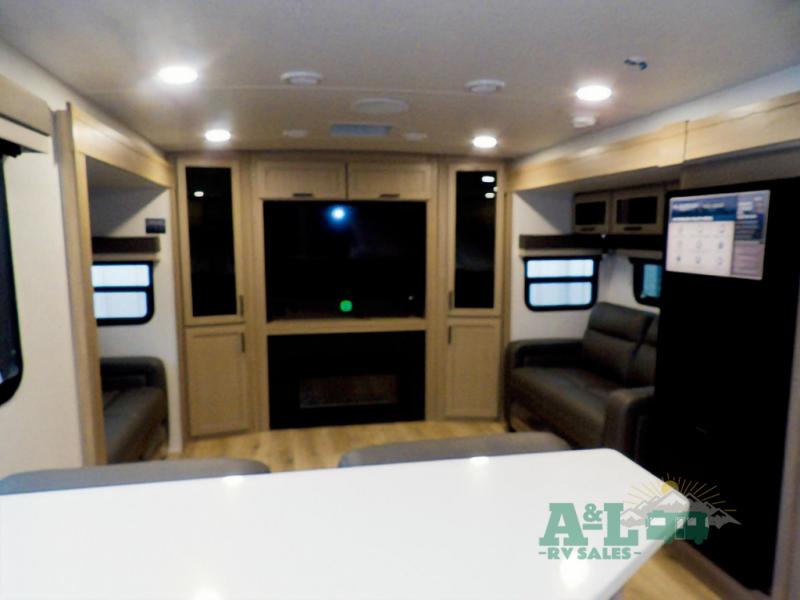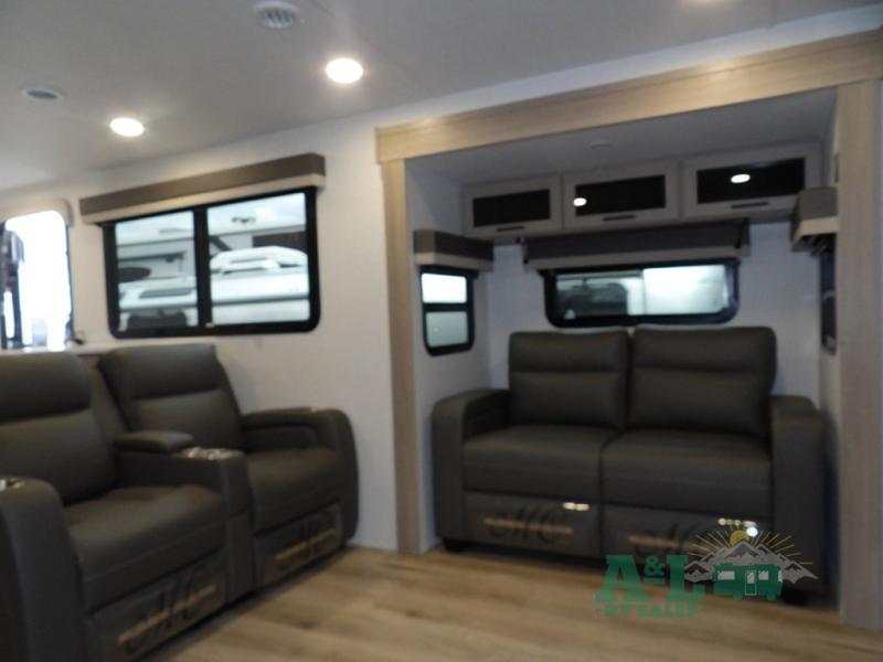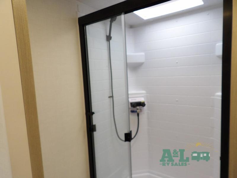 Weekends at the lake are made easy in this spacious travel trailer that can sleep six each night. Once you arrive at the campsite, unload your things from the pass-thru storage with an optional steel sliding tray, set up the 19' power awning, then head out on a trail to stretch your legs. You can freshen up in the full bath when you return before preparing lunch for everyone. A three burner cooktop comes standard, along with a gas oven and microwave oven, and there is a table with bar stools that overlooks the rear living area for those who want to relax. Your guests can convert the rear living area into their bedroom at night since there are dual hide-a-bed sofas, and the rear entertainment center includes a Smart TV so they can watch a movie in bed. And check out the private bedroom with a queen bed, triple wardrobes, and a TV option if you enjoy watching movies in bed.