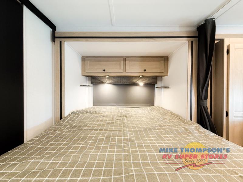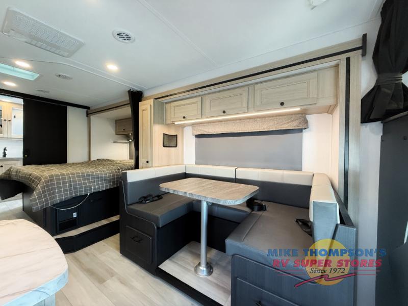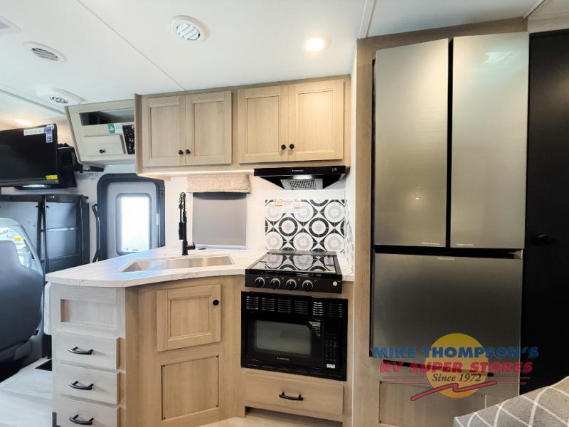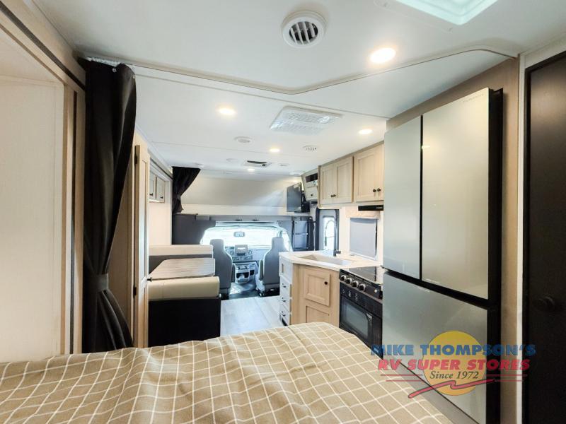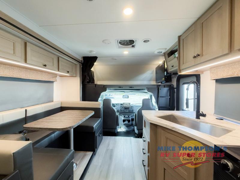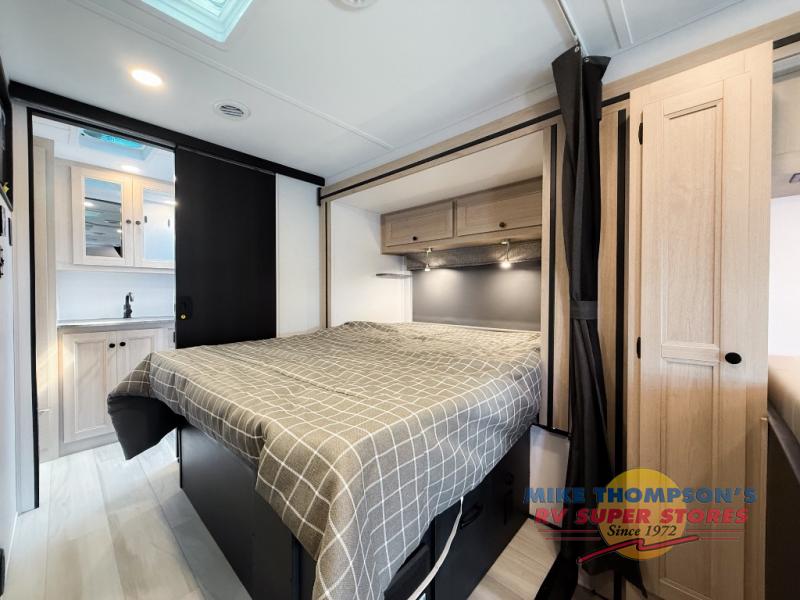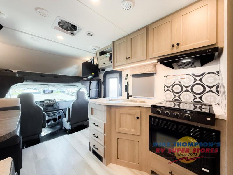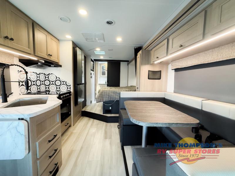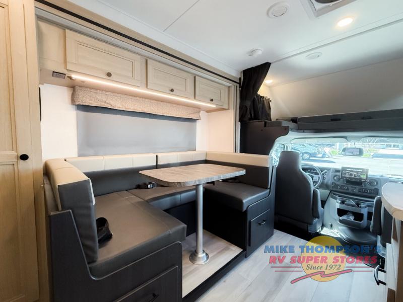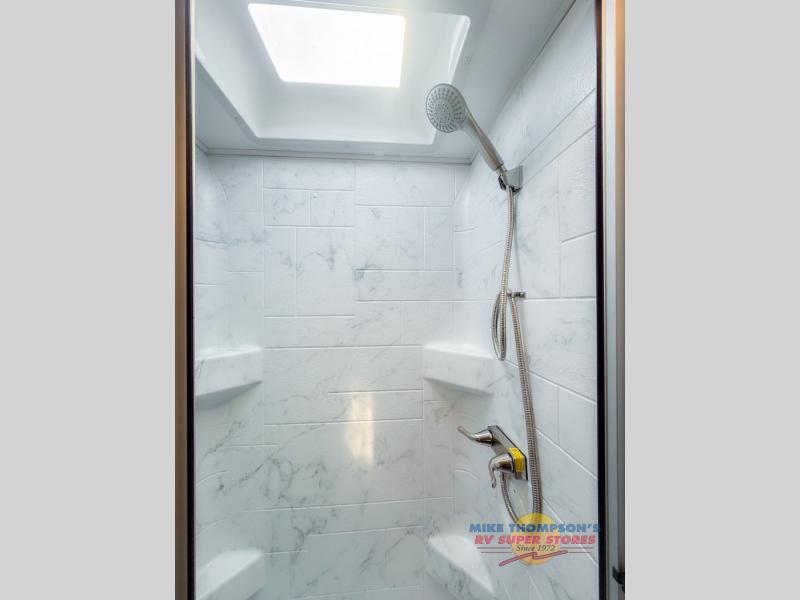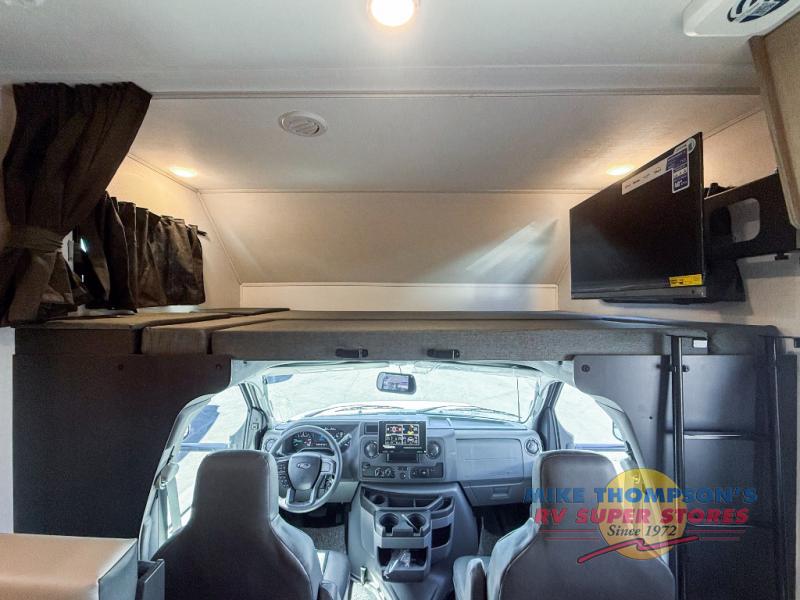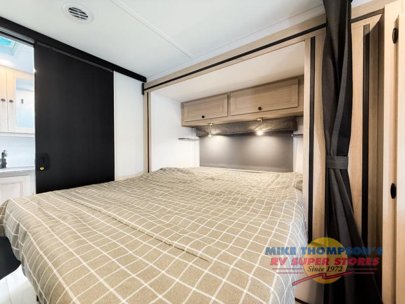 You will feel right at home traveling in this motorhome! The full rear bathroom has a 24" x 36" shower to freshen up in, plus storage space and a private toilet so you both can use this room at once. Inside the bedroom is a 60" x 74" queen bed slide with a wedge mattress for more space, and a 12V TV for movies in bed. Prepare your best meals with the three burner cooktop and the 10.7 cu. ft. 12V refrigerator or throw some leftovers in the undermount 1.3 cu. ft. convection microwave, then enjoy it at the U-shaped dinette slide. The 60" x 80" bunk over cab mat offers a comfortable place to sleep but if you don't need the extra sleeping space, you can switch it out for the optional Trekker cap with a built-in entertainment center, plus there is an optional outside 12V TV to add!