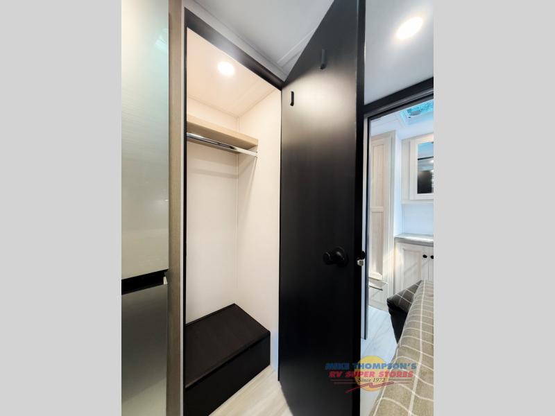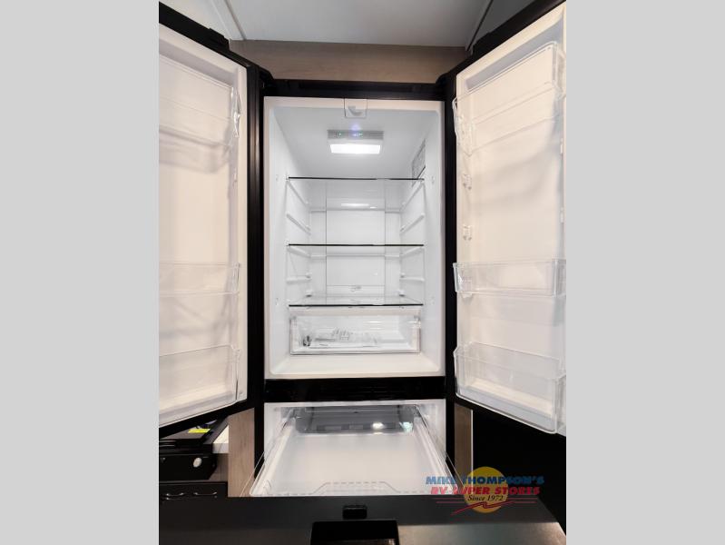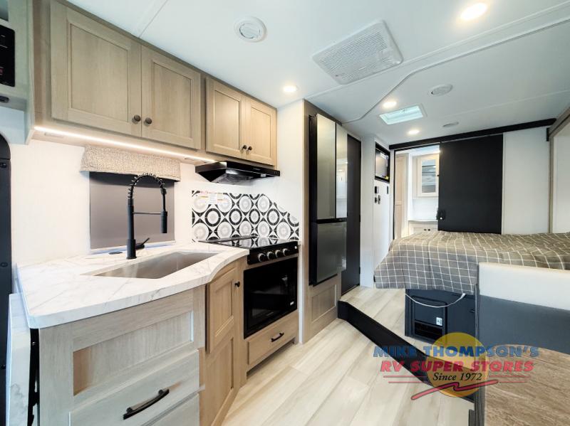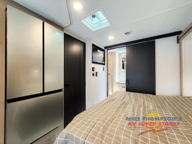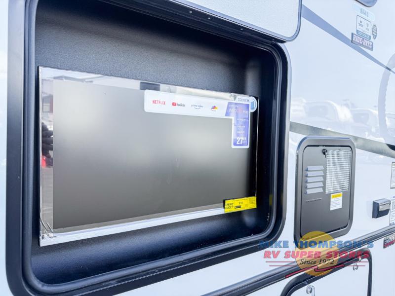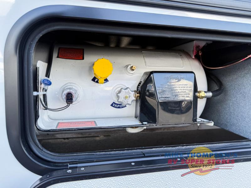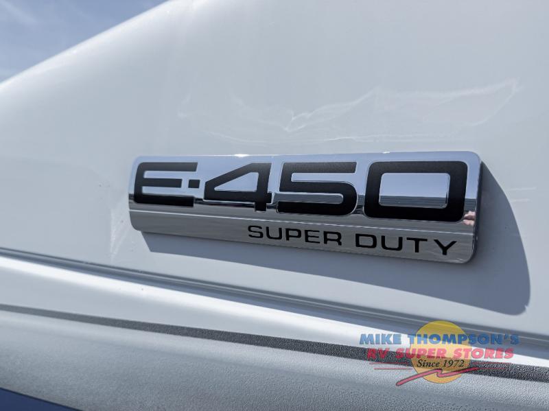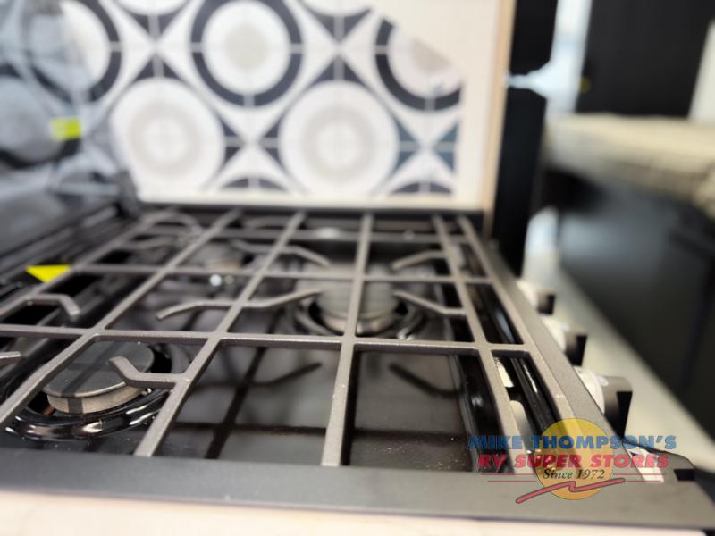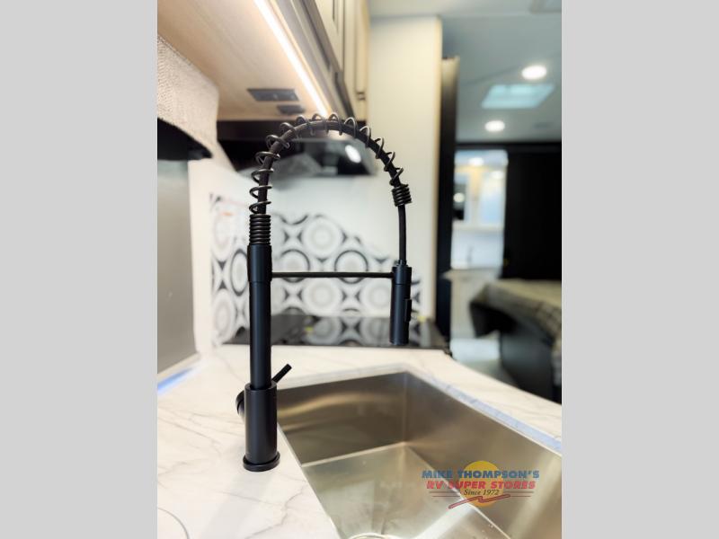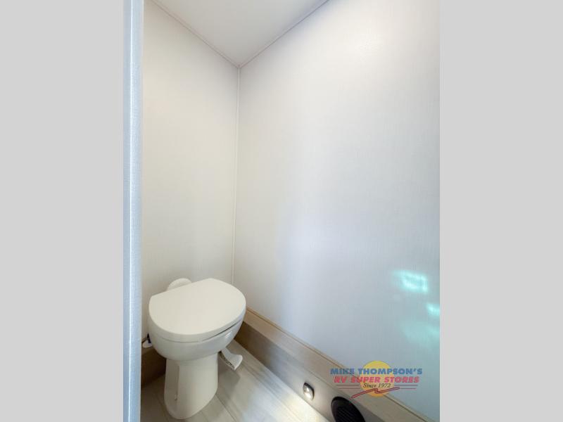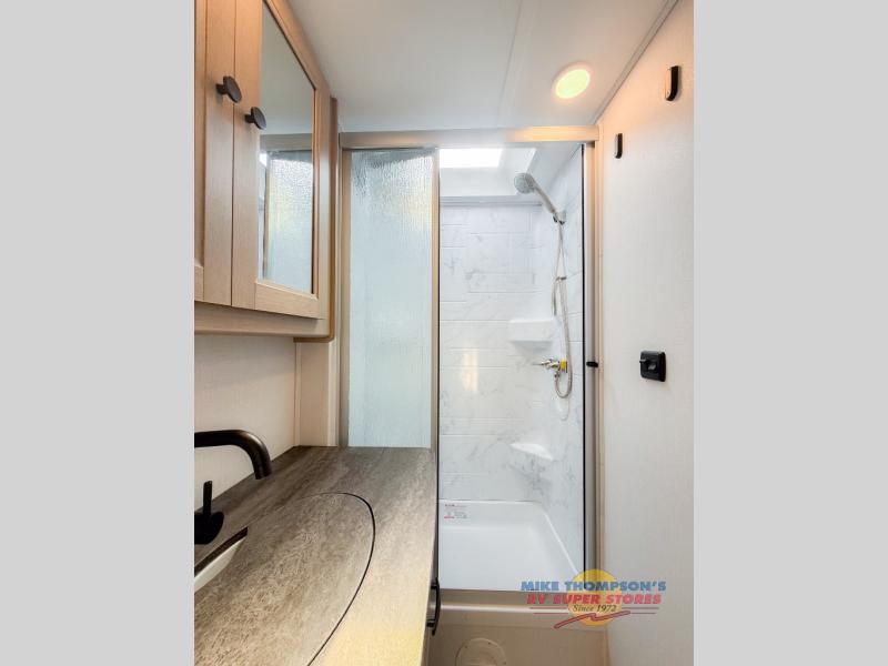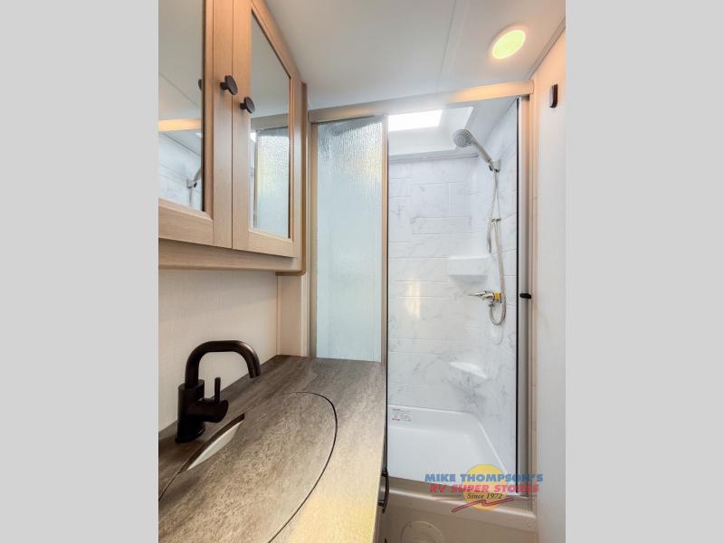 You will feel right at home traveling in this motorhome! The full rear bathroom has a 24" x 36" shower to freshen up in, plus storage space and a private toilet so you both can use this room at once. Inside the bedroom is a 60" x 74" queen bed slide with a wedge mattress for more space, and a 12V TV for movies in bed. Prepare your best meals with the three burner cooktop and the 10.7 cu. ft. 12V refrigerator or throw some leftovers in the undermount 1.3 cu. ft. convection microwave, then enjoy it at the U-shaped dinette slide. The 60" x 80" bunk over cab mat offers a comfortable place to sleep but if you don't need the extra sleeping space, you can switch it out for the optional Trekker cap with a built-in entertainment center, plus there is an optional outside 12V TV to add!