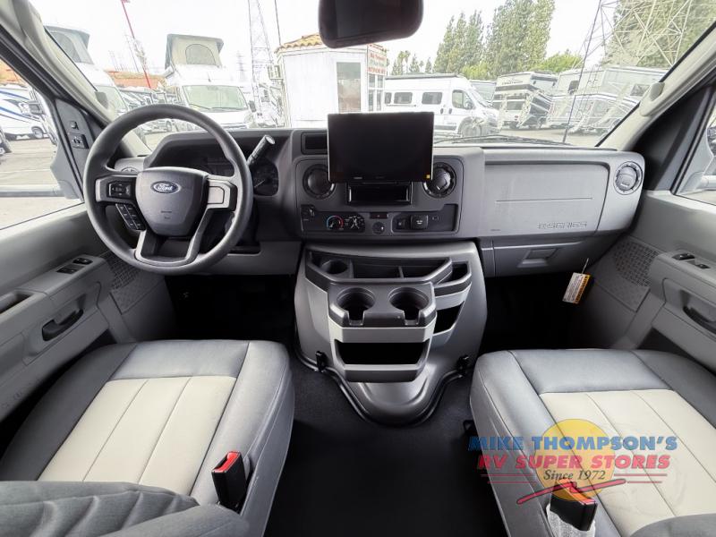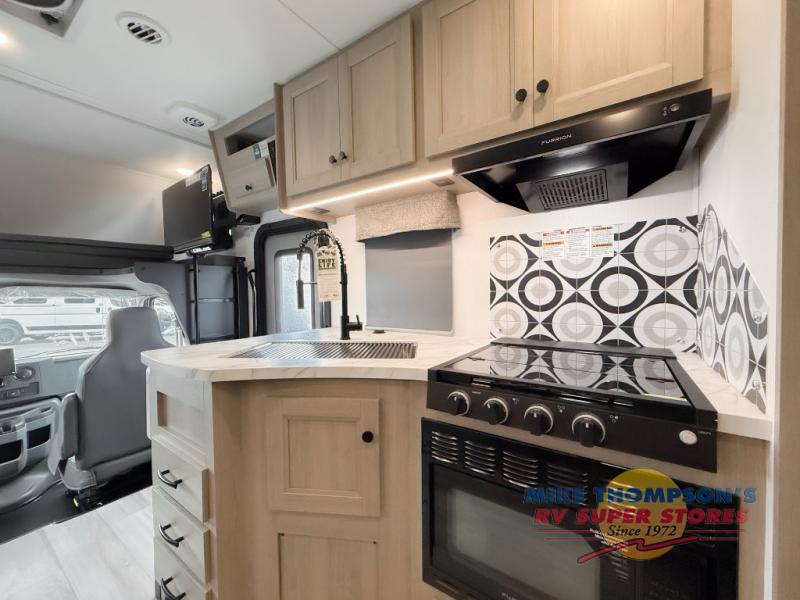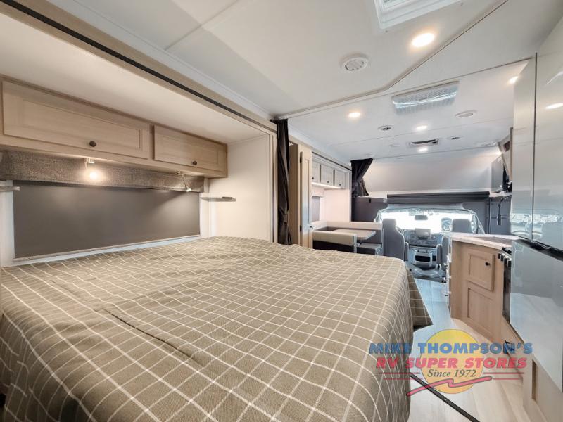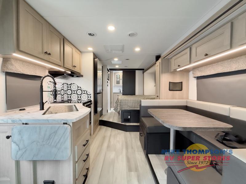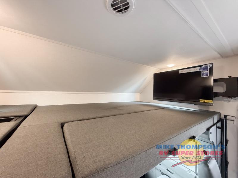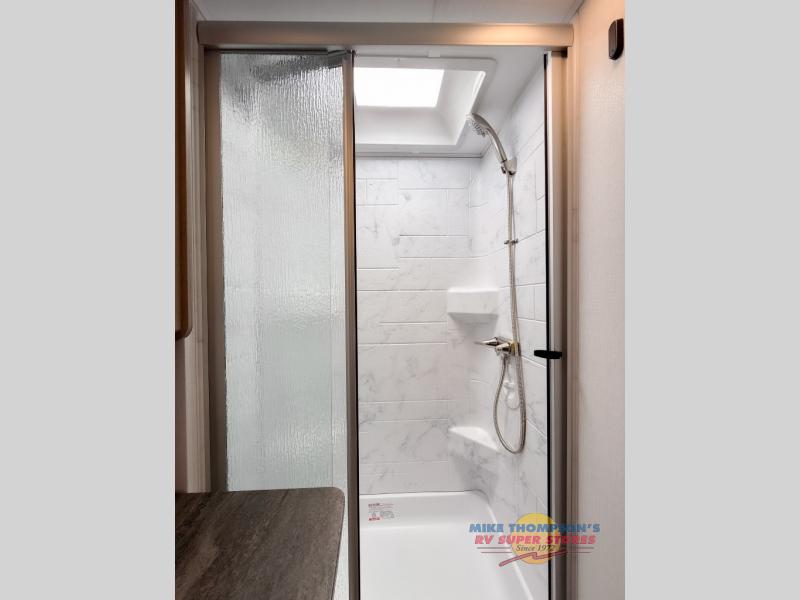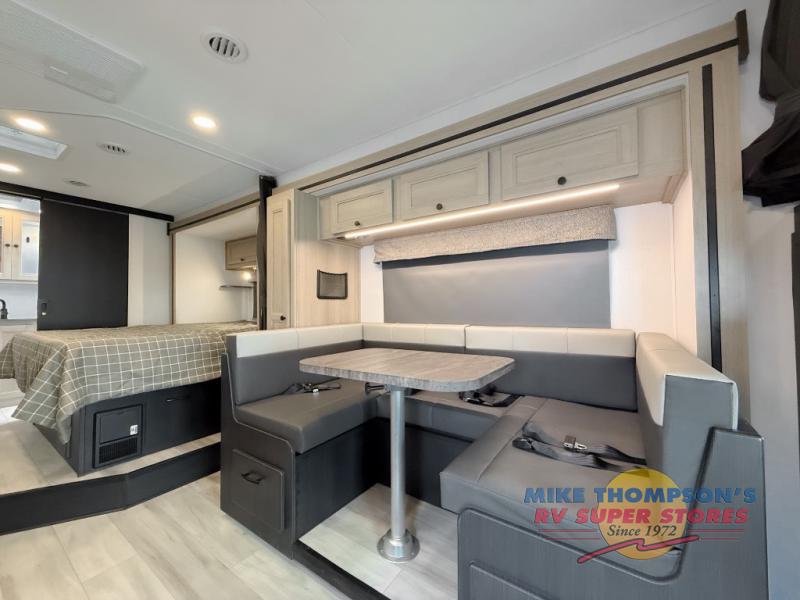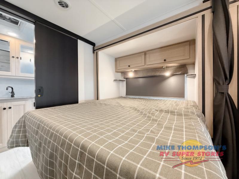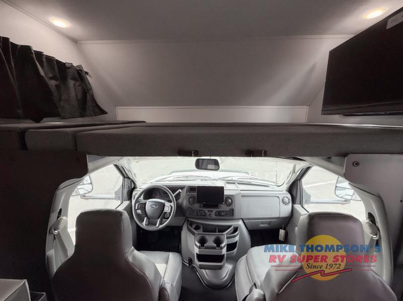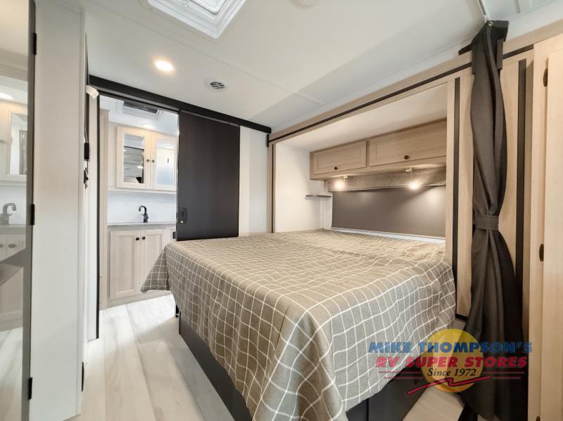 You will feel right at home traveling in this motorhome! The full rear bathroom has a 24" x 36" shower to freshen up in, plus storage space and a private toilet so you both can use this room at once. Inside the bedroom is a 60" x 74" queen bed slide with a wedge mattress for more space, and a 12V TV for movies in bed. Prepare your best meals with the three burner cooktop and the 10.7 cu. ft. 12V refrigerator or throw some leftovers in the undermount 1.3 cu. ft. convection microwave, then enjoy it at the U-shaped dinette slide. The 60" x 80" bunk over cab mat offers a comfortable place to sleep but if you don't need the extra sleeping space, you can switch it out for the optional Trekker cap with a built-in entertainment center, plus there is an optional outside 12V TV to add!
