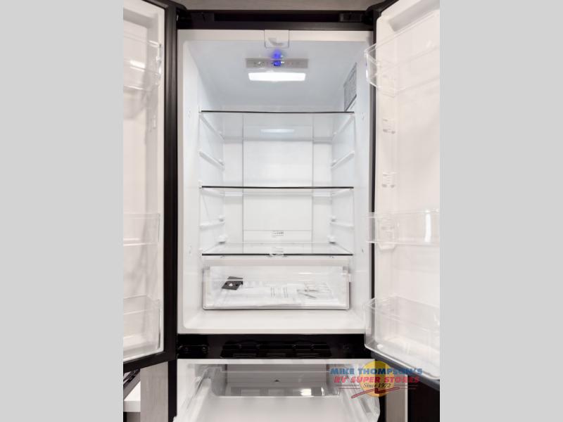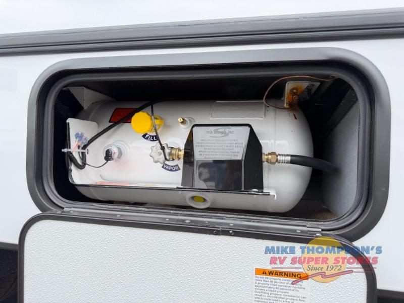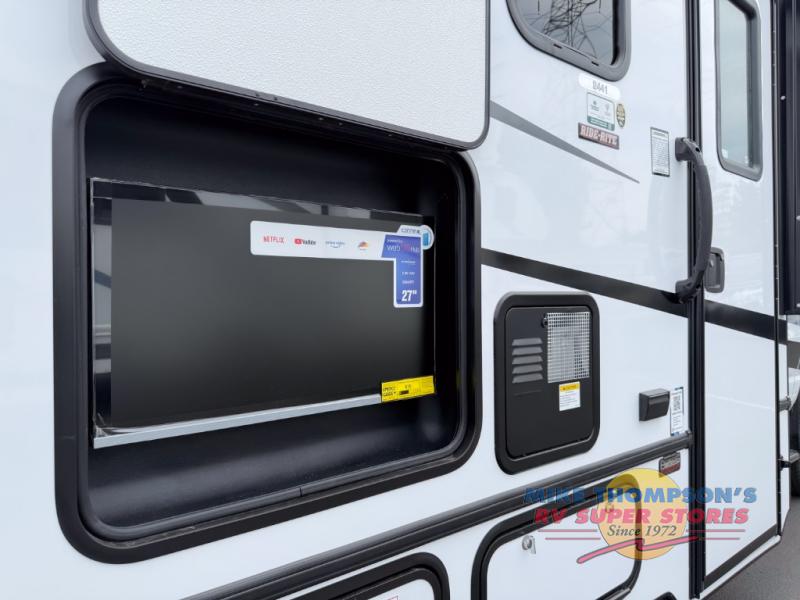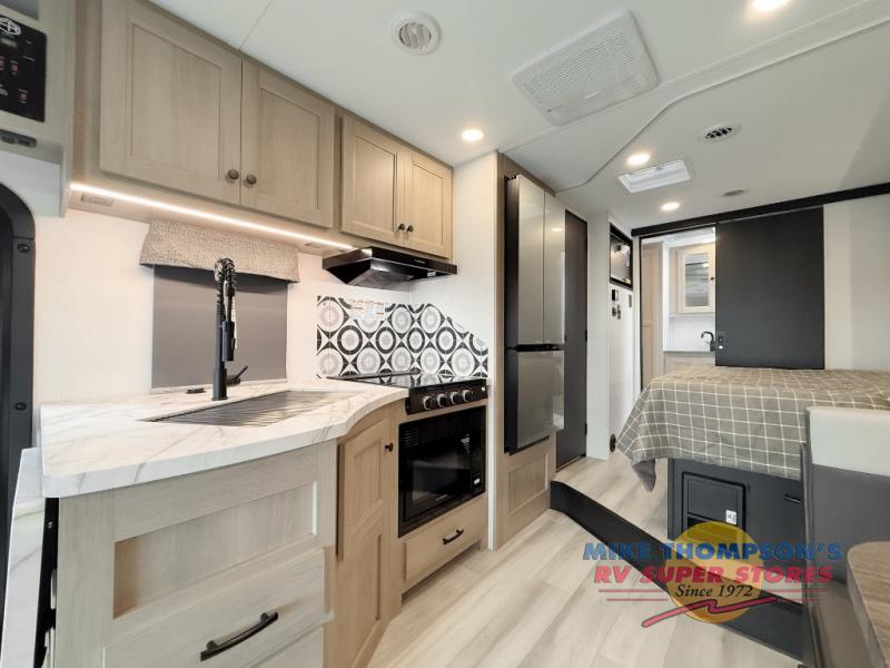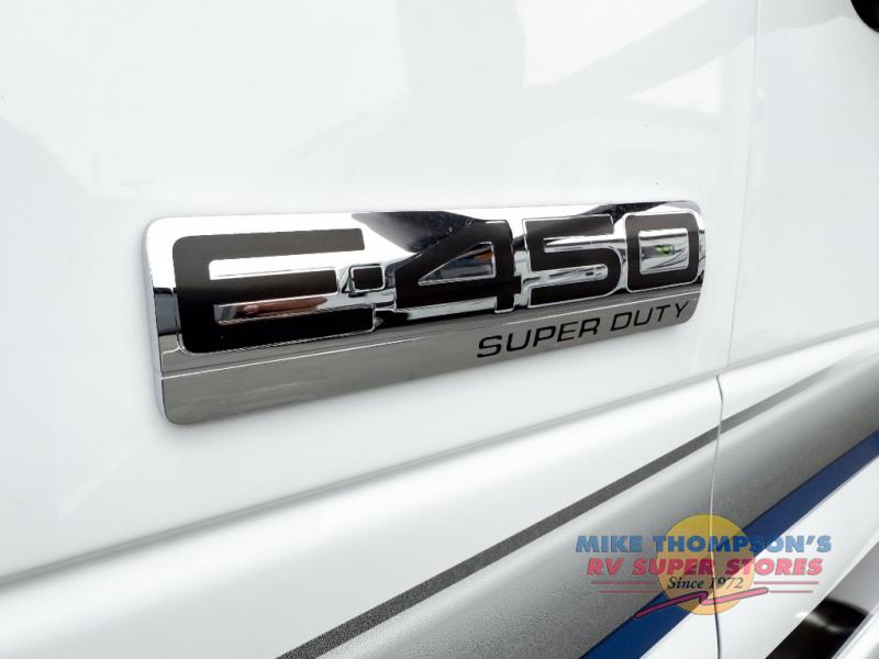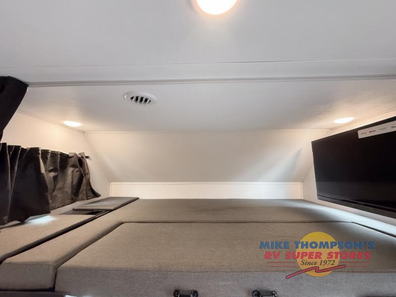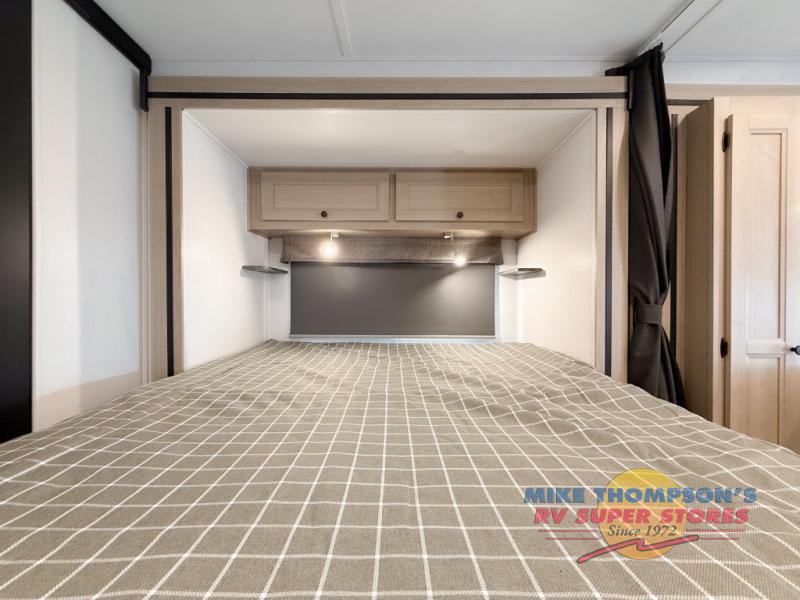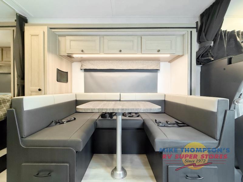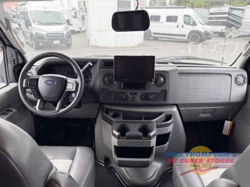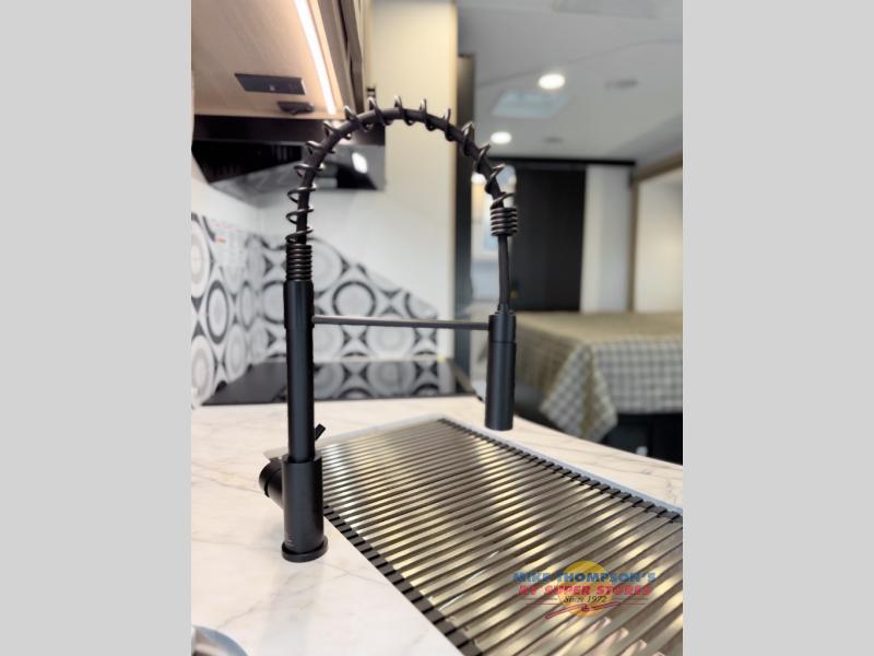 You will feel right at home traveling in this motorhome! The full rear bathroom has a 24" x 36" shower to freshen up in, plus storage space and a private toilet so you both can use this room at once. Inside the bedroom is a 60" x 74" queen bed slide with a wedge mattress for more space, and a 12V TV for movies in bed. Prepare your best meals with the three burner cooktop and the 10.7 cu. ft. 12V refrigerator or throw some leftovers in the undermount 1.3 cu. ft. convection microwave, then enjoy it at the U-shaped dinette slide. The 60" x 80" bunk over cab mat offers a comfortable place to sleep but if you don't need the extra sleeping space, you can switch it out for the optional Trekker cap with a built-in entertainment center, plus there is an optional outside 12V TV to add!