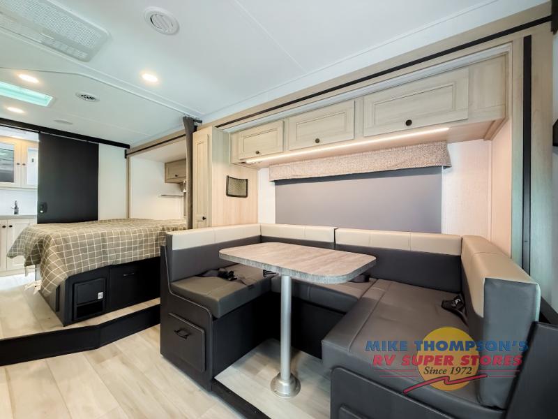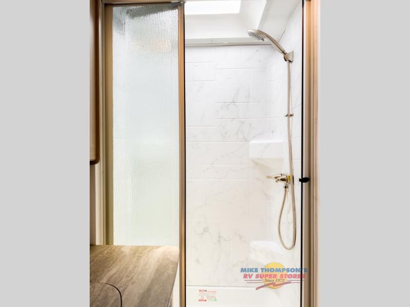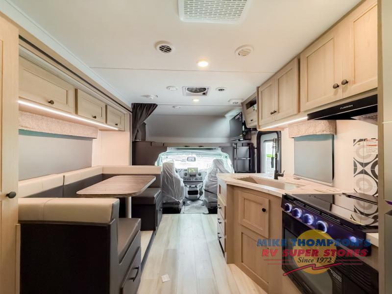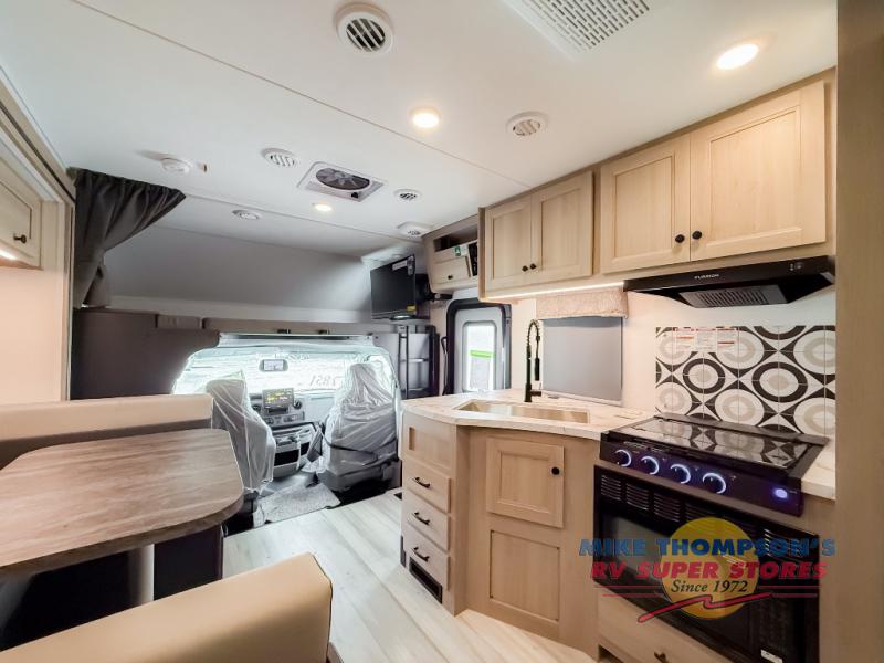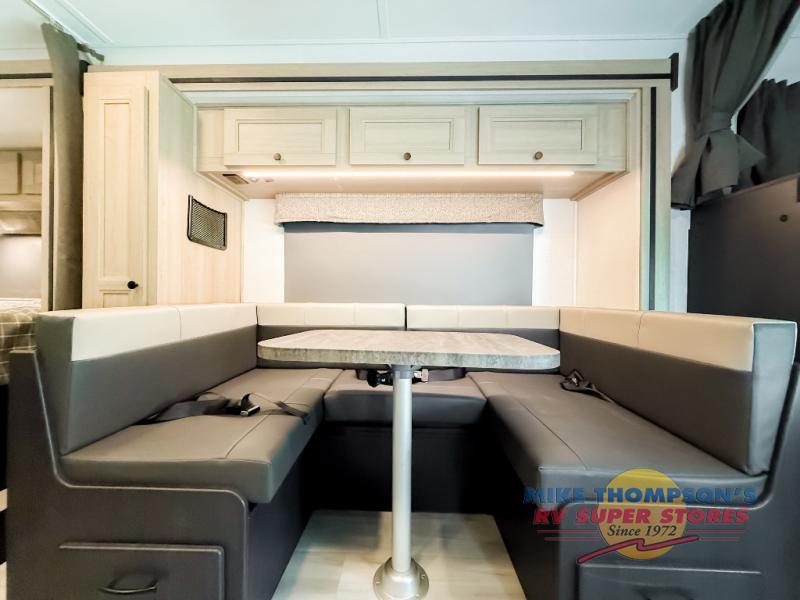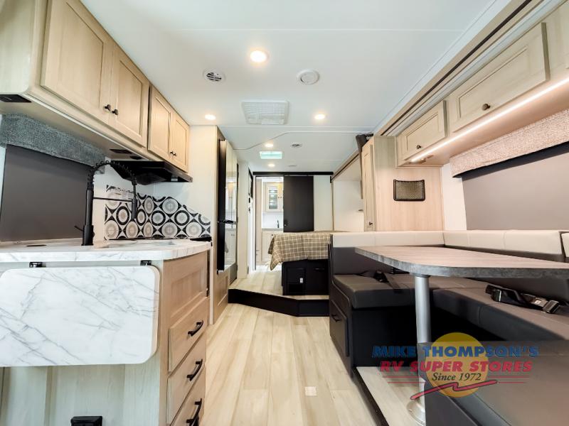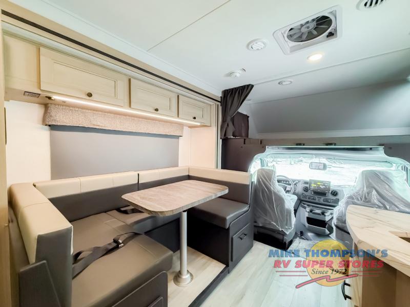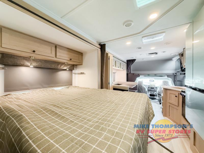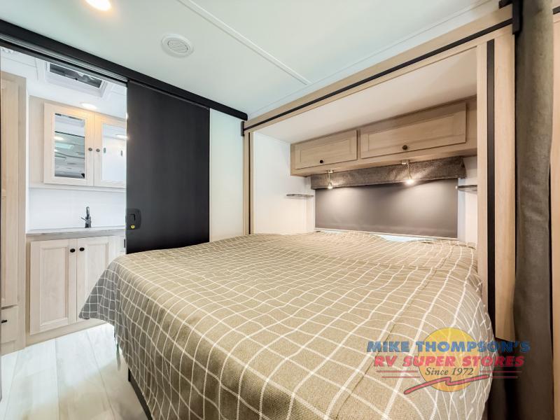 You will feel right at home traveling in this motorhome! The full rear bathroom has a 24" x 36" shower to freshen up in, plus storage space and a private toilet so you both can use this room at once. Inside the bedroom is a 60" x 74" queen bed slide with a wedge mattress for more space, and a 12V TV for movies in bed. Prepare your best meals with the three burner cooktop and the 10.7 cu. ft. 12V refrigerator or throw some leftovers in the undermount 1.3 cu. ft. convection microwave, then enjoy it at the U-shaped dinette slide. The 60" x 80" bunk over cab mat offers a comfortable place to sleep but if you don't need the extra sleeping space, you can switch it out for the optional Trekker cap with a built-in entertainment center, plus there is an optional outside 12V TV to add!