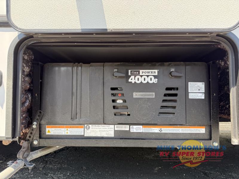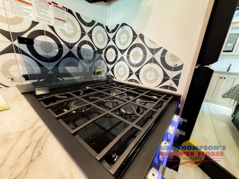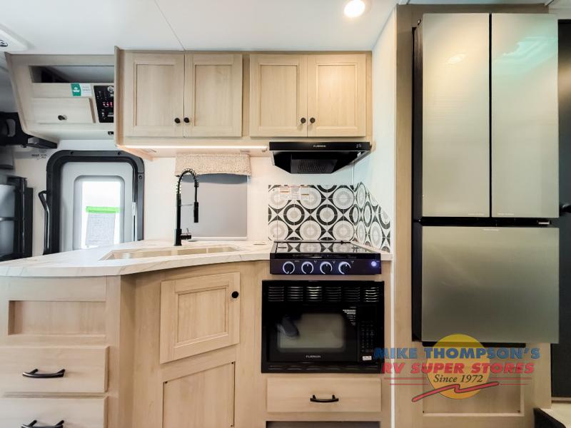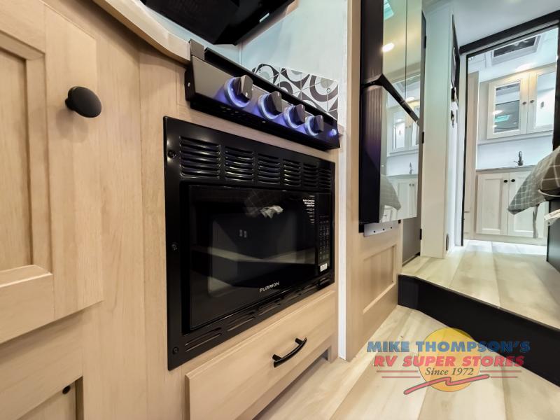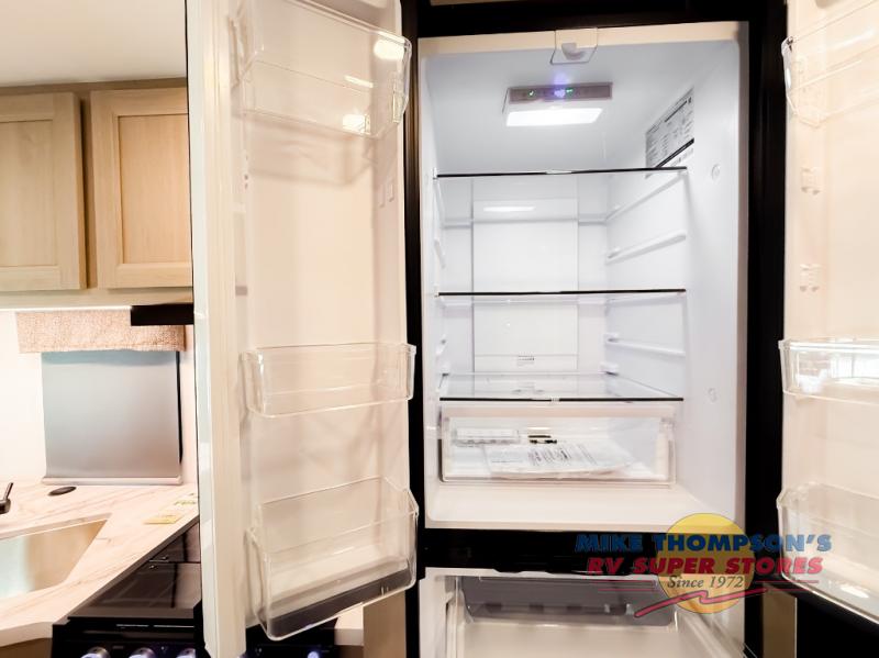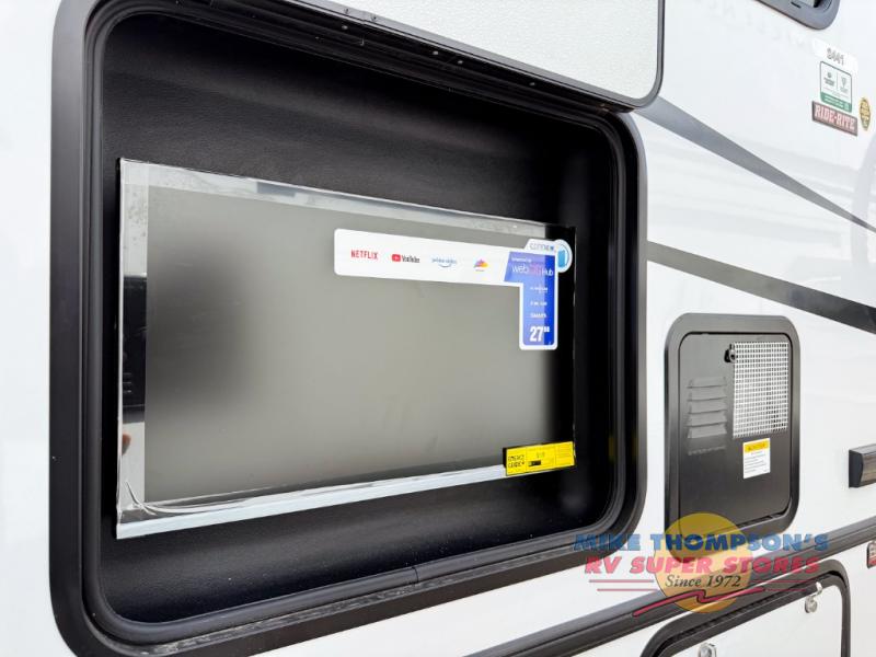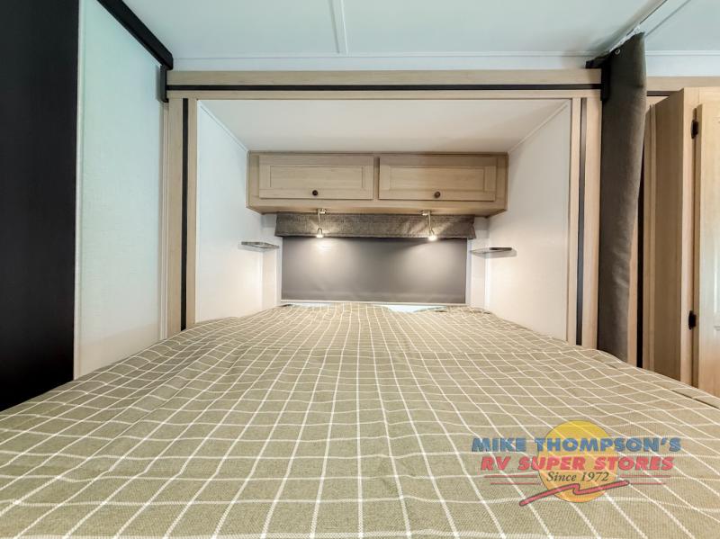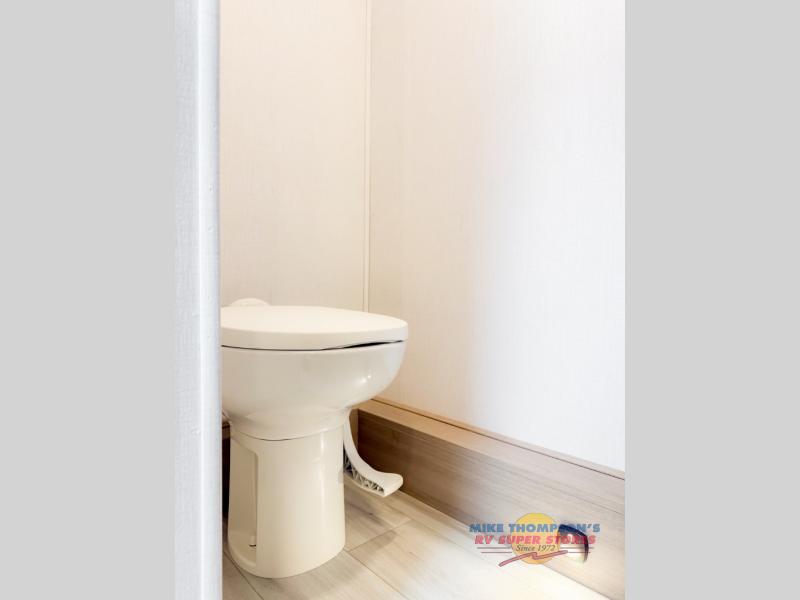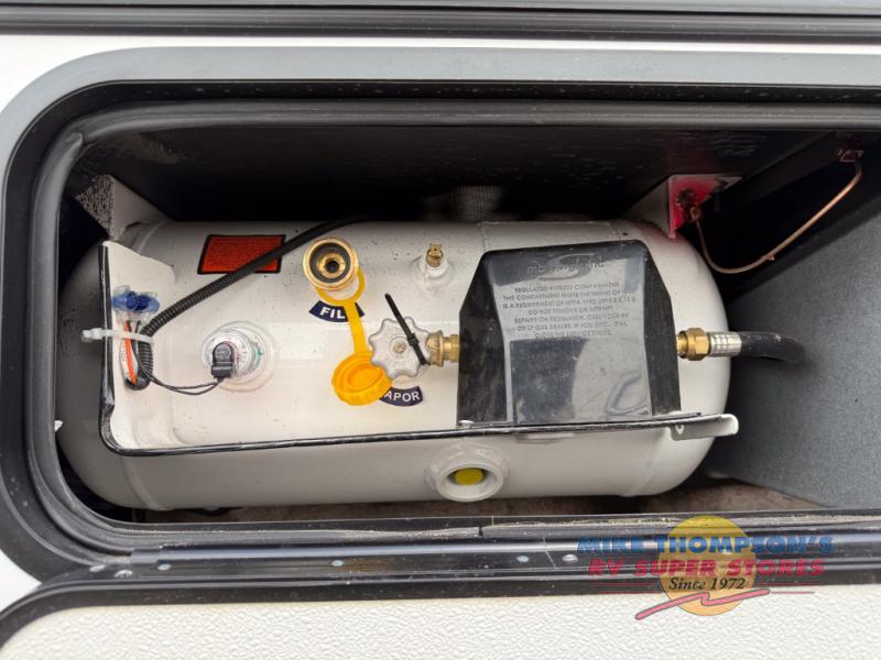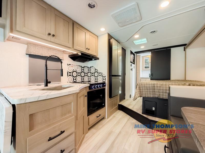 You will feel right at home traveling in this motorhome! The full rear bathroom has a 24" x 36" shower to freshen up in, plus storage space and a private toilet so you both can use this room at once. Inside the bedroom is a 60" x 74" queen bed slide with a wedge mattress for more space, and a 12V TV for movies in bed. Prepare your best meals with the three burner cooktop and the 10.7 cu. ft. 12V refrigerator or throw some leftovers in the undermount 1.3 cu. ft. convection microwave, then enjoy it at the U-shaped dinette slide. The 60" x 80" bunk over cab mat offers a comfortable place to sleep but if you don't need the extra sleeping space, you can switch it out for the optional Trekker cap with a built-in entertainment center, plus there is an optional outside 12V TV to add!