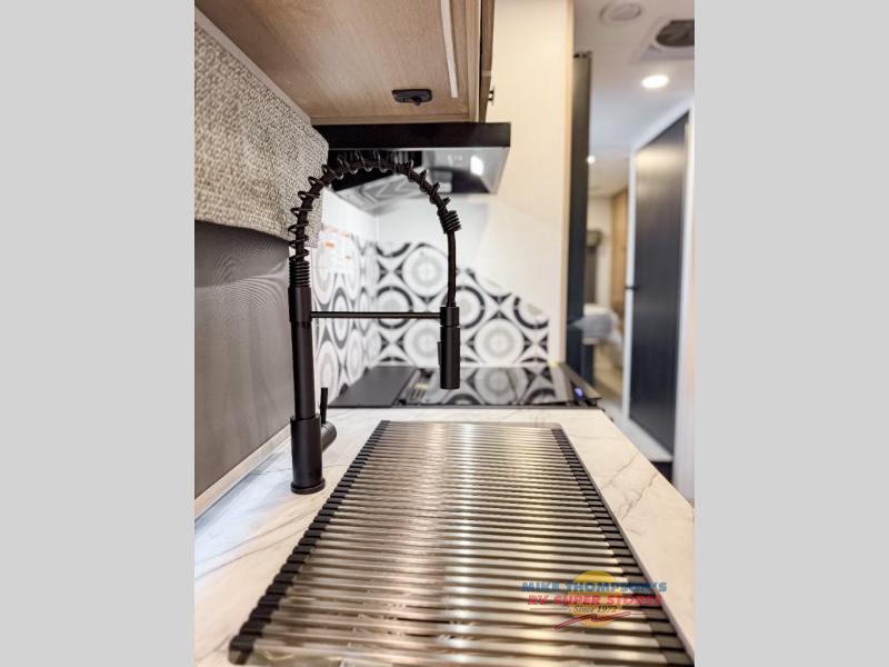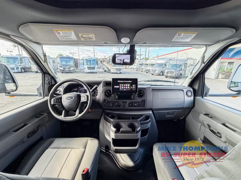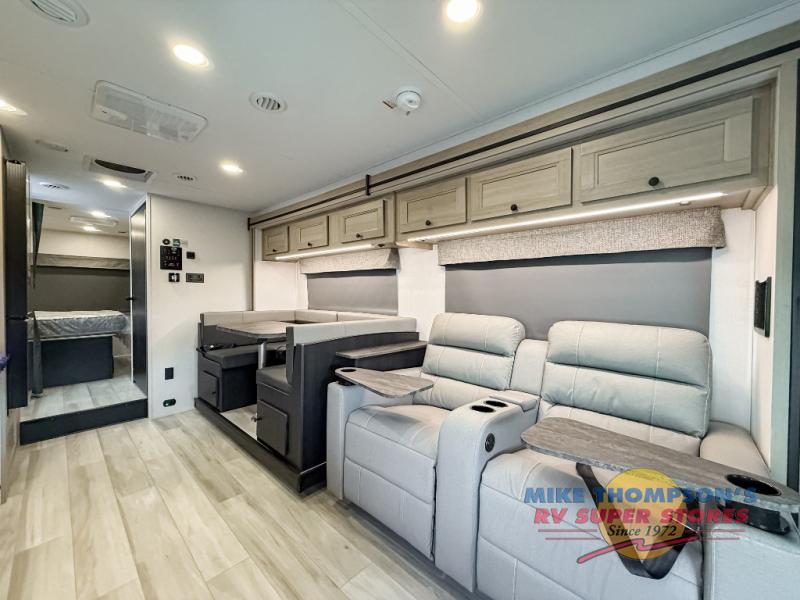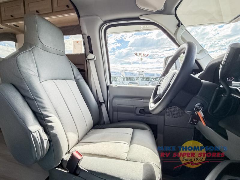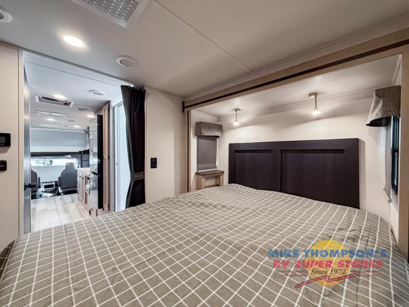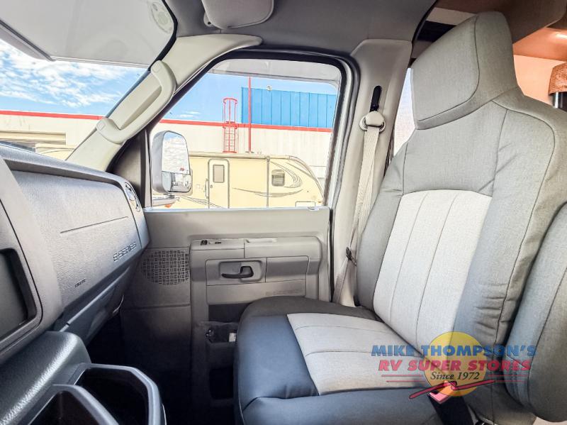 Escape the hustle and bustle of everyday life with this motorhome! It features a 60" x 80" bunk over cab mat which can be switched out for an optional Trekker cap with a built-in entertainment center. The sofa and U-shaped dinette slide offer comfortable places to enjoy meals, socialize, and even sleep once converted. Prepare your best meals with the 10.7 cu. ft. 12V refrigerator, the three burner cooktop, the flip-up countertop, and even the 1.3 cu. ft. undermount convection microwave. The separated bathroom has a 24" x 36" shower across from a toilet with a sink and countertop space, plus it leads directly into the rear private bedroom which has a 60" x 74" queen bed slide across from a linen/12V TV area with wardrobes on either side. You can even add an optional outside 12V TV and stay protected by the 15' 6" power awning!
