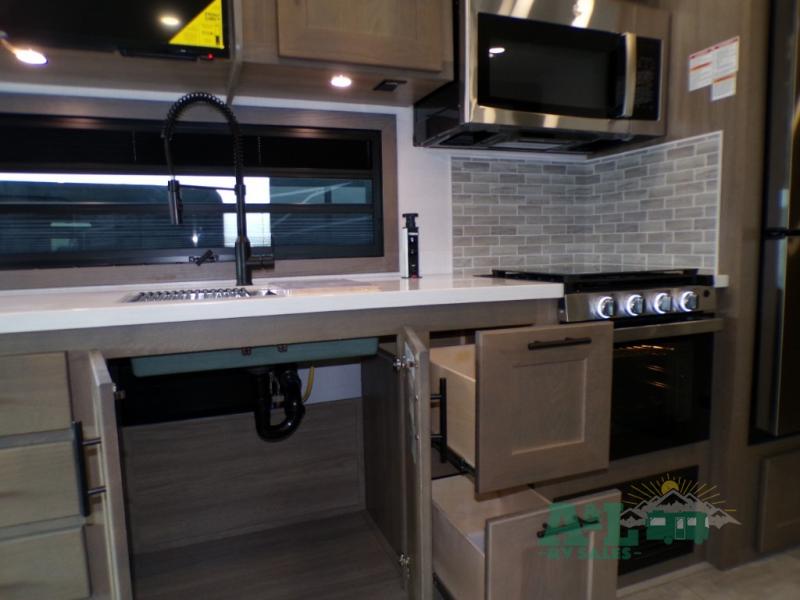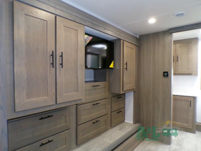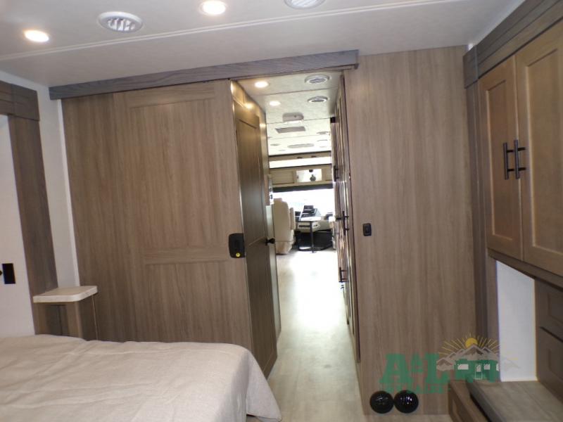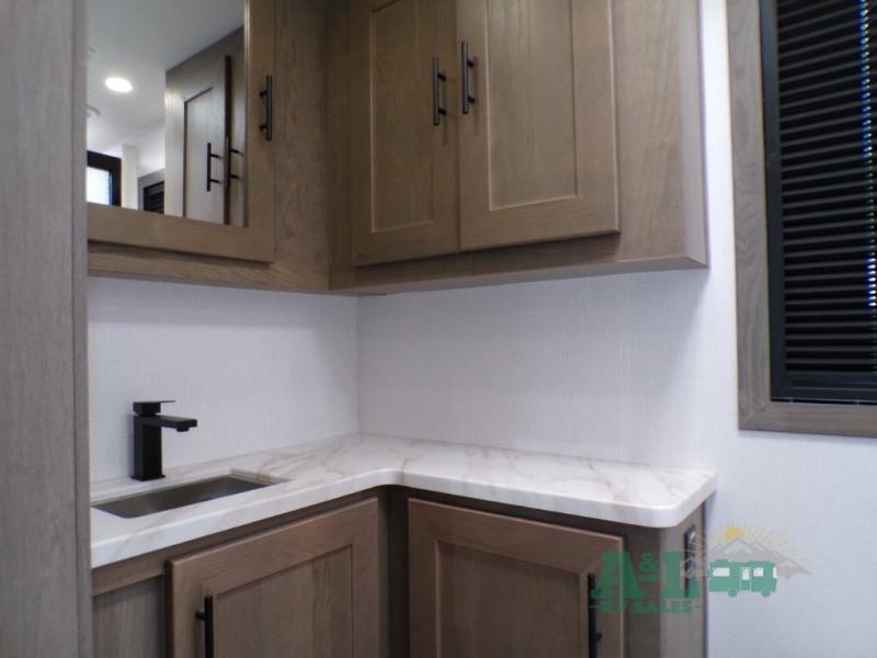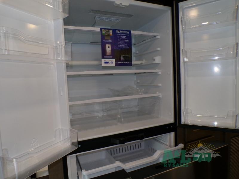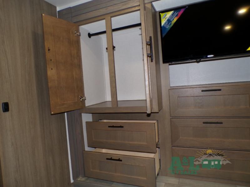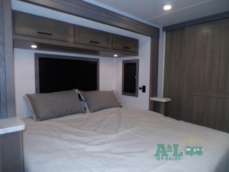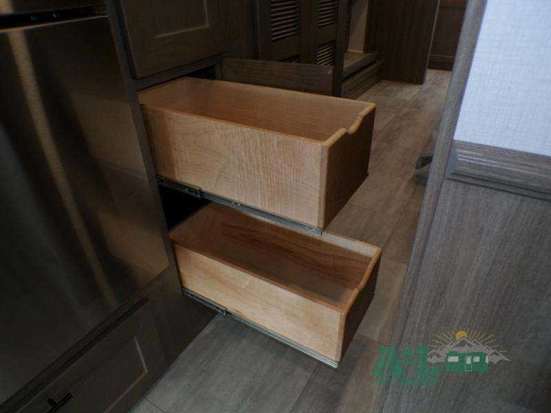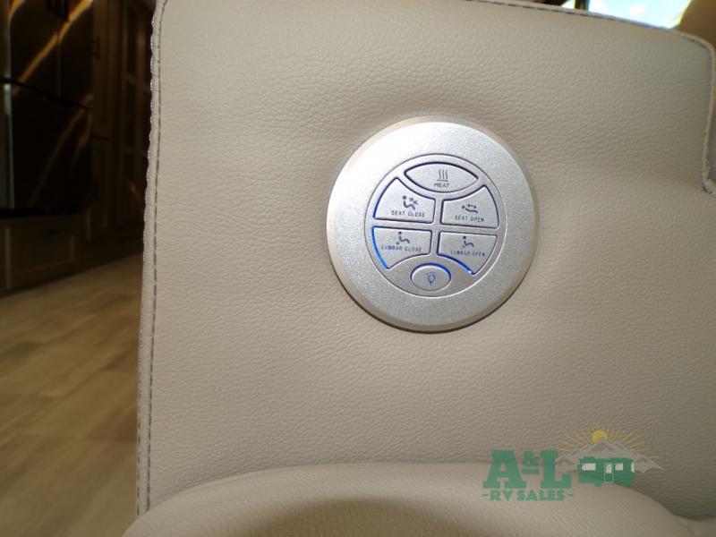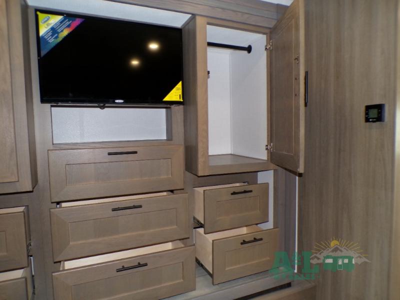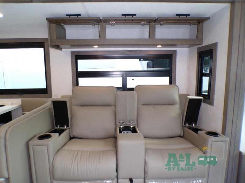 If you're looking for more space when you travel and a little more convenience, this coach may just be perfect for you! Not only will you enjoy a master bedroom with a full rear bath, but your guest will have the mid-coach half bath for easy use! A king bed slide out will provide a great night's rest each nigh, and you'll appreciate dual bedroom wardrobes to keep your clothes organized. There is also a wardrobe with stackable washer and dryer prep if you want the option to make laundry day easier. Head to the kitchen to prepare breakfast on the stainless steel three burner cooktop, or you can use the 30" residential over-the-range microwave. There is a wrap-around booth dinette where you can dine together plus 68" power theater seating across from the 32" 12V TV for easy viewing. This model also includes secure overhead storage above the cab where you can put luggage, lawn equipment, board games, and more!