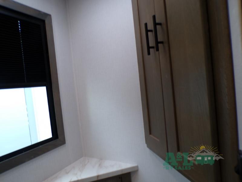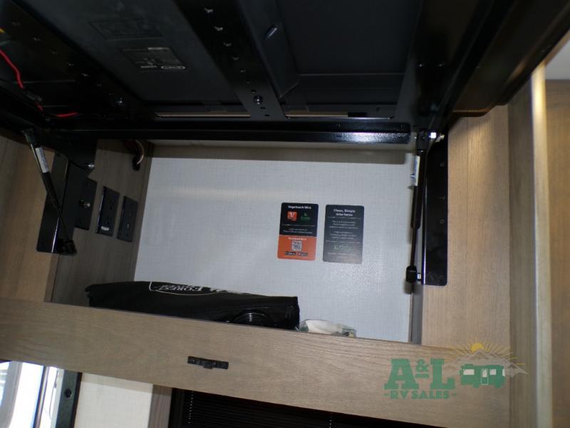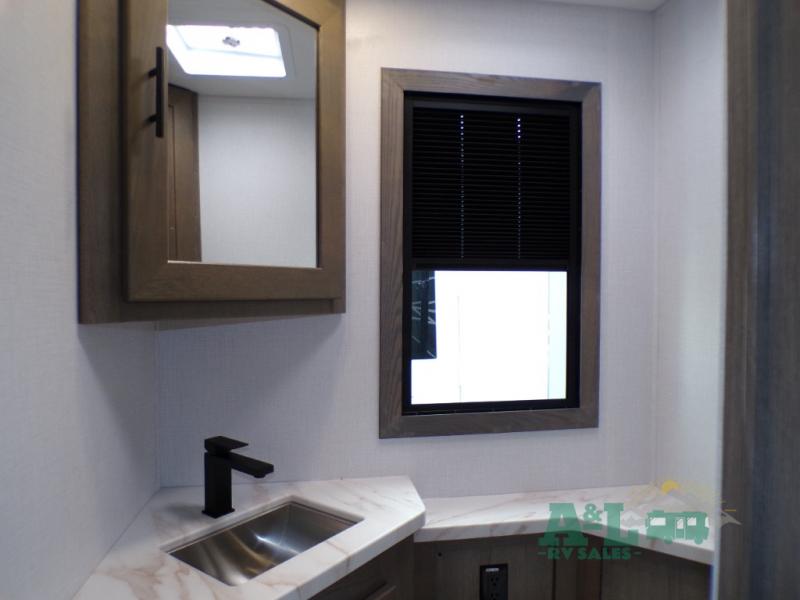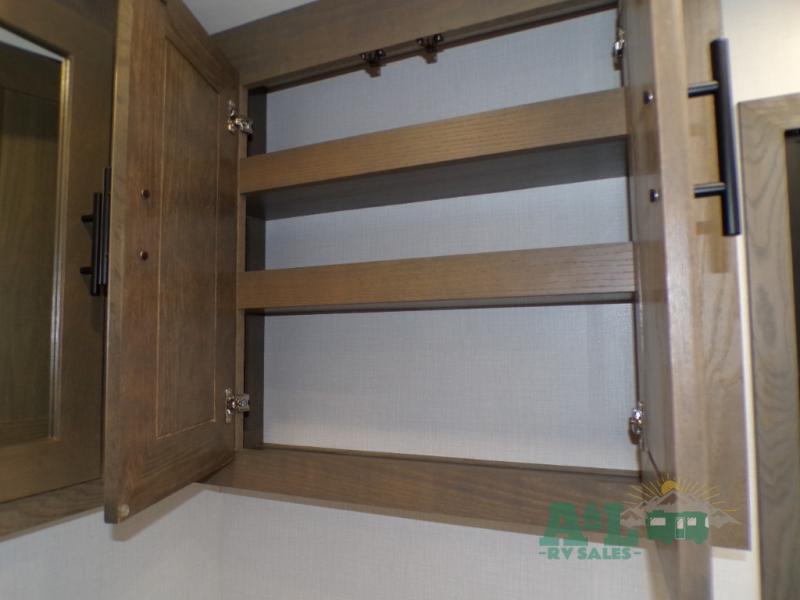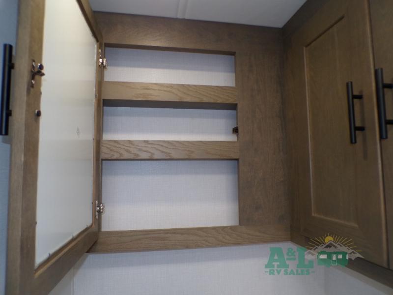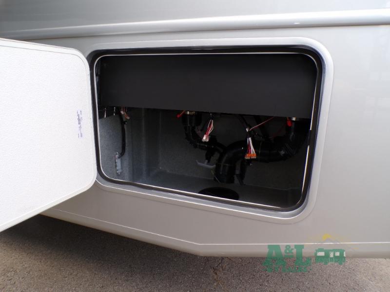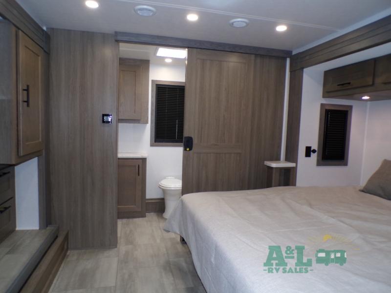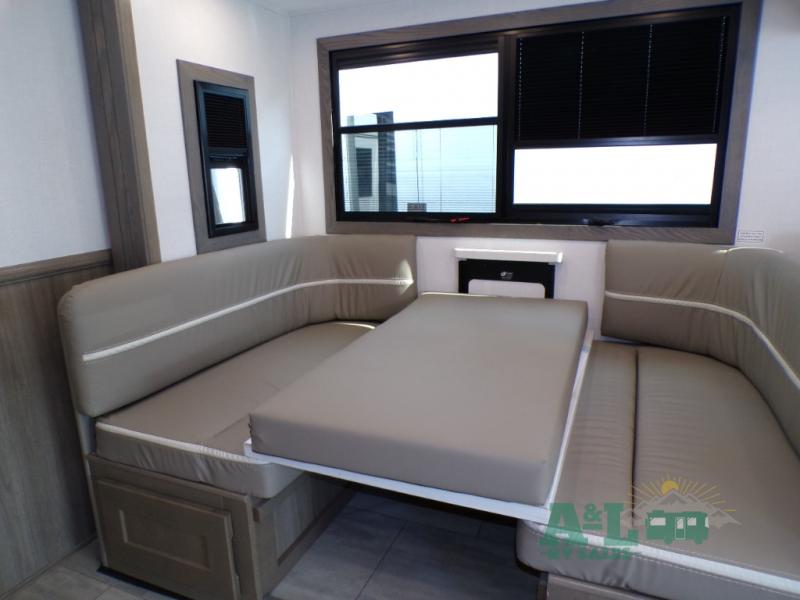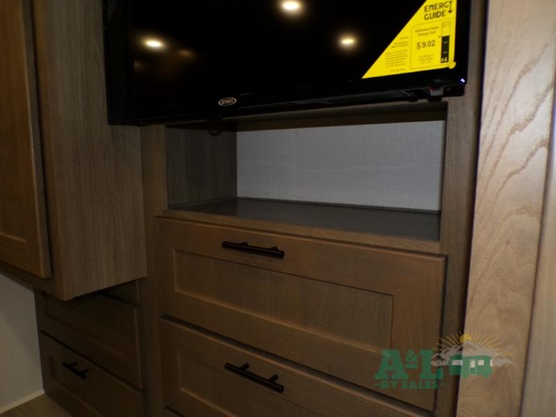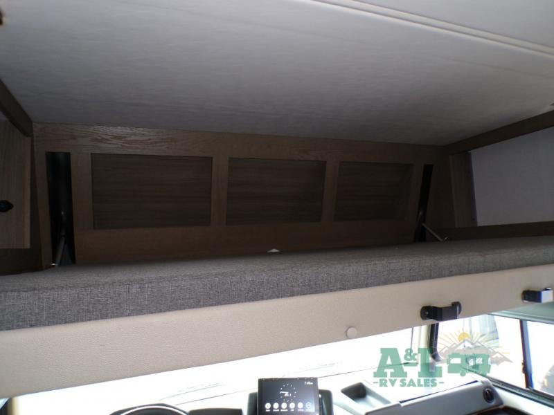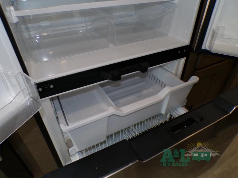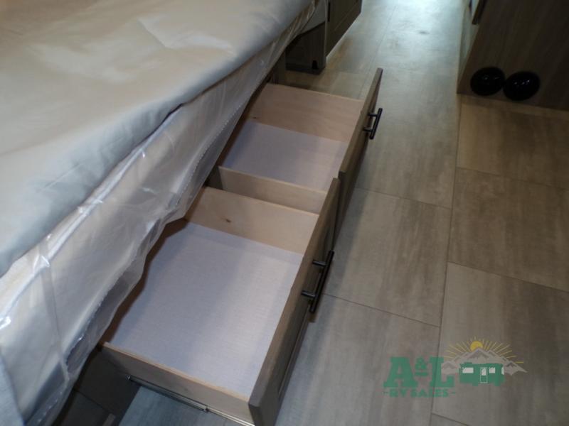 If you're looking for more space when you travel and a little more convenience, this coach may just be perfect for you! Not only will you enjoy a master bedroom with a full rear bath, but your guest will have the mid-coach half bath for easy use! A king bed slide out will provide a great night's rest each nigh, and you'll appreciate dual bedroom wardrobes to keep your clothes organized. There is also a wardrobe with stackable washer and dryer prep if you want the option to make laundry day easier. Head to the kitchen to prepare breakfast on the stainless steel three burner cooktop, or you can use the 30" residential over-the-range microwave. There is a wrap-around booth dinette where you can dine together plus 68" power theater seating across from the 32" 12V TV for easy viewing. This model also includes secure overhead storage above the cab where you can put luggage, lawn equipment, board games, and more!