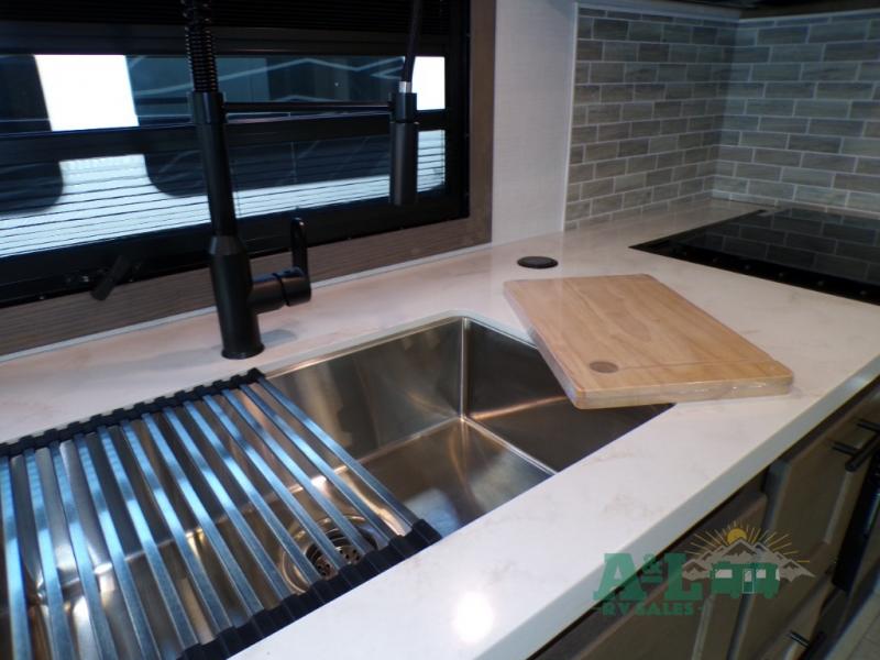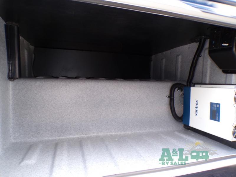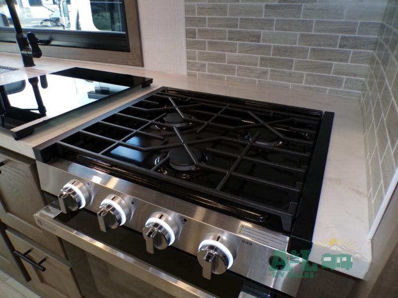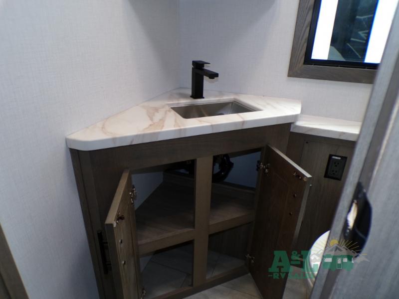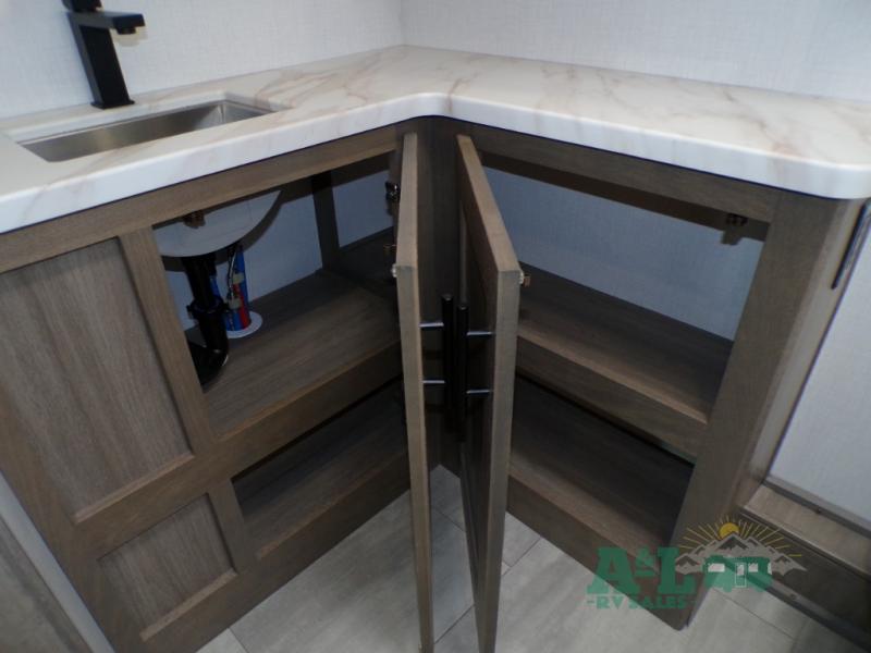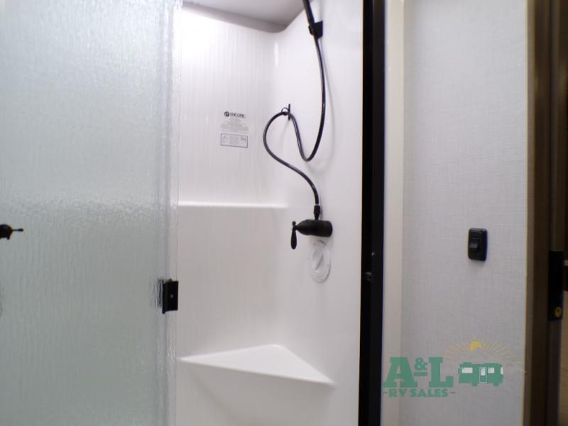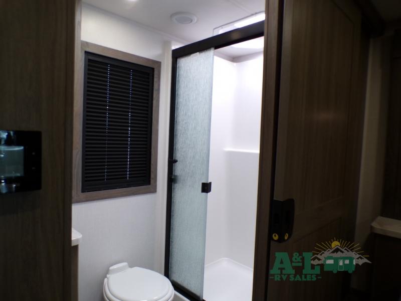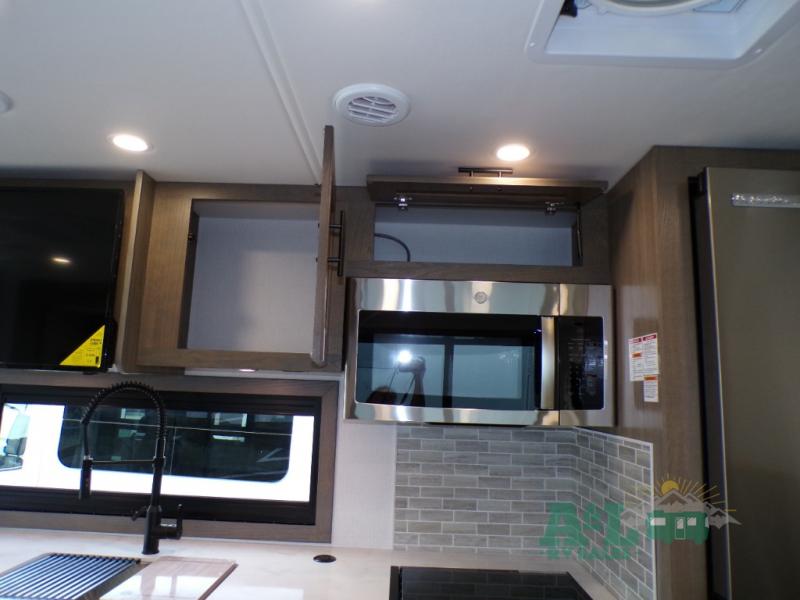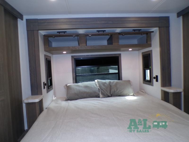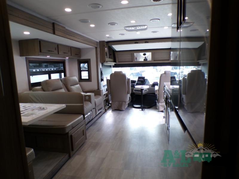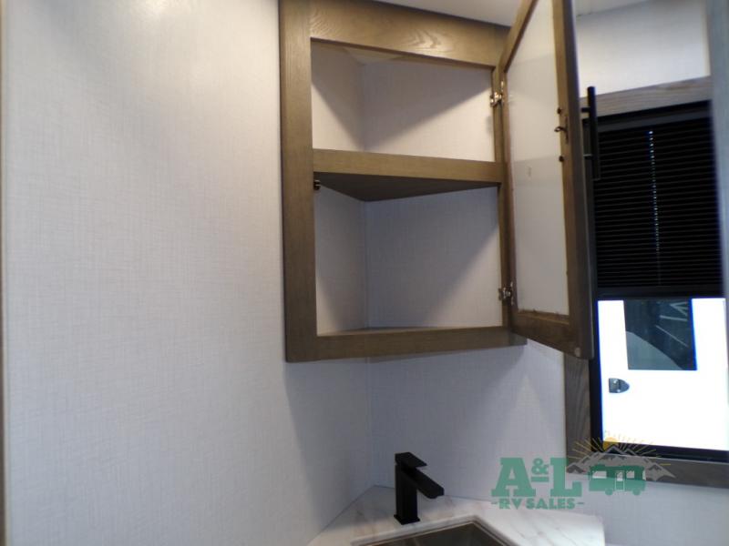 If you're looking for more space when you travel and a little more convenience, this coach may just be perfect for you! Not only will you enjoy a master bedroom with a full rear bath, but your guest will have the mid-coach half bath for easy use! A king bed slide out will provide a great night's rest each nigh, and you'll appreciate dual bedroom wardrobes to keep your clothes organized. There is also a wardrobe with stackable washer and dryer prep if you want the option to make laundry day easier. Head to the kitchen to prepare breakfast on the stainless steel three burner cooktop, or you can use the 30" residential over-the-range microwave. There is a wrap-around booth dinette where you can dine together plus 68" power theater seating across from the 32" 12V TV for easy viewing. This model also includes secure overhead storage above the cab where you can put luggage, lawn equipment, board games, and more!