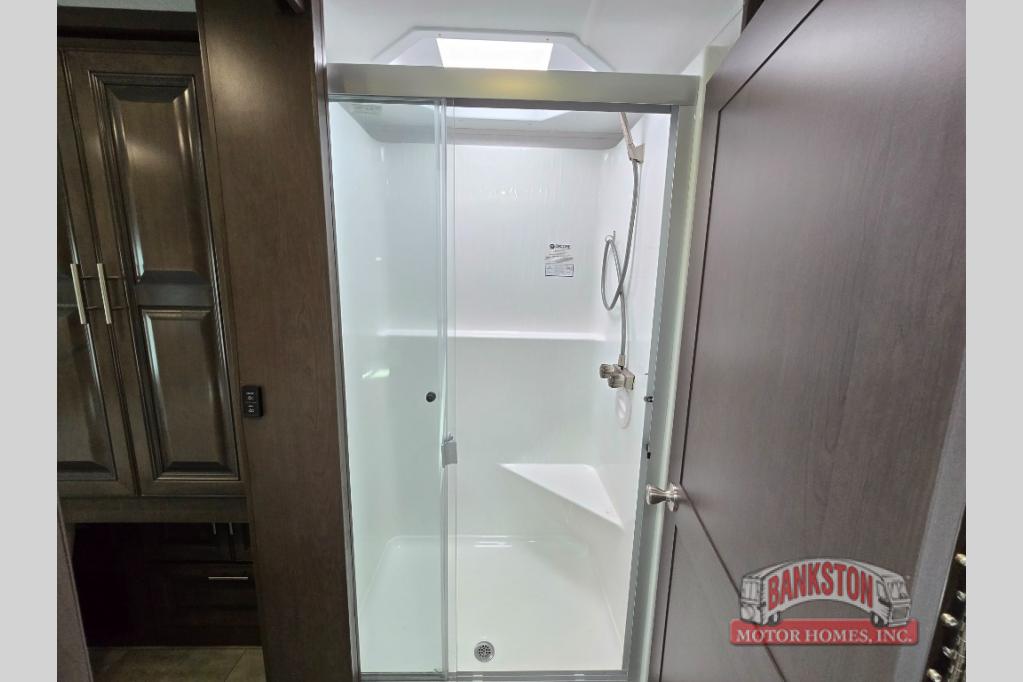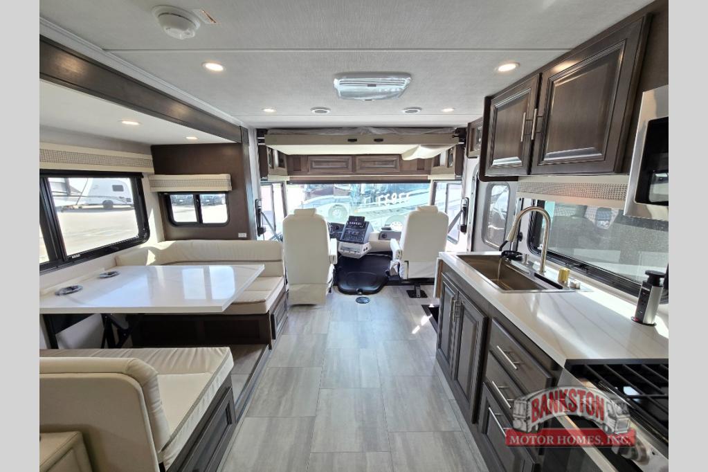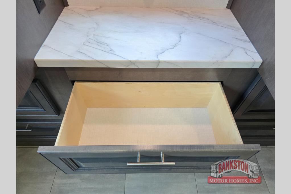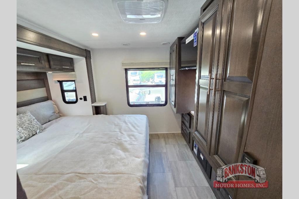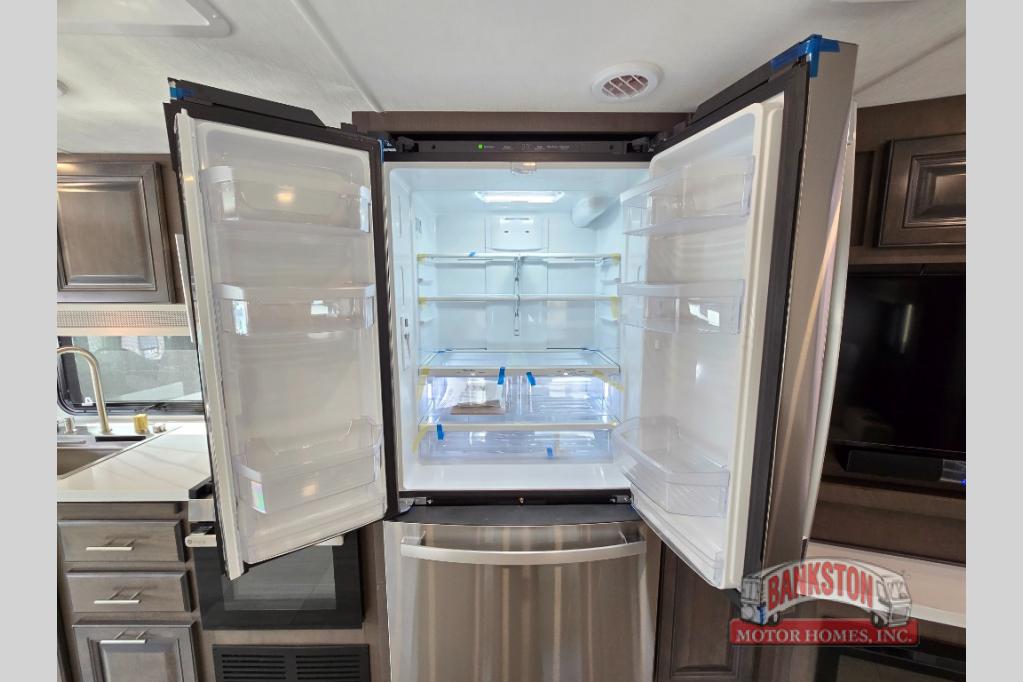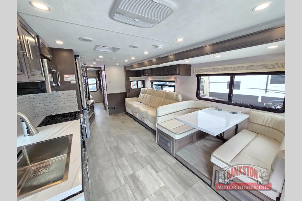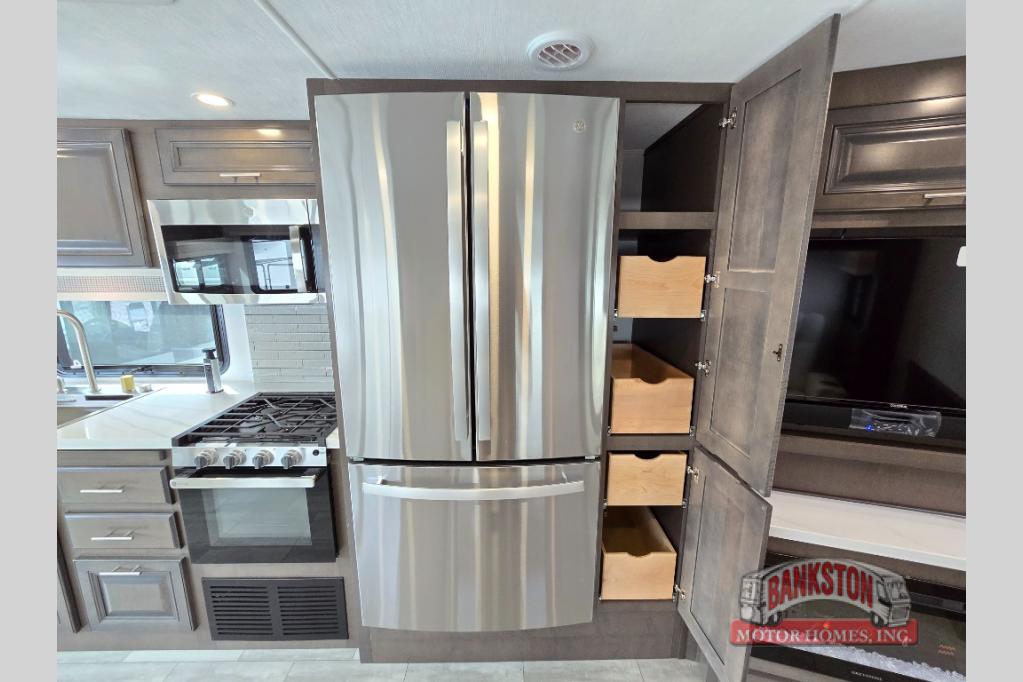 You will love the spacious living entertainment in this motorhome! There is a Thomas Payne 4-person theater seating that reclines with adjustable headrests, heat, massage and has pop-up 110V outlets. There is also a 5,000 BTU fireplace with a 40" LED TV to watch your favorite movies in true comfort. The kitchen has everything you need to prepare your best home cooked meals including a brush nickel designer faucet with a pull out spray wand for easy clean up, and you can enjoy all of your meals at the Dream Dinette. You will appreciate having your own private retreat with the rear bedroom which has a 72" x 80" king bed slide across from a dresser with a 32"  LED TV, a wardrobe on one side, and another wardrobe on the other with an optional combo washer and dryer. There is also a power front overhead bunk for more sleeping space!