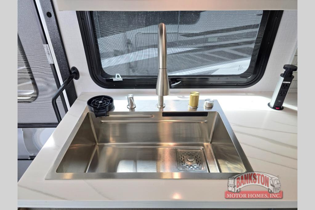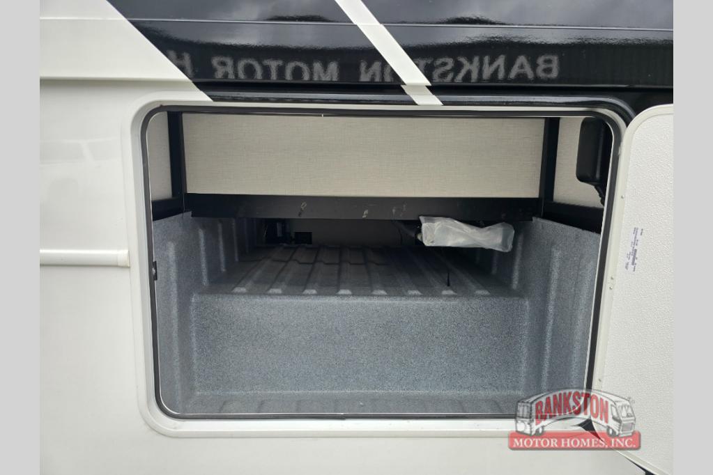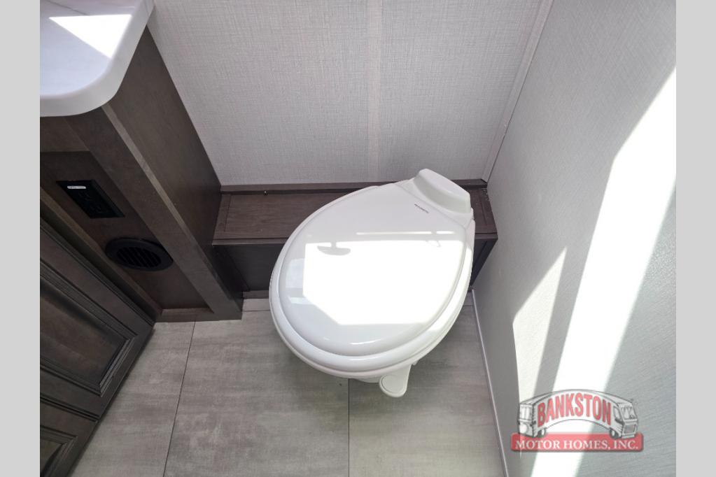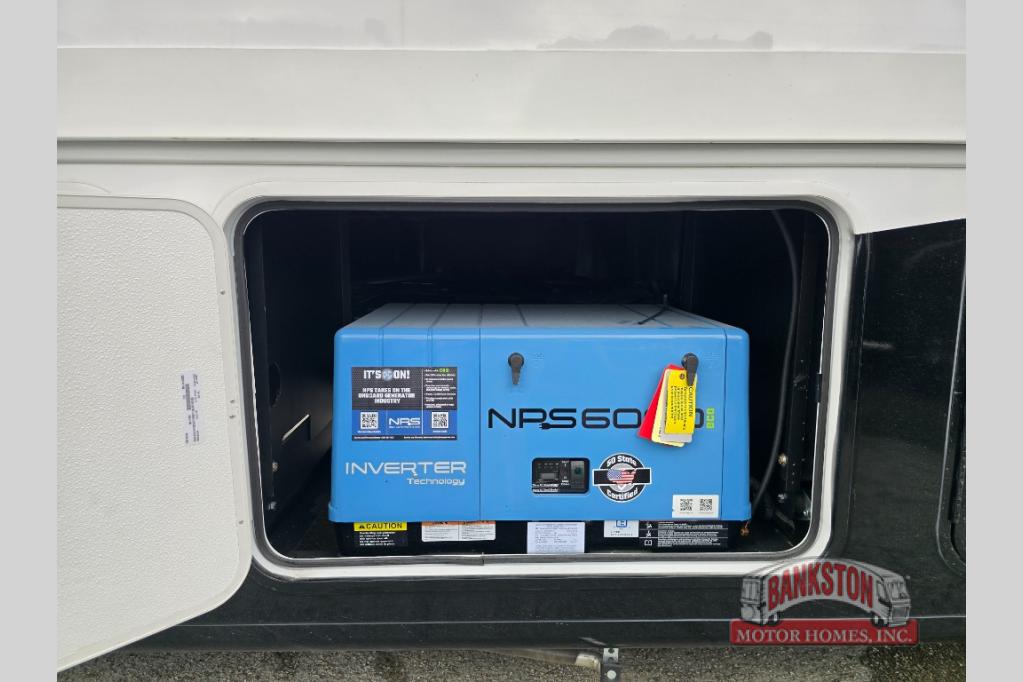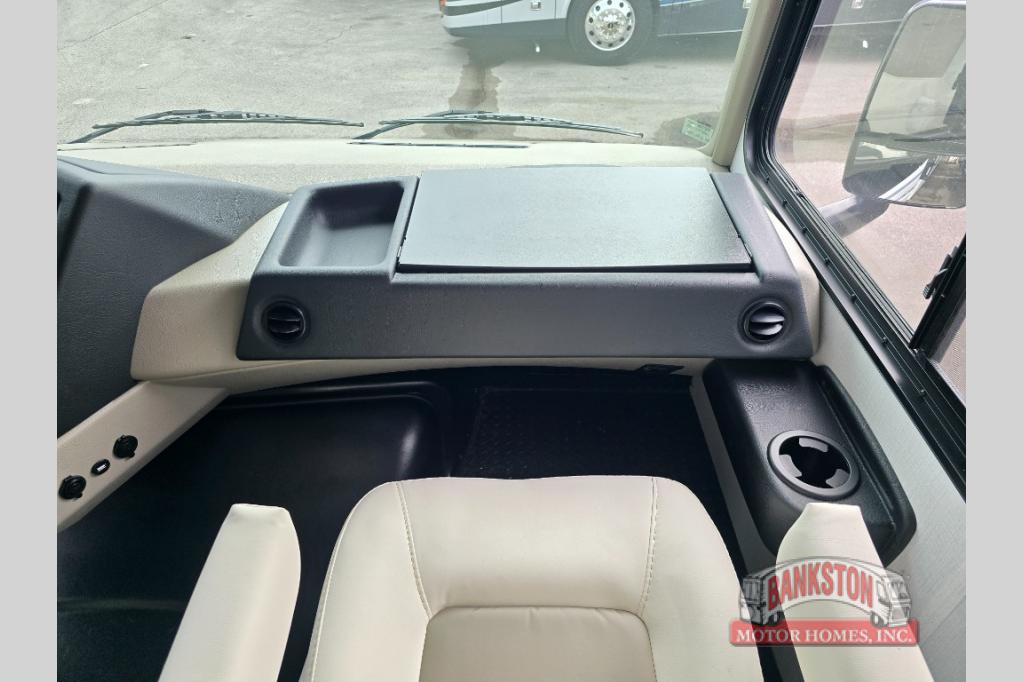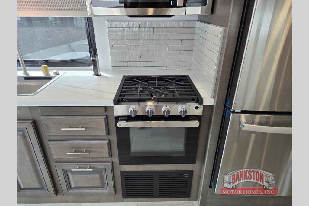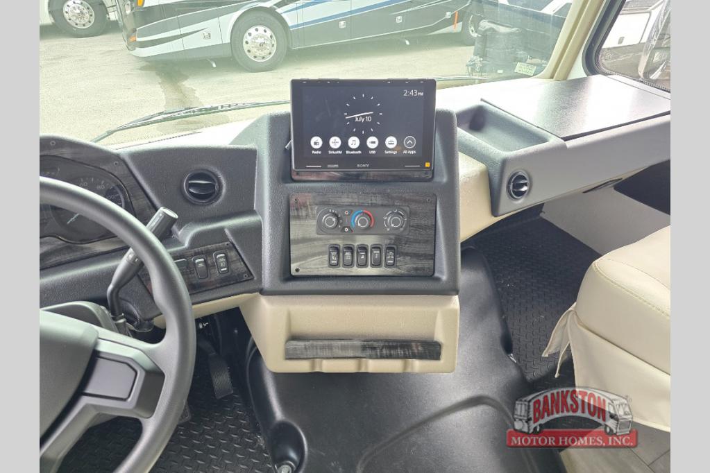 You will love the spacious living entertainment in this motorhome! There is a Thomas Payne 4-person theater seating that reclines with adjustable headrests, heat, massage and has pop-up 110V outlets. There is also a 5,000 BTU fireplace with a 40" LED TV to watch your favorite movies in true comfort. The kitchen has everything you need to prepare your best home cooked meals including a brush nickel designer faucet with a pull out spray wand for easy clean up, and you can enjoy all of your meals at the Dream Dinette. You will appreciate having your own private retreat with the rear bedroom which has a 72" x 80" king bed slide across from a dresser with a 32"  LED TV, a wardrobe on one side, and another wardrobe on the other with an optional combo washer and dryer. There is also a power front overhead bunk for more sleeping space!