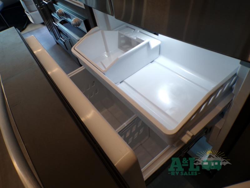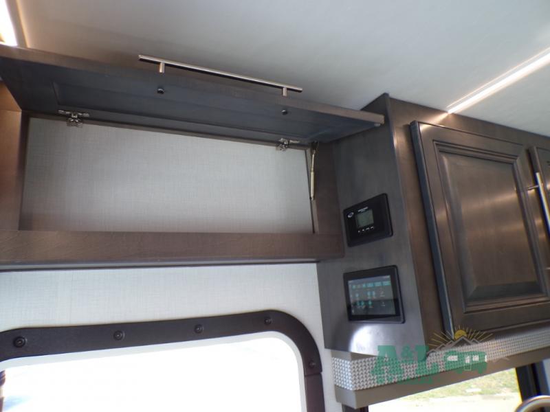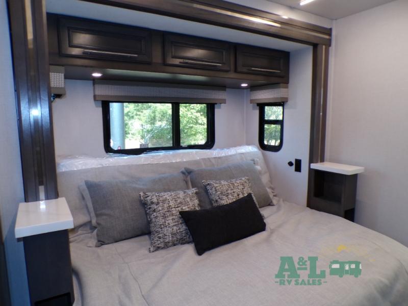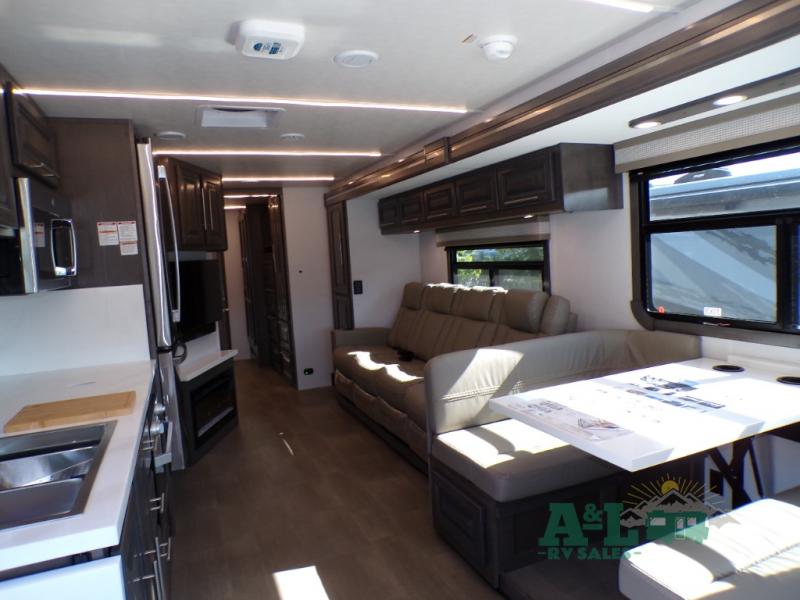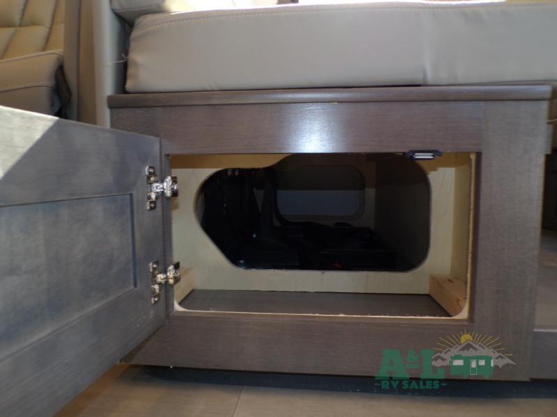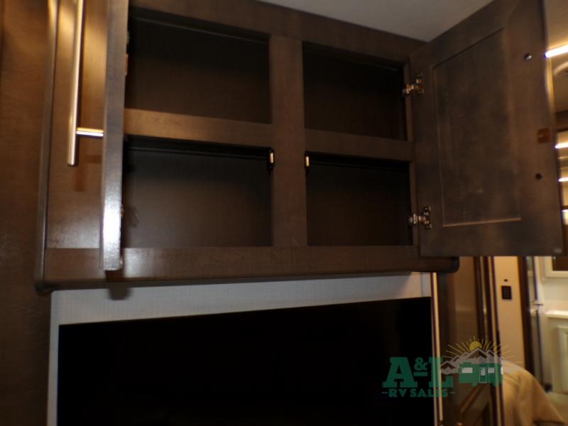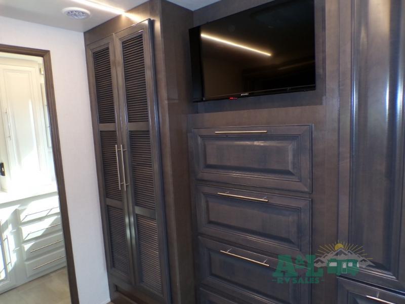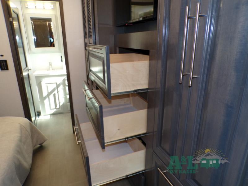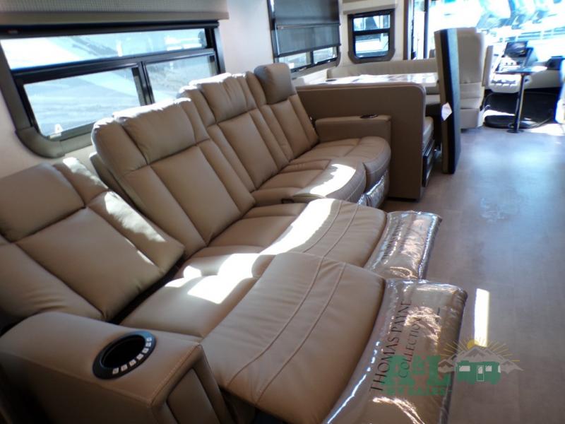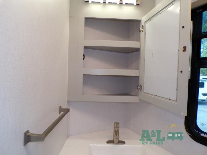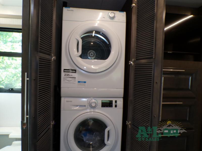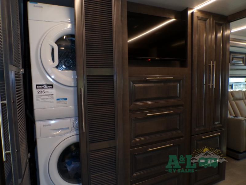 Comfort and convenience are found all throughout this motorhome! Starting with the full rear master bath that has a shower with a seat and a dual sink vanity, plus it leads into the private bedroom. Inside the bedroom is a 72" x 80" king bed slide with overhead cabinets across from a dresser with overhead cabinets and a 32" LED TV, a wardrobe, and another wardrobe that is prepped to add an optional stackable washer and dryer. The half bathroom is conveniently near the fully equipped kitchen so you can get back to creating your best home cooked meals fast. Relax in true comfort each night by either playing games at the booth dinette or on the theater seating that comes with power recline, heat, and massage!