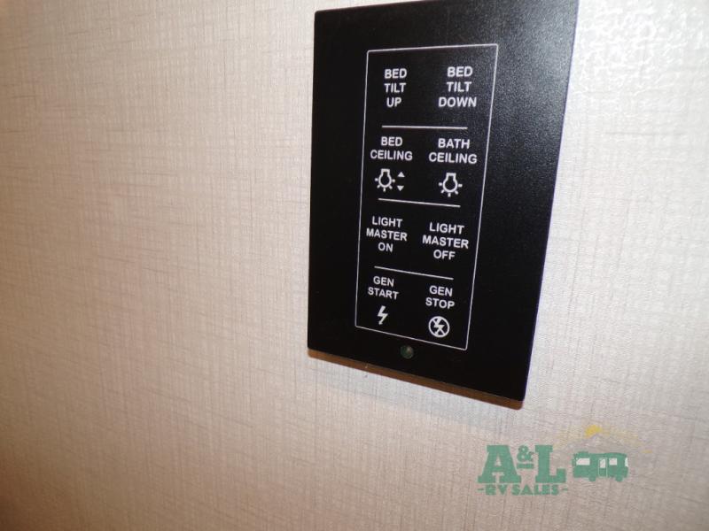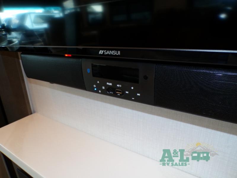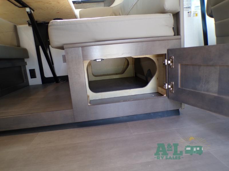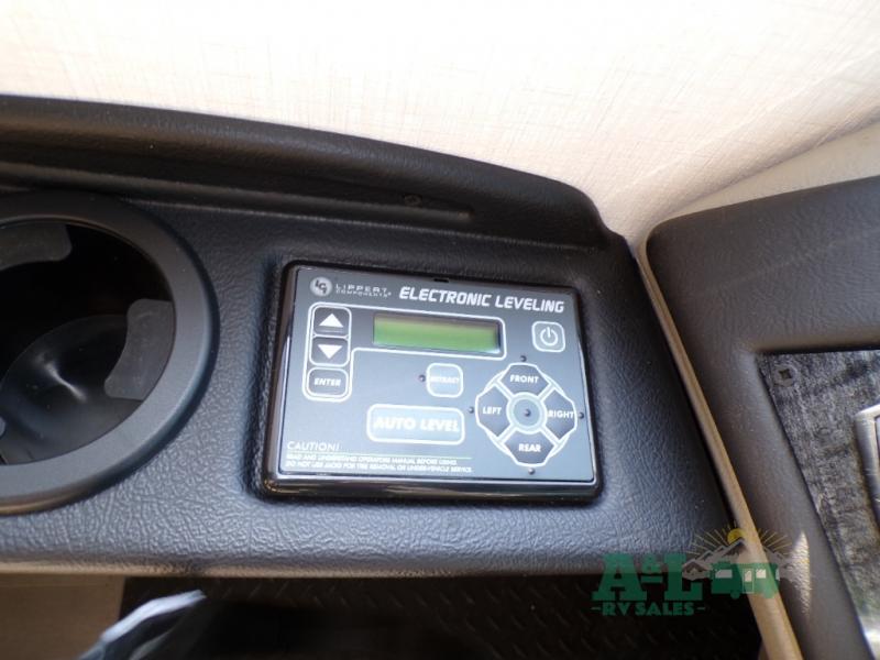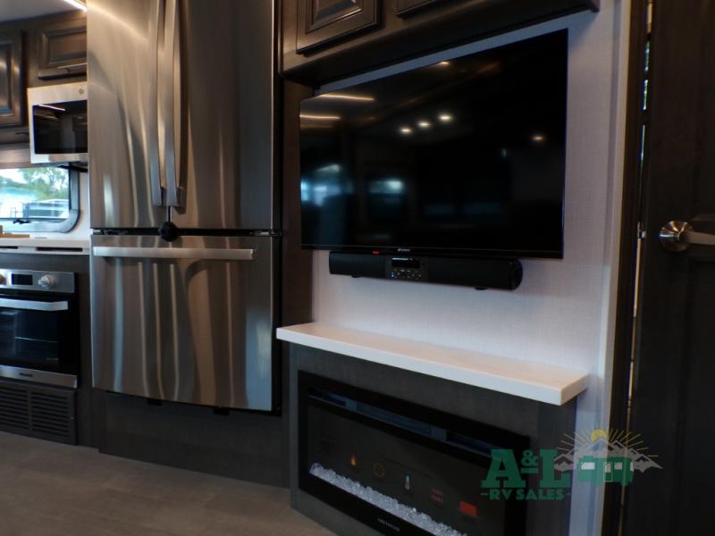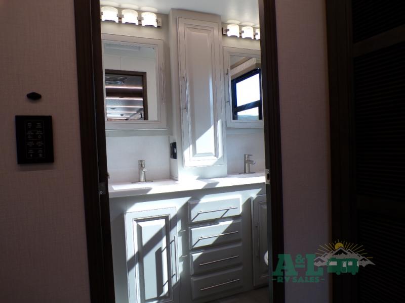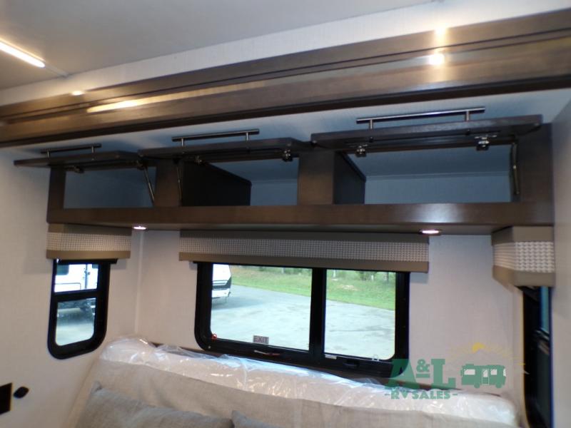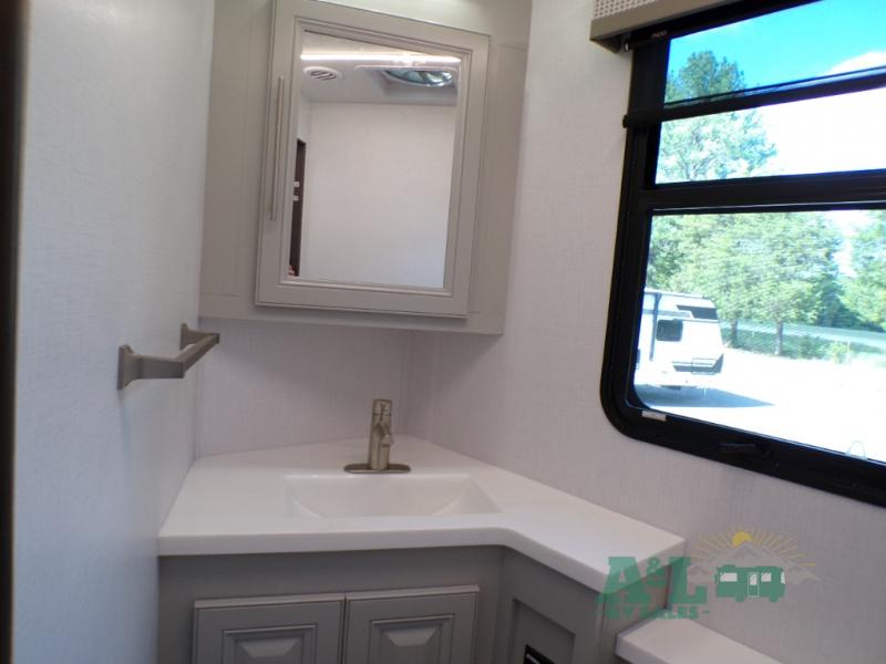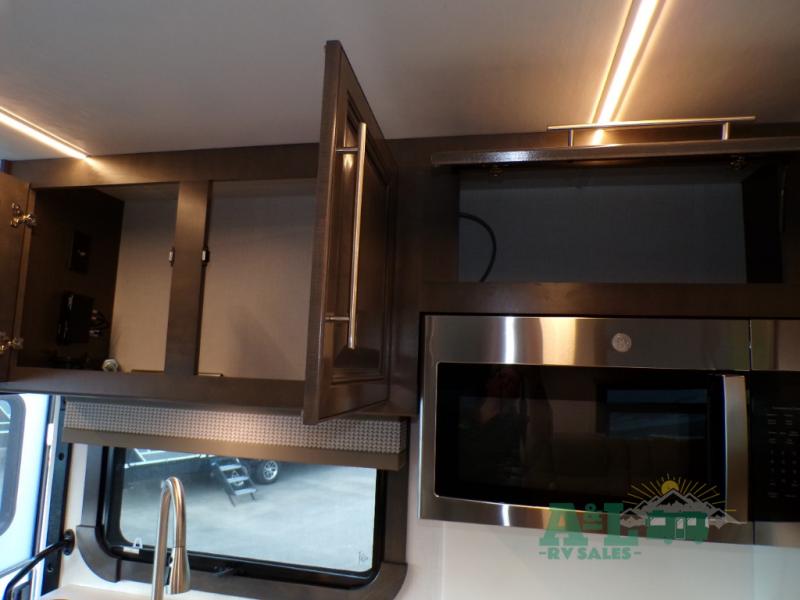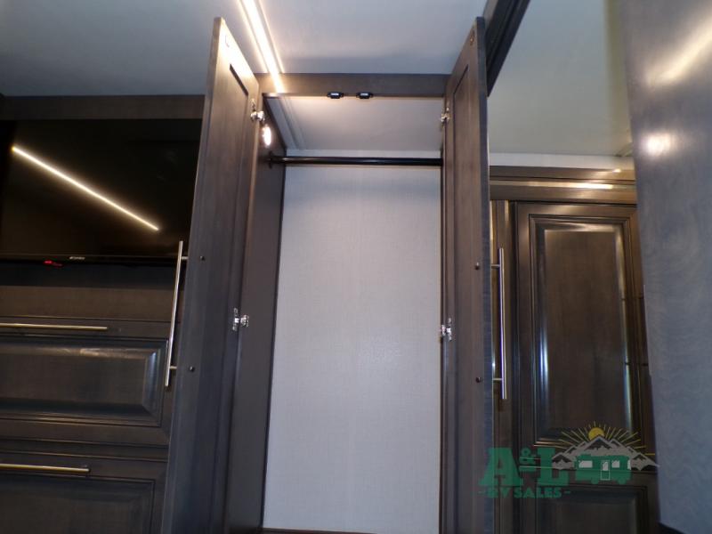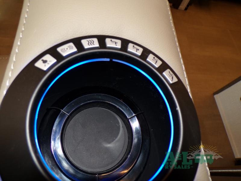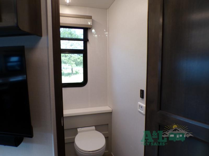 Comfort and convenience are found all throughout this motorhome! Starting with the full rear master bath that has a shower with a seat and a dual sink vanity, plus it leads into the private bedroom. Inside the bedroom is a 72" x 80" king bed slide with overhead cabinets across from a dresser with overhead cabinets and a 32" LED TV, a wardrobe, and another wardrobe that is prepped to add an optional stackable washer and dryer. The half bathroom is conveniently near the fully equipped kitchen so you can get back to creating your best home cooked meals fast. Relax in true comfort each night by either playing games at the booth dinette or on the theater seating that comes with power recline, heat, and massage!